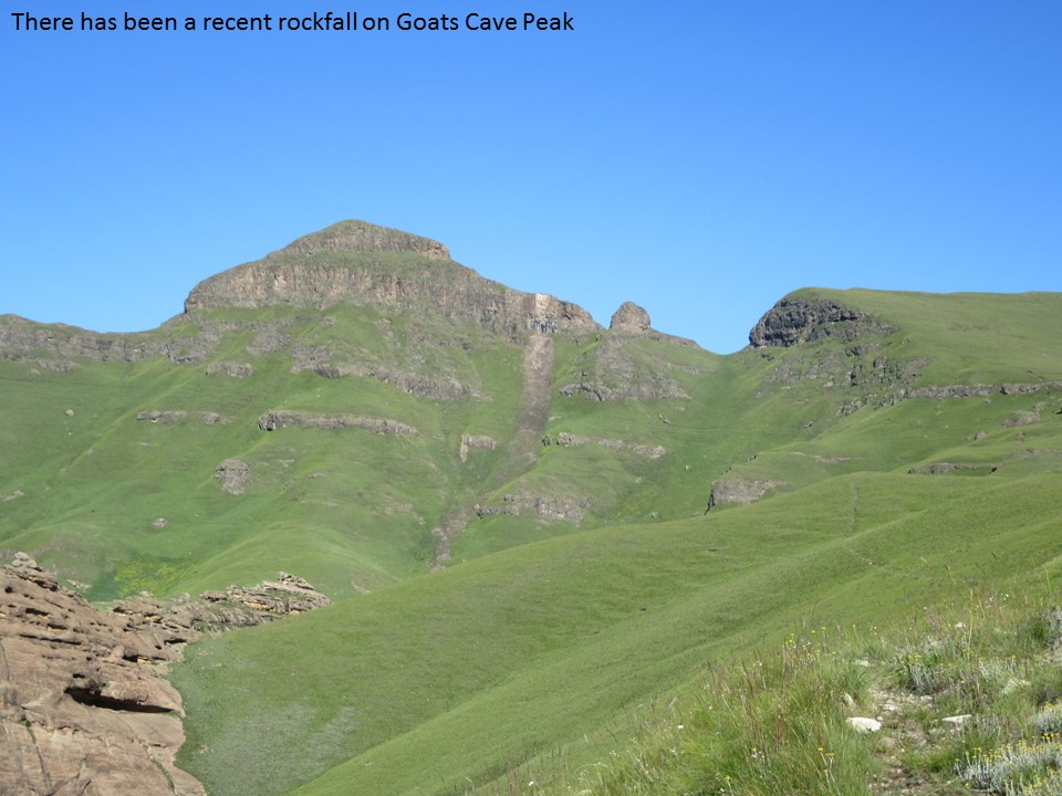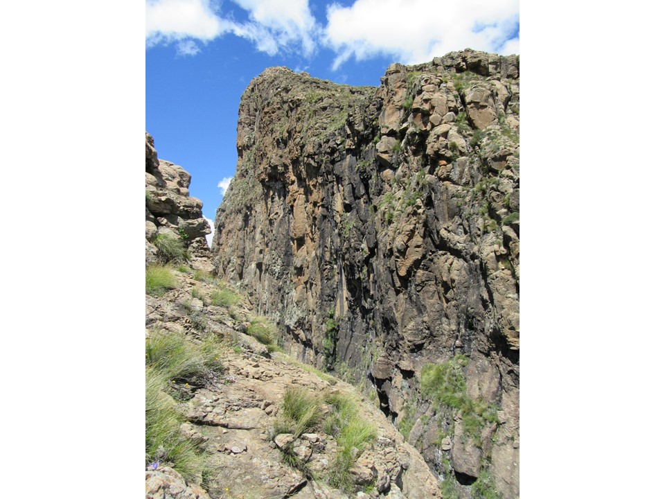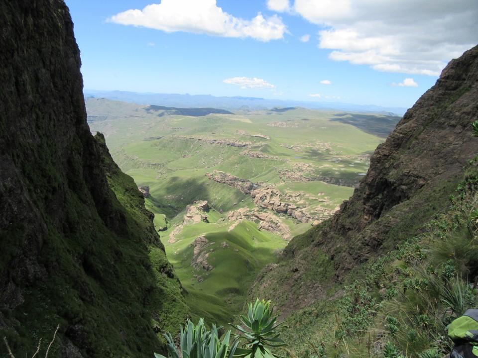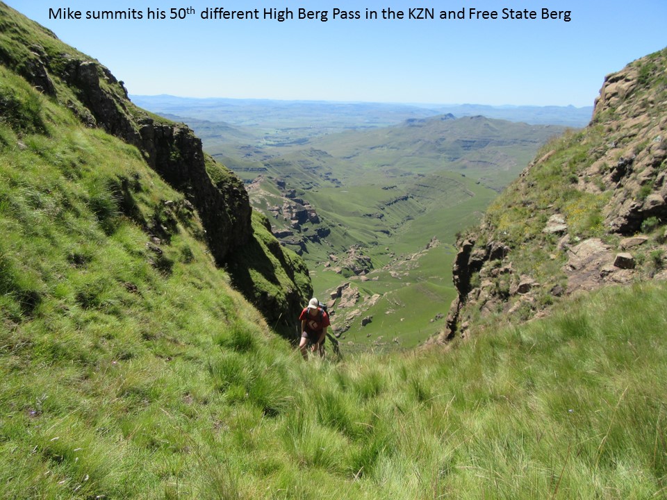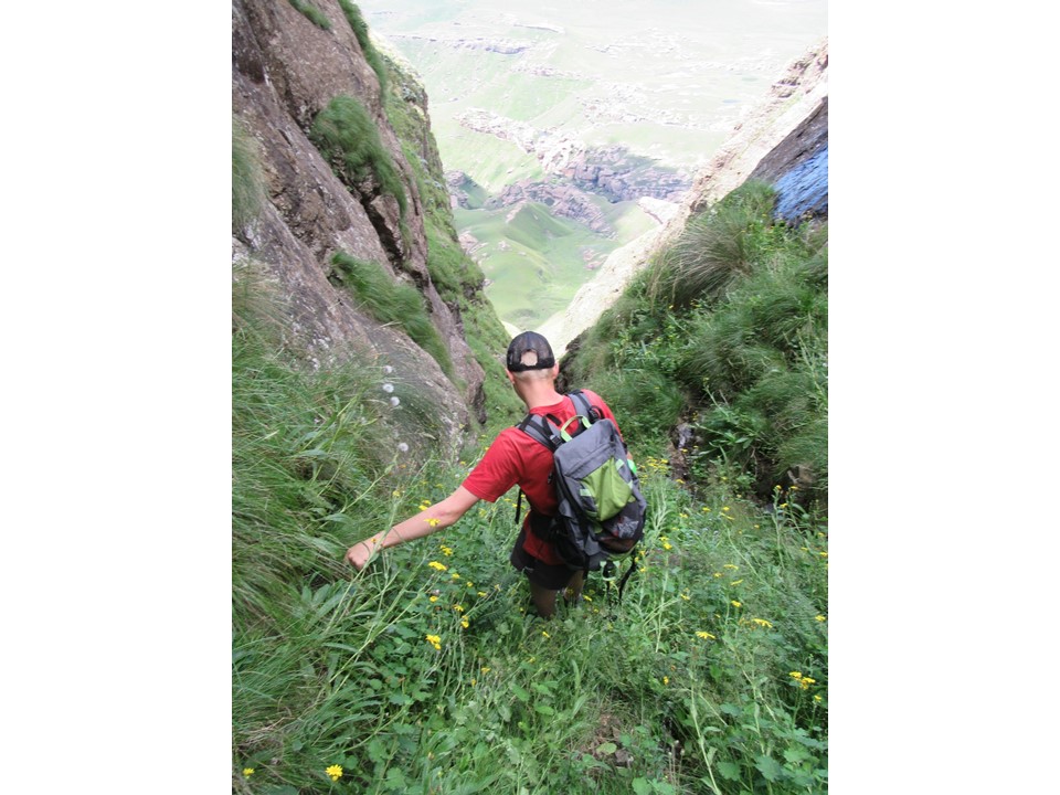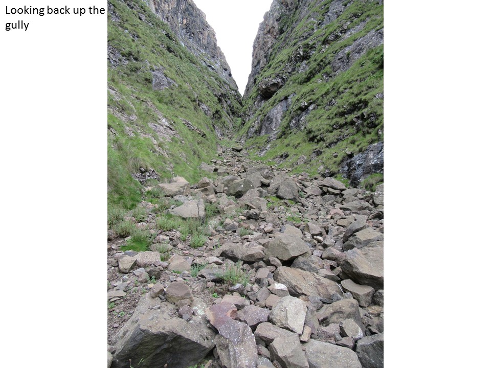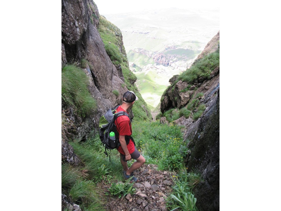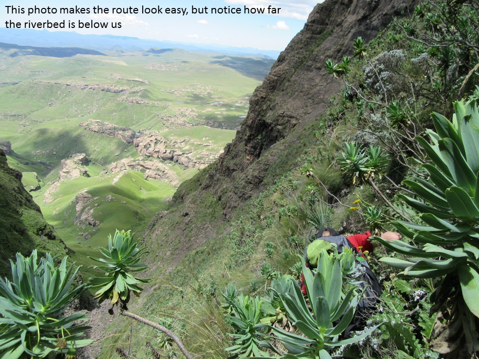 If we had carried a rope, there was a decent anchor above the drop, and we could have ab-ed down it, but looking at it from below, our route through this section was the only way that seems to go. I am guessing that a rock-fall, washout or something of the sort has rendered this pass impassable. I guess, we did get down this pass without any technical gear, so strictly speaking it is a pass – but unless you are dead-set on bagging every pass in the Berg, I would suggest that this pass is best left alone. It was easily the scariest pass I have done, and has so many genuine dangers – it is narrow and exposed to rockfalls, a flash flood would be difficult to dodge, and the bypass could easily end in a fall of consequence.