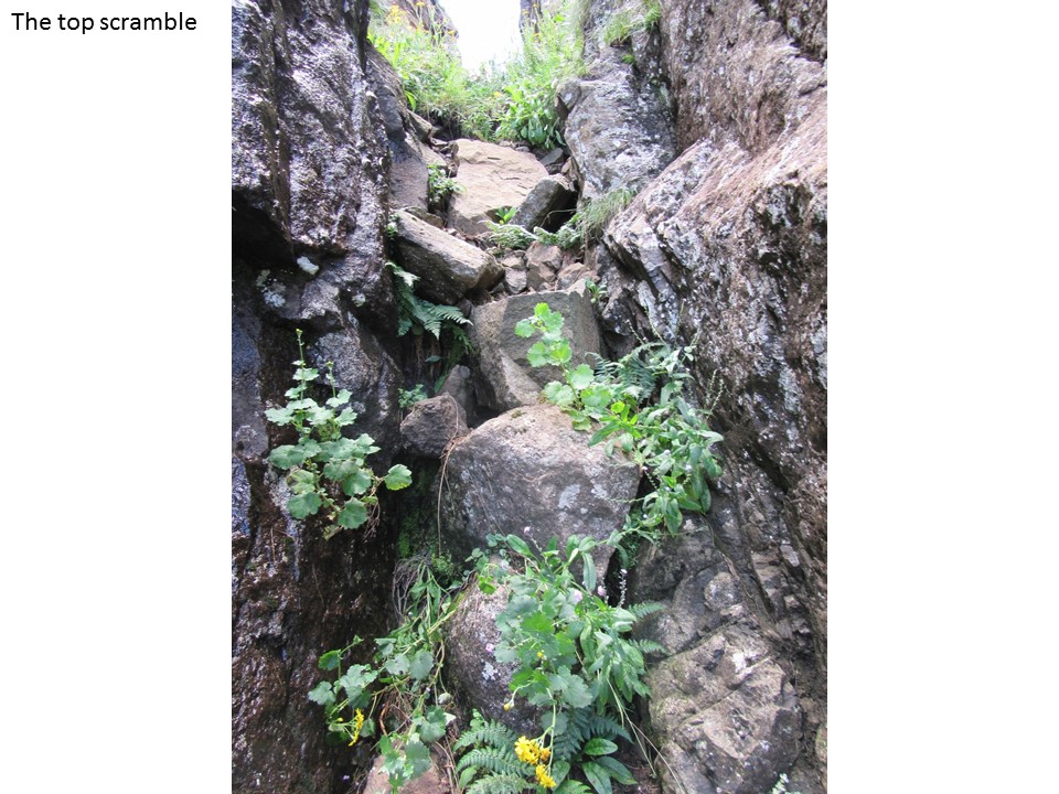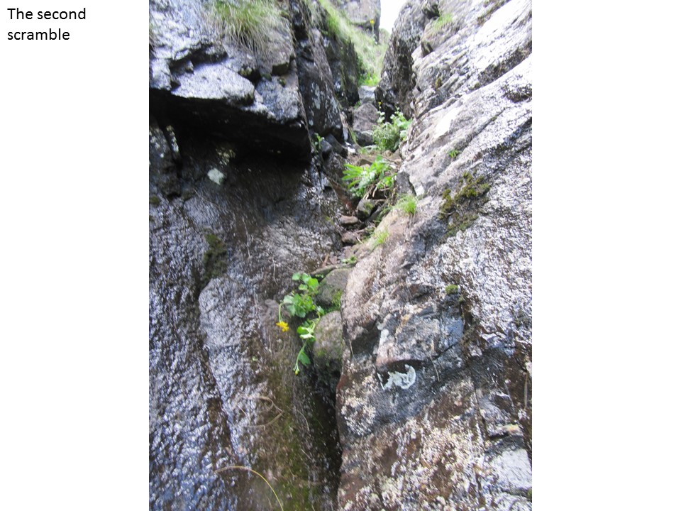 The top of the pass was very wet and the scree was very loose. The first scramble was quite easy, although very wet, and some of the rocks were loose. The second scramble was similarly wet and loose. And then came the third scramble…