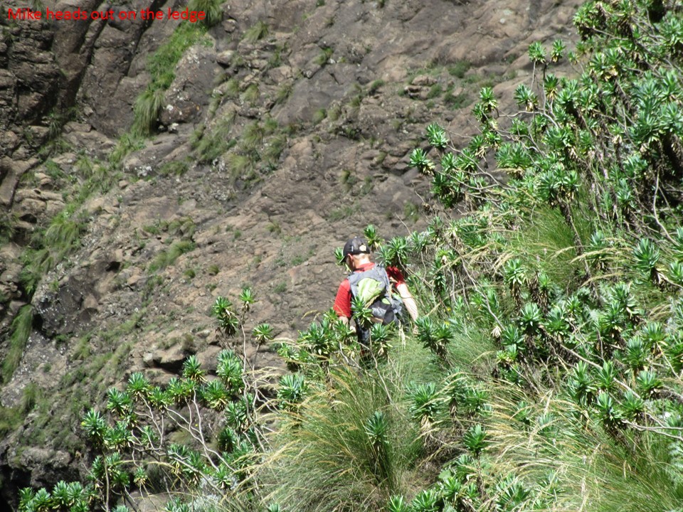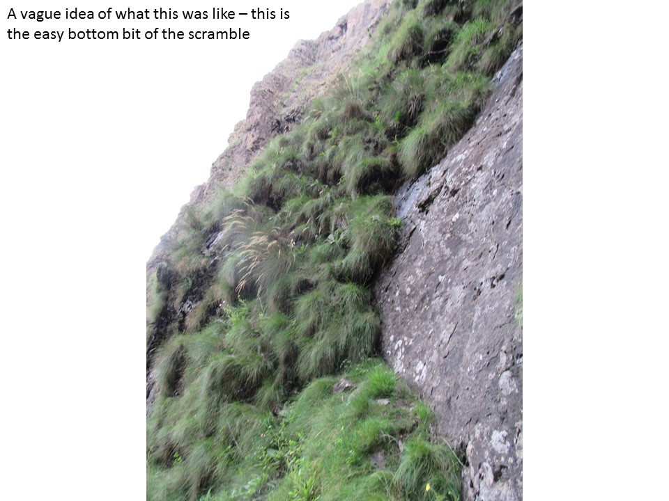 The first section of the traverse was hairy, with spots where a fall could end below the chock-stone. The route choices often were a selection between wet rock and loose grassy ledges. Fortunately there was no shortage of bushes to grab onto – and only half of them were covered in thorns…