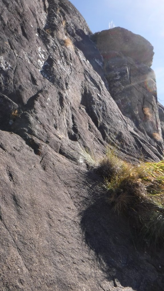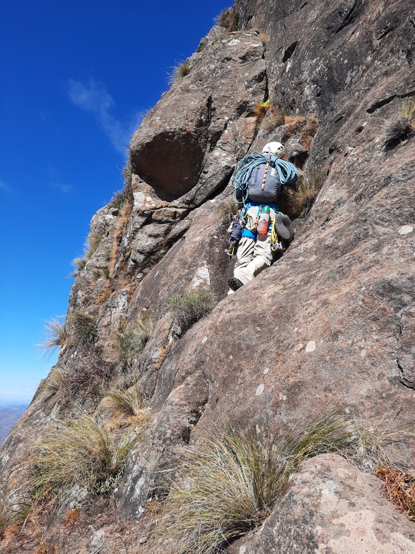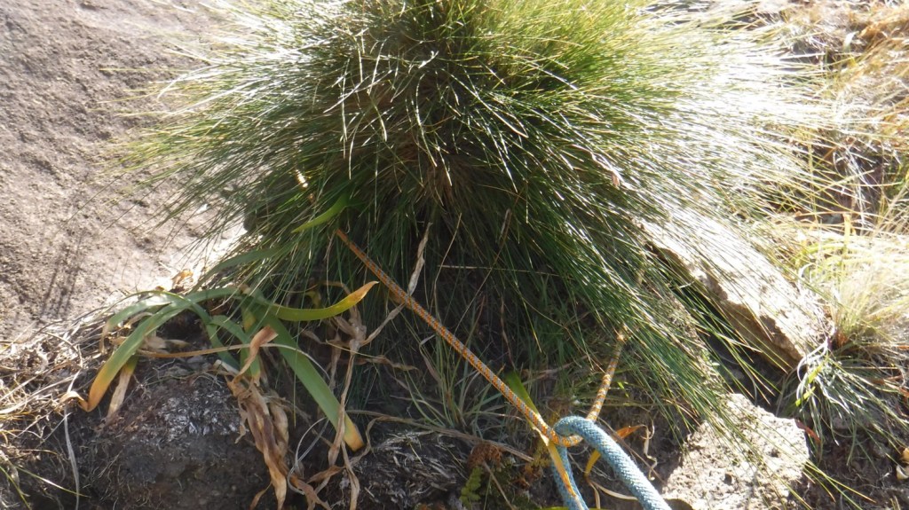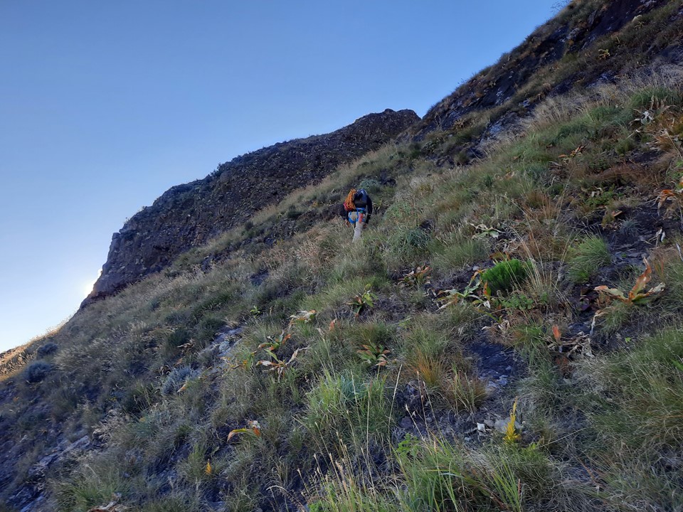 Graeme now had to downclimb the scramble. He secured a rope around a small tuft of grass and then used it for a bit of support, without pulling on it too hard. It was a similar setup to what I had used in Mauritius back in 2018 when I had to get down Pieter Both Mountain but could only find a bush to anchor my rope off. Fortunately he made it back to the ledge safely.