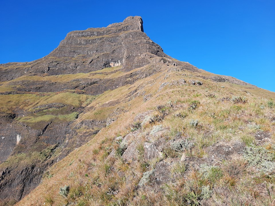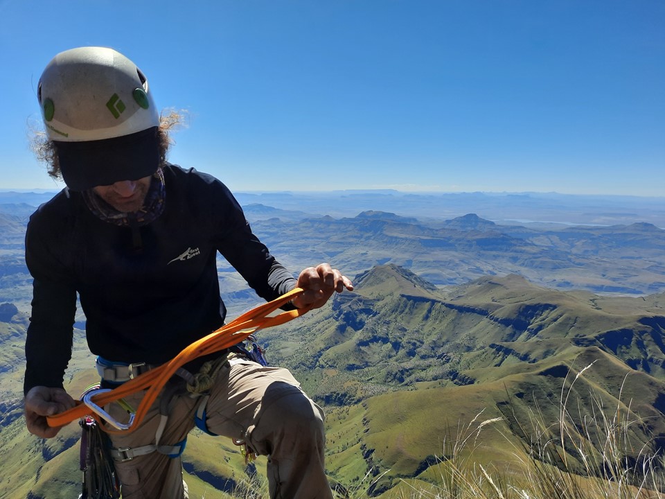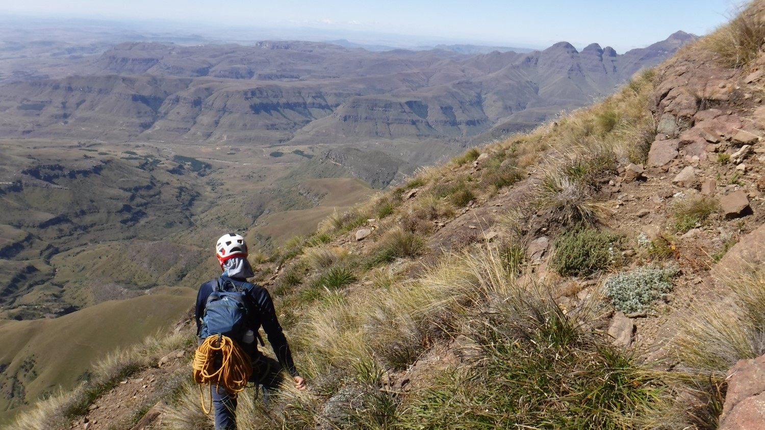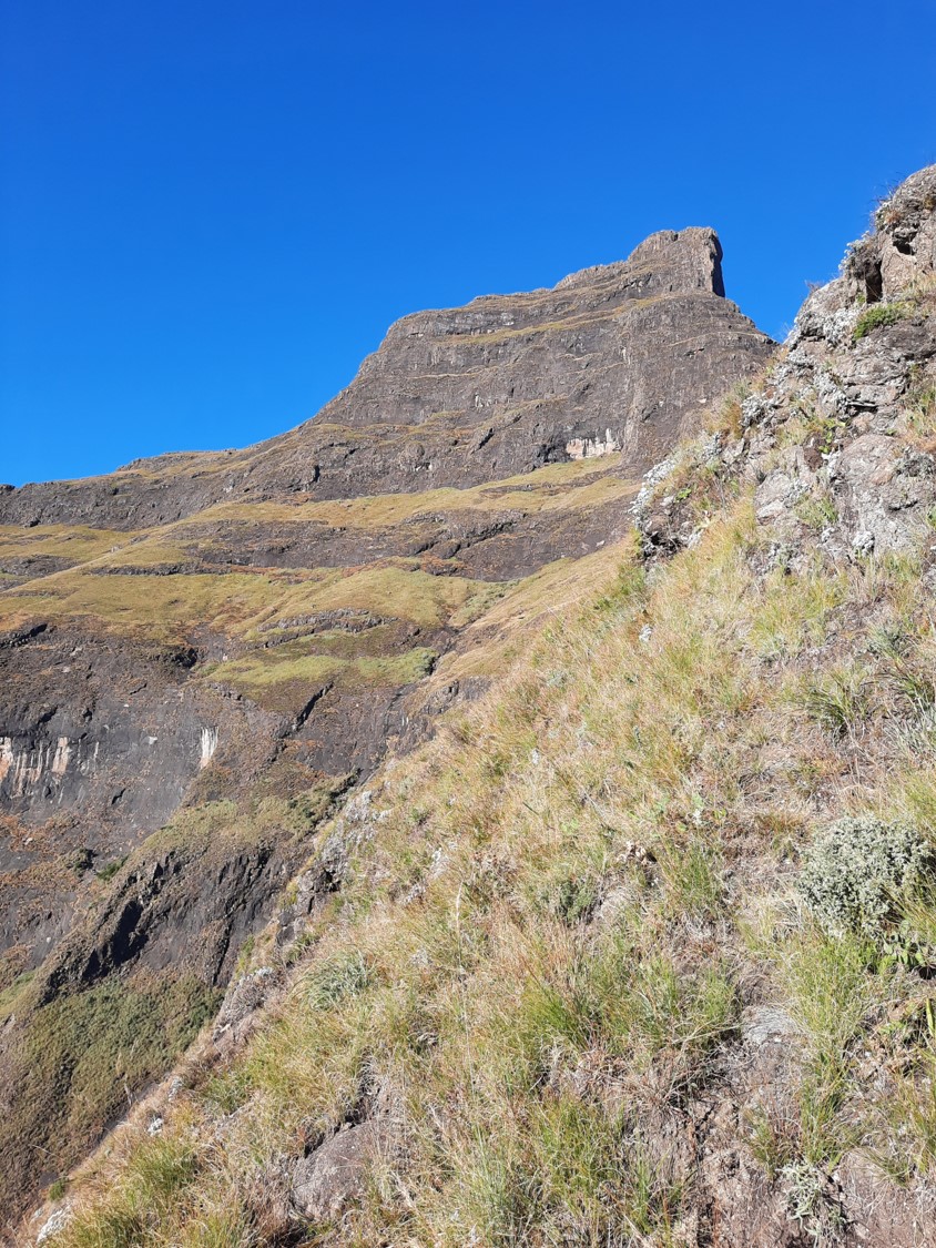 Graeme now had to downclimb the scramble. He secured a rope around a small tuft of grass and then used it for a bit of support, without pulling on it too hard. It was a similar setup to what I had used in Mauritius back in 2018 when I had to get down Pieter Both Mountain but could only find a bush to anchor my rope off. Fortunately he made it back to the ledge safely.