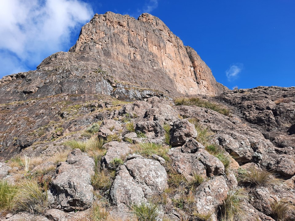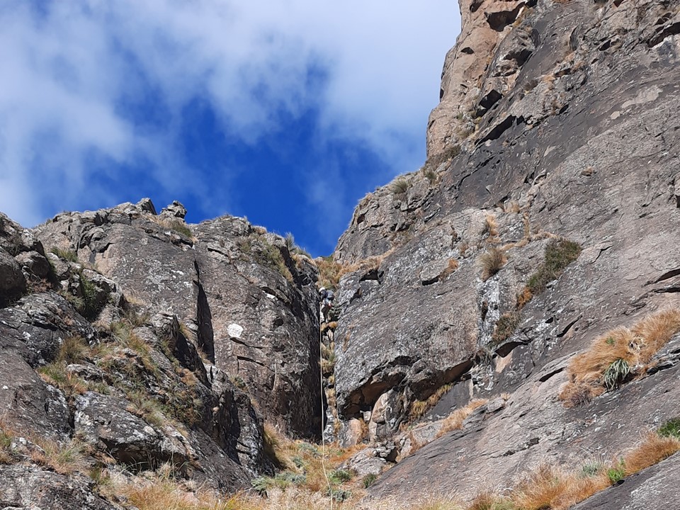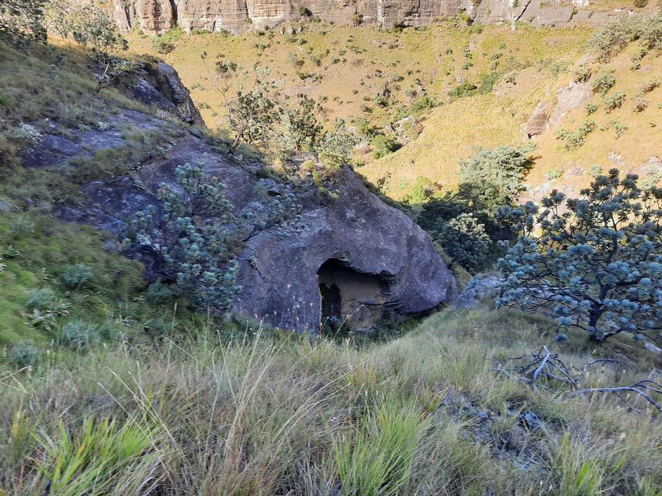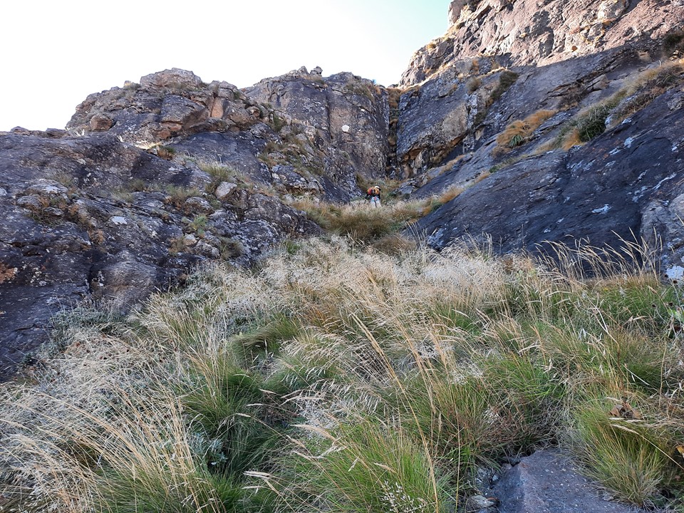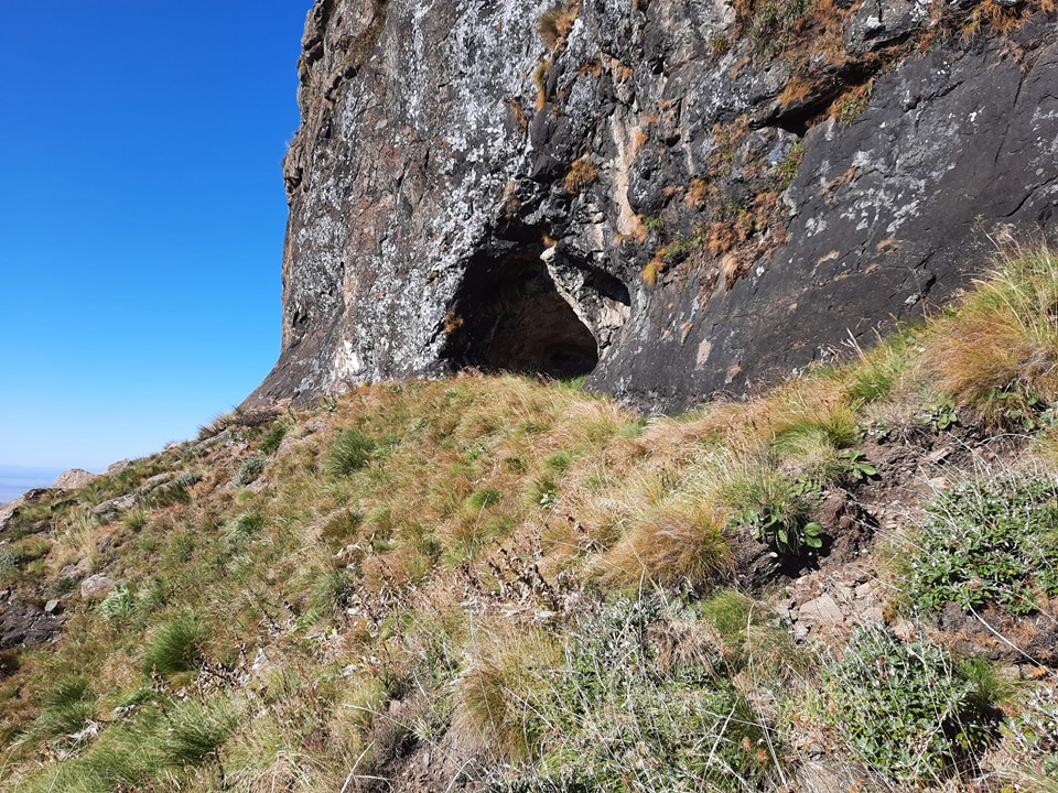 We found a cave that could sleep roughly 3 people just below the first pitch. Interestingly it had grass on the floor, so it has clearly been used before. Based on the remains of what seems to be a ritual nearby, it is probably used by the local community. Being so far from water, I doubt hikers would use it. Graeme also found a bread packet around 2400m on the ridge on the way up, and there were traces of a trail in places too – so the local community clearly does head up from time to time. Further down the peak we heard people on the south east ridge, and later even heard a Sangoma singing. A group of two people with their dogs were below us on the north east ridge around 2400m while we were descending. Surprisingly large amount of traffic on this peak!