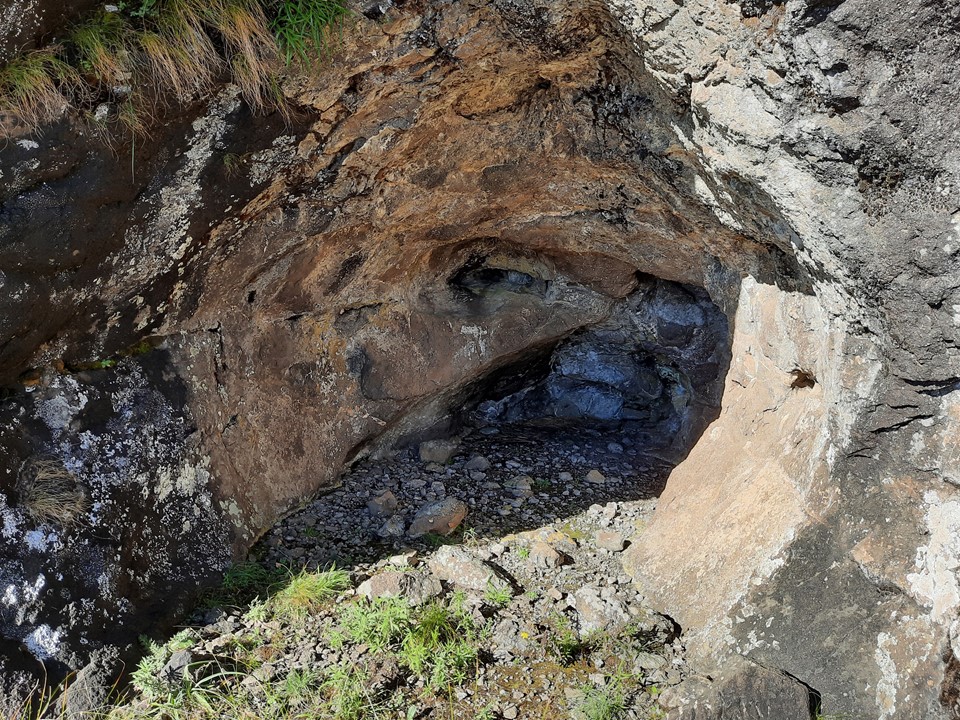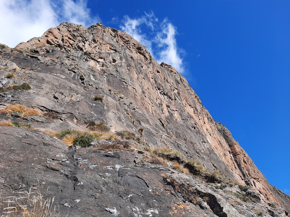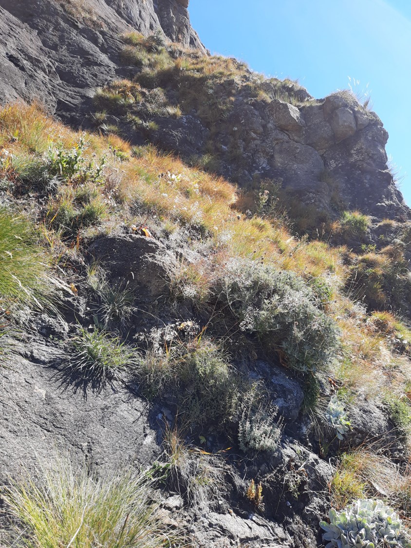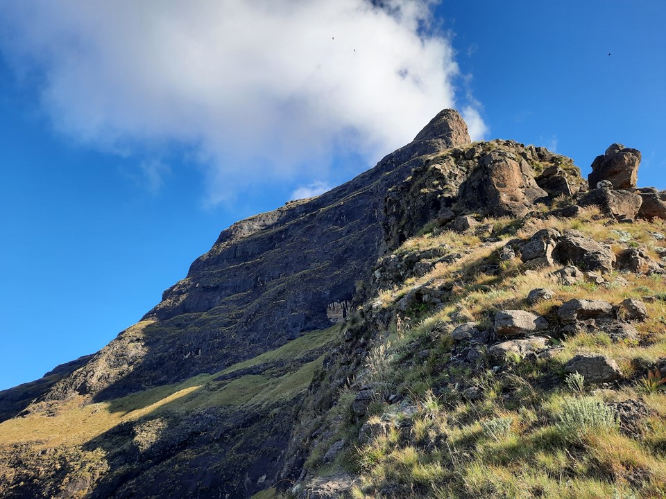 We found a cave that could sleep roughly 3 people just below the first pitch. Interestingly it had grass on the floor, so it has clearly been used before. Based on the remains of what seems to be a ritual nearby, it is probably used by the local community. Being so far from water, I doubt hikers would use it. Graeme also found a bread packet around 2400m on the ridge on the way up, and there were traces of a trail in places too – so the local community clearly does head up from time to time. Further down the peak we heard people on the south east ridge, and later even heard a Sangoma singing. A group of two people with their dogs were below us on the north east ridge around 2400m while we were descending. Surprisingly large amount of traffic on this peak!