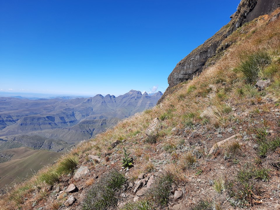 As the ridge narrowed, we got a great view into the valley below the Outer Mnweni Needle.