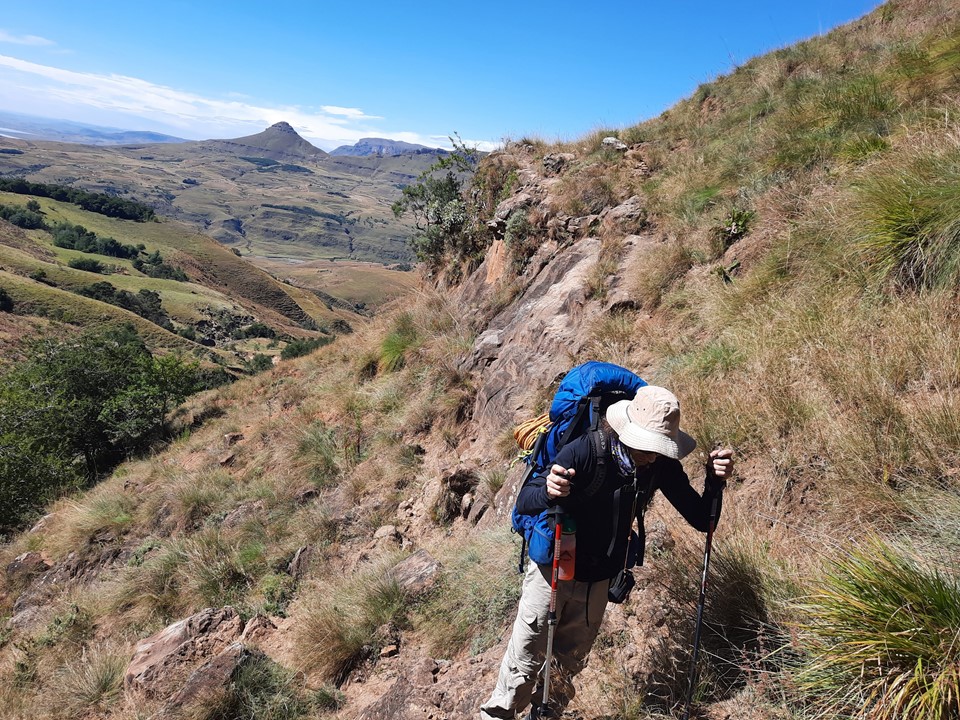 For the first time on my many visits to Mnweni, we didn’t start by walking one of the main roads – we crossed the road and started up the rough jeep track that climbs the hill opposite the Centre. I had known we would be able to find trails most of the way, so I used Google Earth to prepare a planned GPS track of where to go – which worked perfectly.