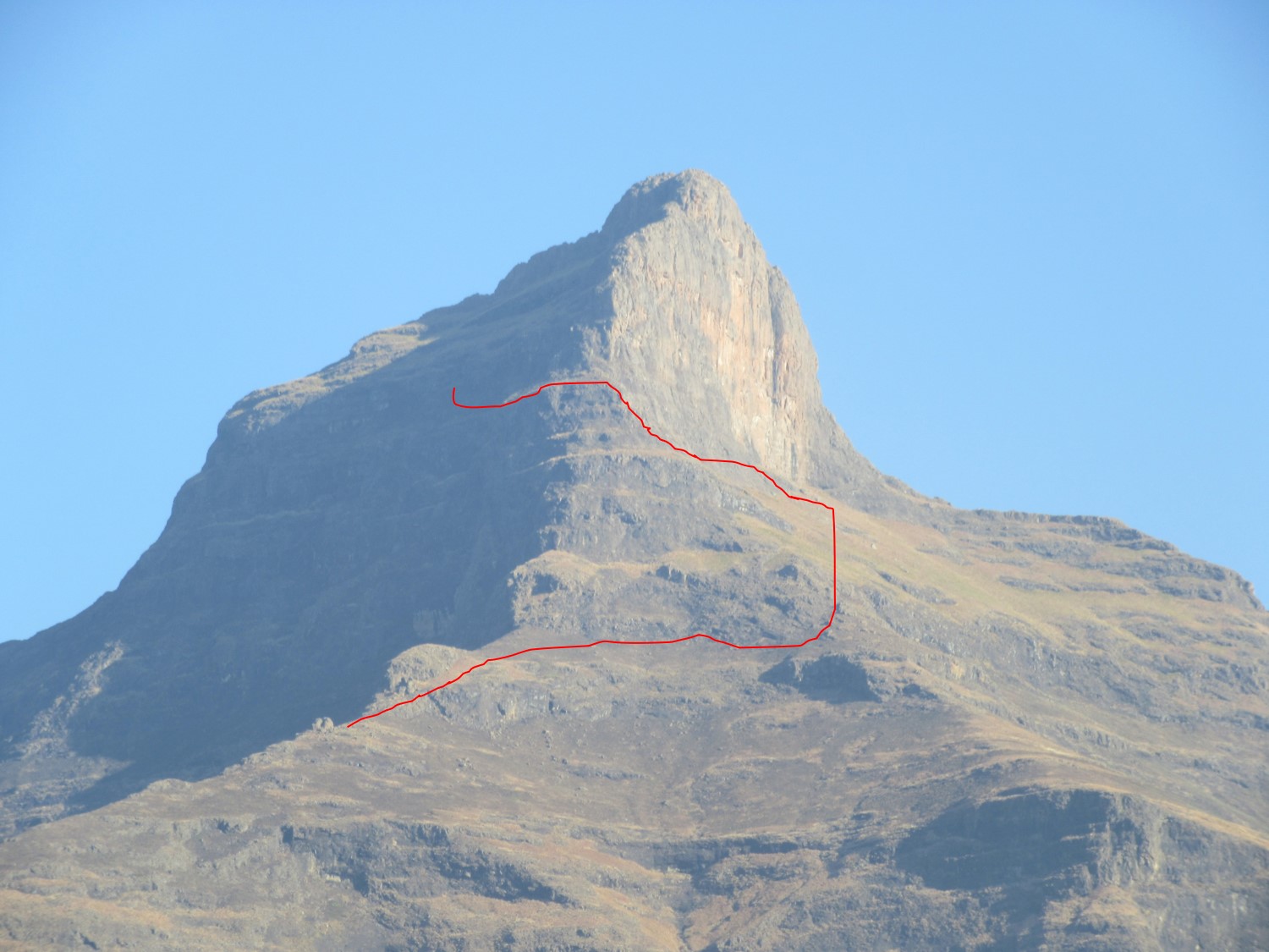 Since completing the hike, I have done further research and have revised my views on this a bit. In 2017 on my first attempt, we were planning on traversing the south slopes around 2600m to gain the south east ridge, which is what I interpreted as the standard route. A friend who had climbed the north east ridge then pointed out that I had the wrong east ridge – with the route description just stating “prominent east ridge”, when there is a north east ridge and a south east ridge, but no actual east ridge. This attempt of the north east ridge doesn’t vaguely match the route description, and the route description suggest approaching this from the valley south of the peak, which would be hard to use to access the north east ridge. Looking at photos I have taken from various angles, the south east ridge does look a lot easier – so I suspect my friend did an accidental first ascent of the north east ridge. Naturally this means I need to head back and attempt the south east ridge to see if it is in fact the correct route. Below is a line of what we did on this trip, the high point is roughly 150m vertically below the summit. The south east ridge is on the left.