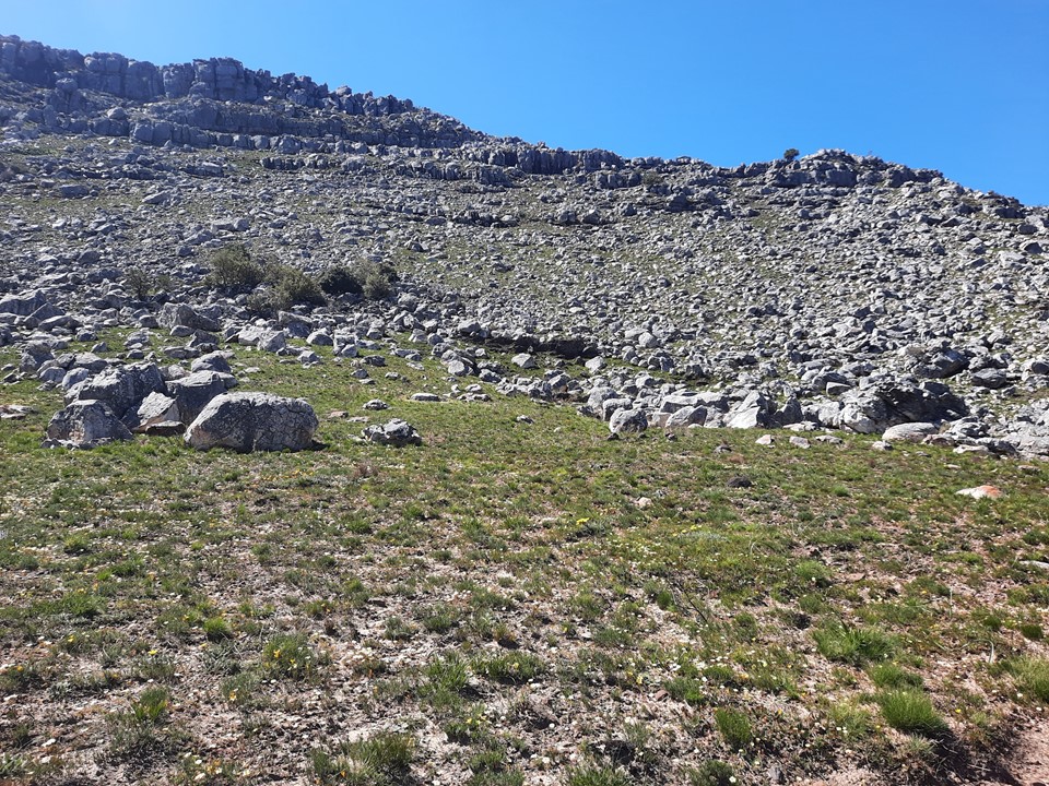 As we made our way past the first cliff band, the ground became more rocky. We scrambled up boulders, and the ground became more and more sketchy till we hit a cliff band that we couldn’t scramble through.