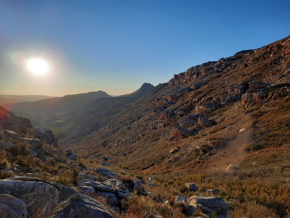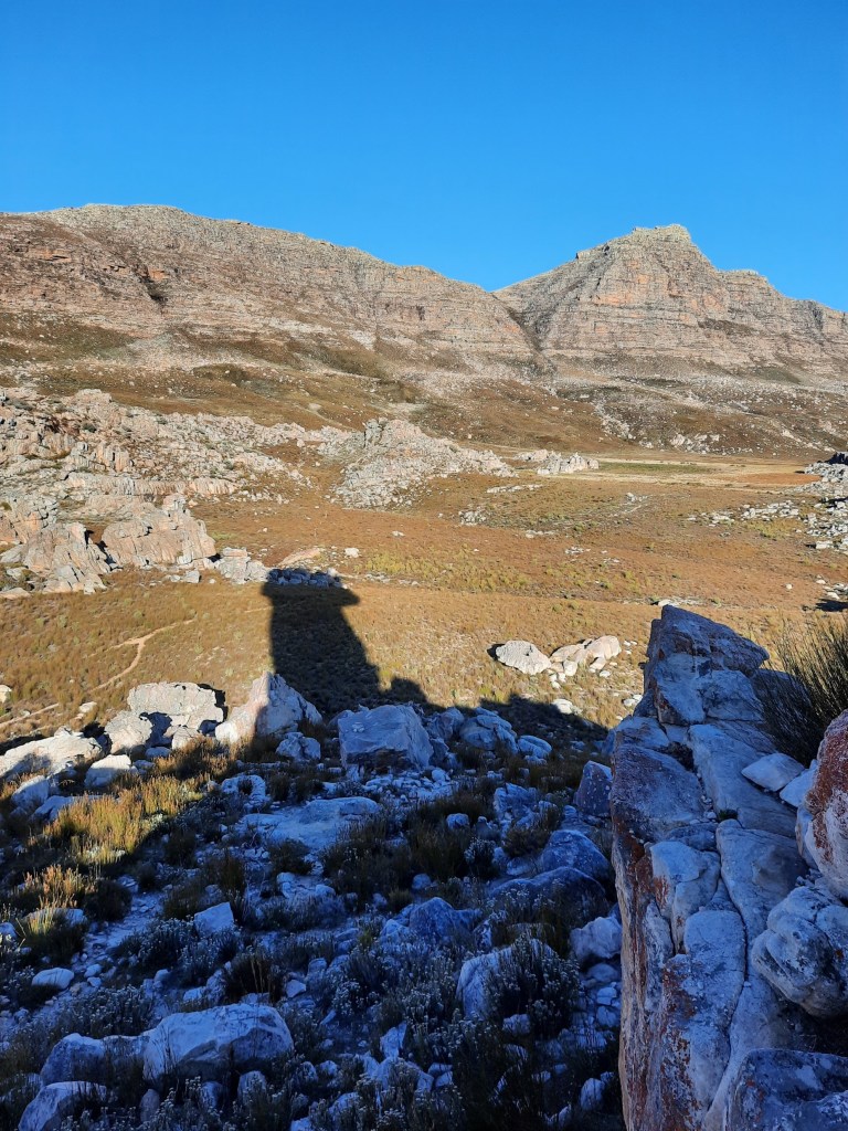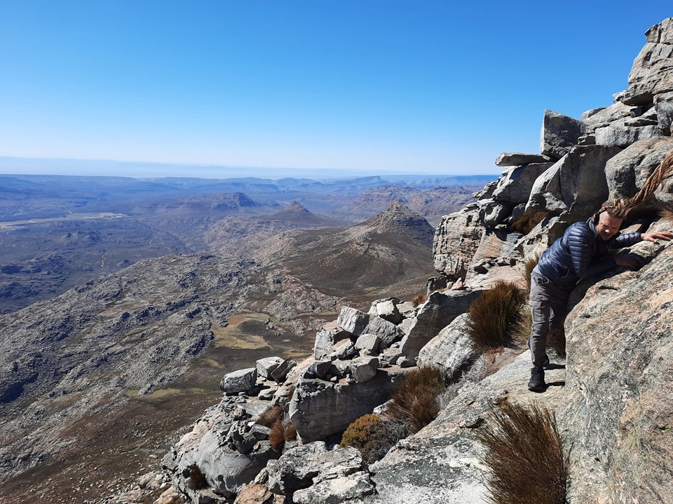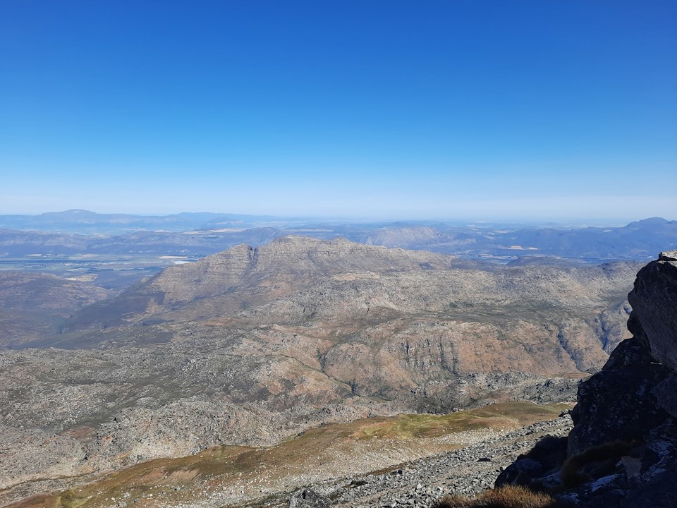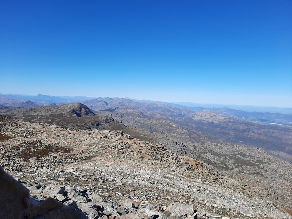 We stopped for a break behind some rocks – importantly out of the wind – and enjoyed the view out over the Cape Mountains. We could see forever!