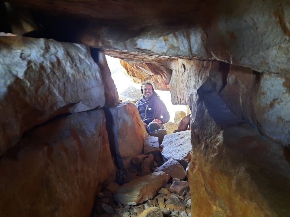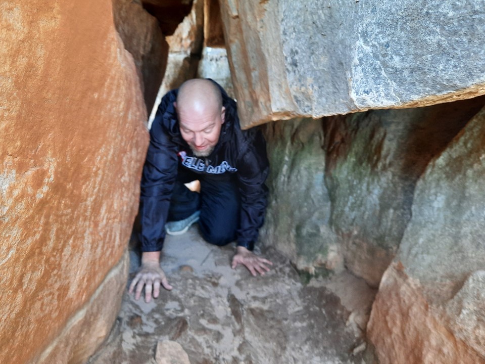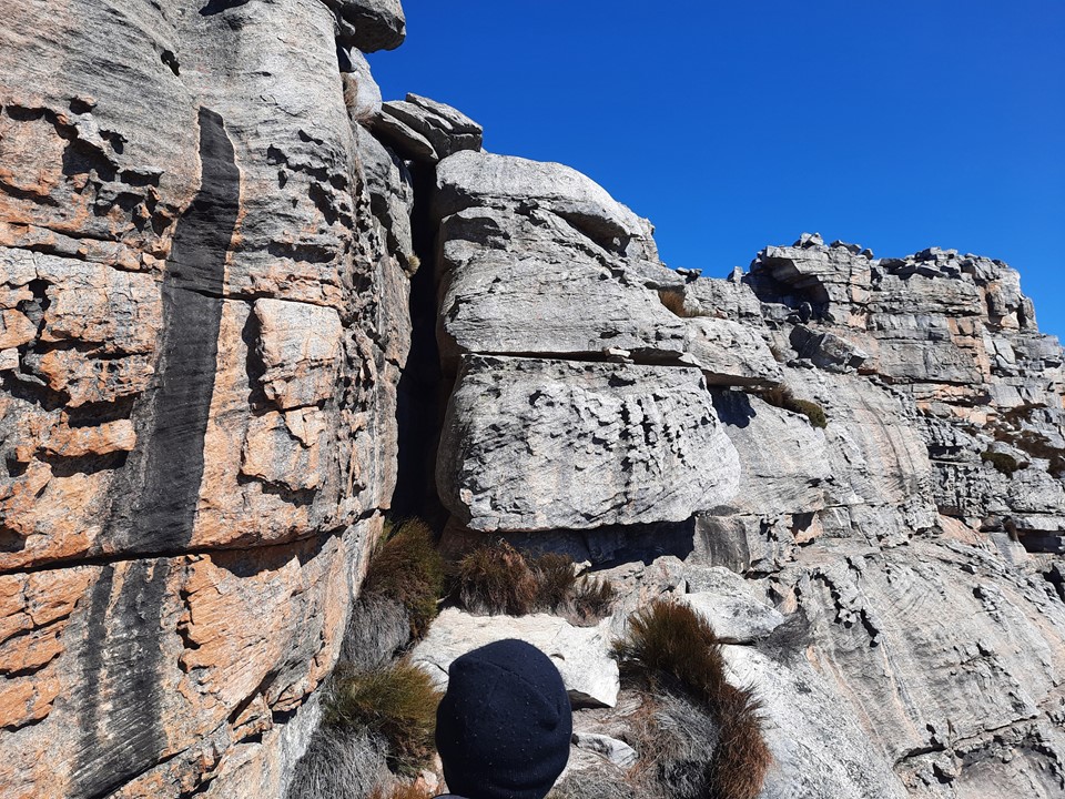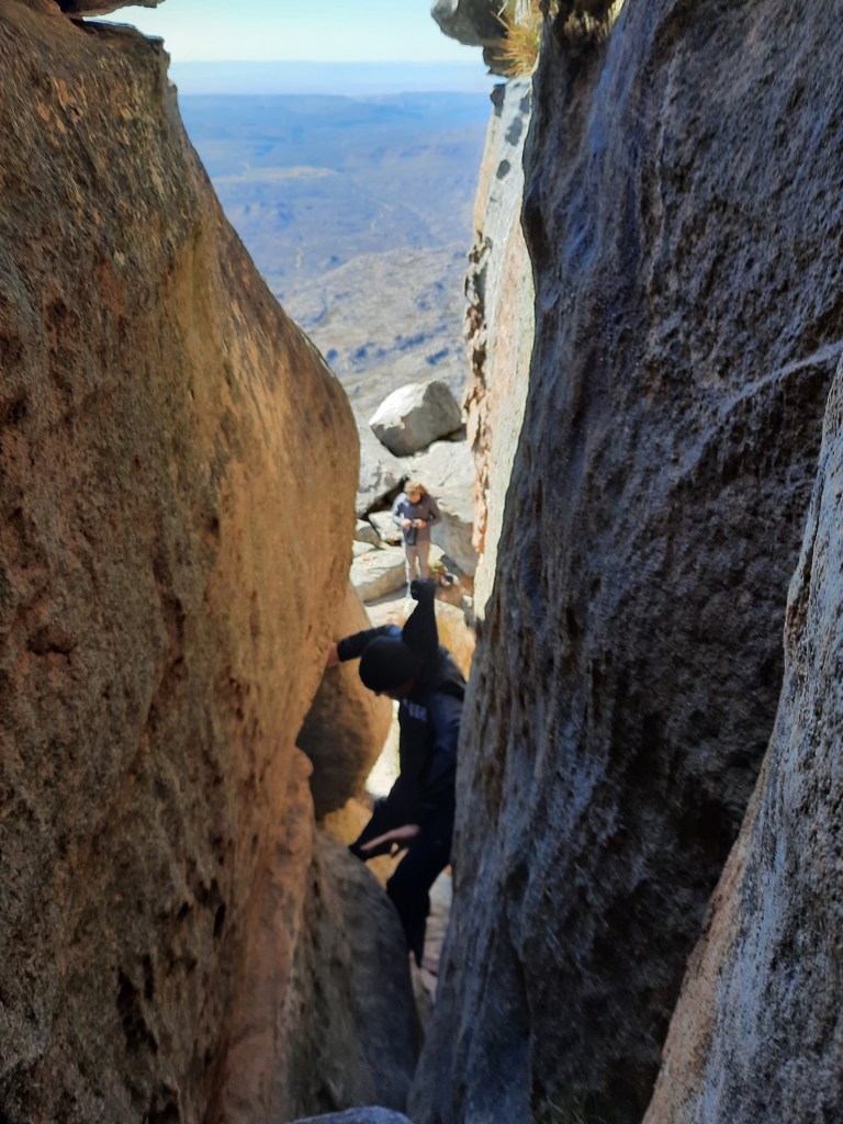 After some easy scrambling (barely even scrambling, mostly just walking up steep ground), you hit a chimney. You have to climb to the back of this, squeeze up it and then crawl through a tunnel at the back.