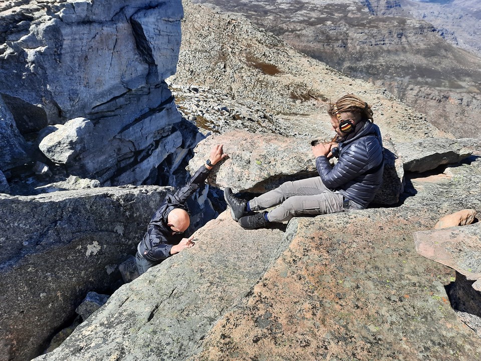 When we got to the base of the cliffs, we switched back to the east side of the peak, and found a place to drop our packs. I had brought up a light rope and some gear – which I took out before we continued up. I wasn’t expecting to need it – but I knew how lucky we were to have such a clear day and to be so close to the summit before midday, so we had plenty of time. I wasn’t going to miss the summit (or worse – have an injury in the group) due to leaving some gear behind.