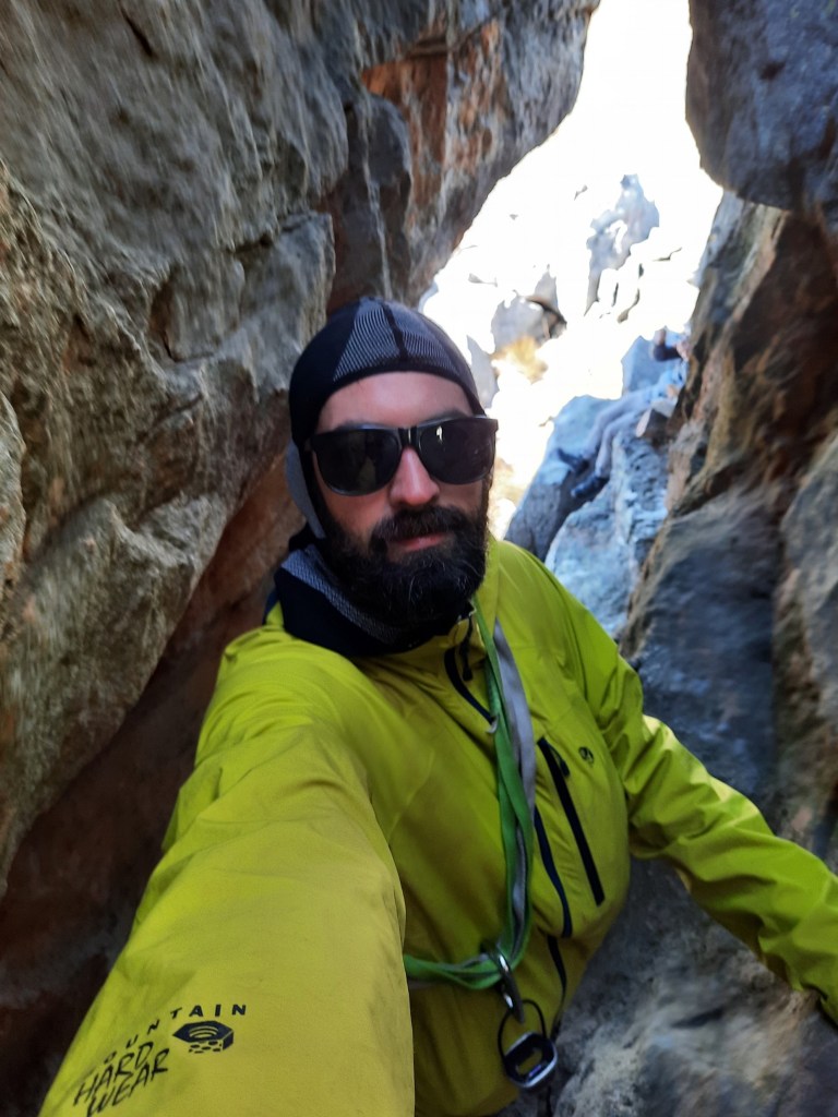 I made a meal of descending the crux – deciding I had my gear so I may as well use it. It is only 2m high, and thus not necessary as you can simply jump down. I put my rope around a rock at the top and used my belay device to effectively abseil it. As soon as I loaded the rope, the rope moved to be caught under the rock and I went from the top to almost being back on the ground (on a static rope). I probably made this section significantly more dangerous and, very predictably, got my rope stuck. I had been aware that the rope could shift, so I wasn’t likely to be swung of the edge of a cliff, as well as loading it gradually and with my feet facing down rather than against the cliff – but if I had simply jumped down like the others did, I would have landed properly – if the rope shifted much more, I would have just converted a controlled jump into an uncontrolled short fall. After a long time of trying to get the rope back out, Rudi climbed back up, go it out, and jumped back down. Long story short: I used safety gear to make it more dangerous and slower.