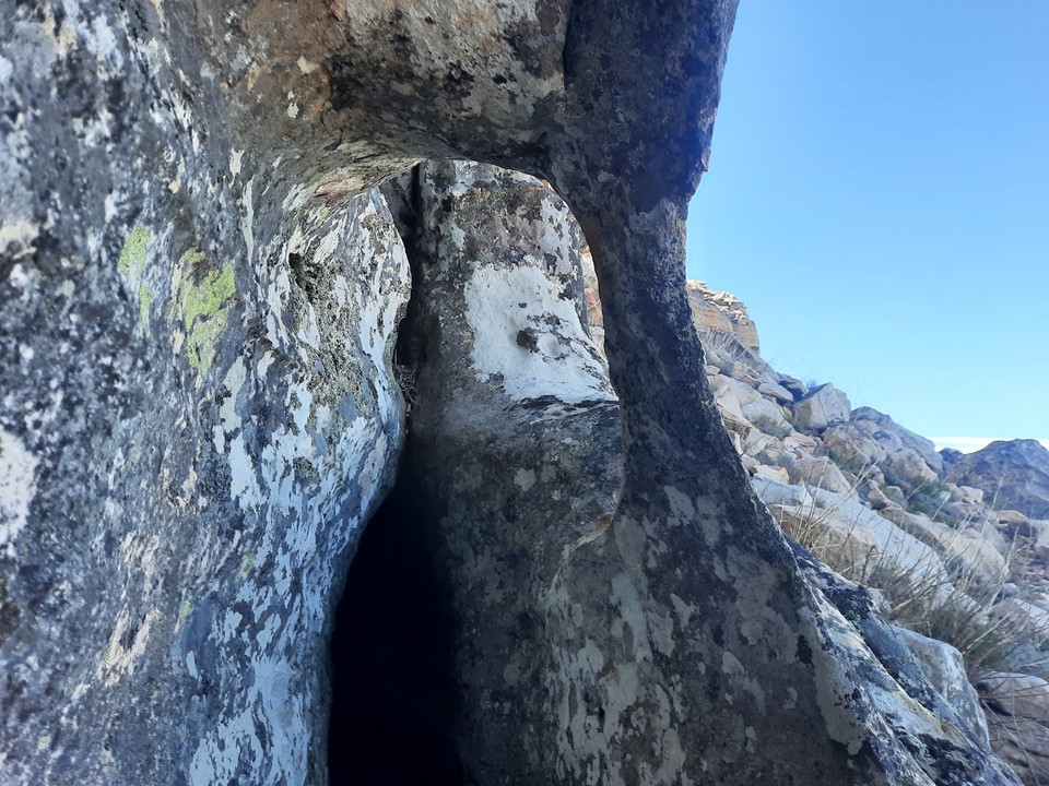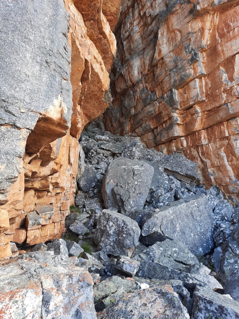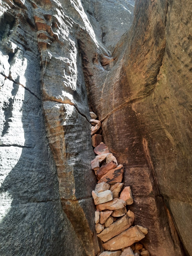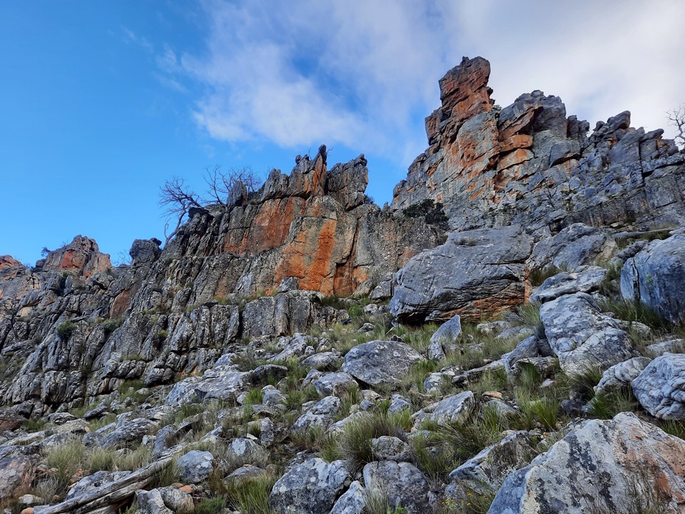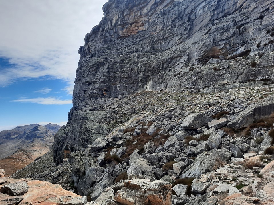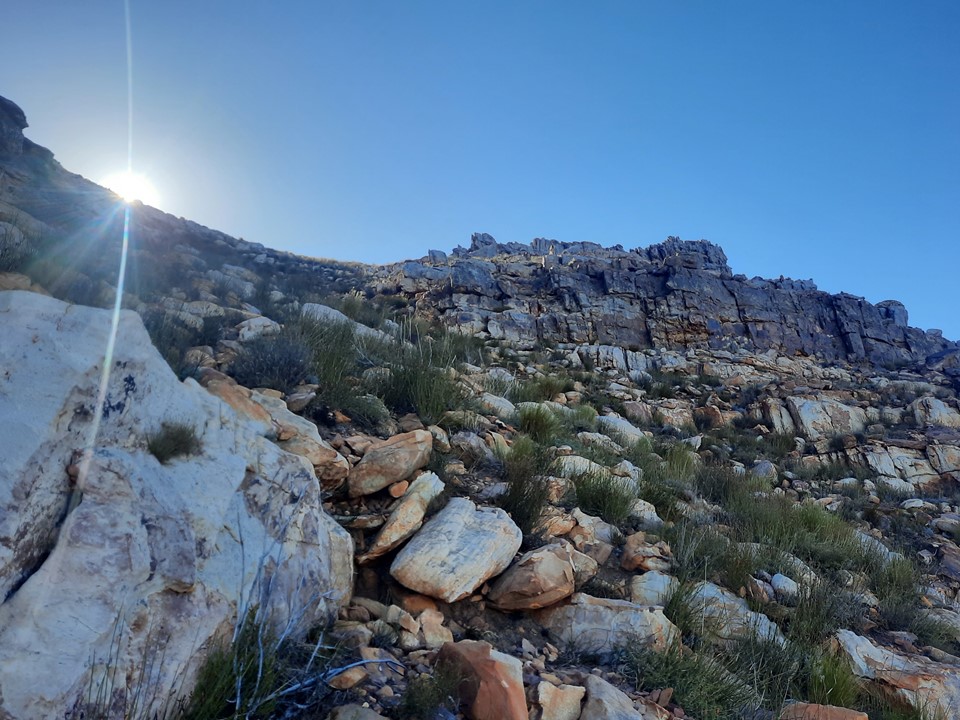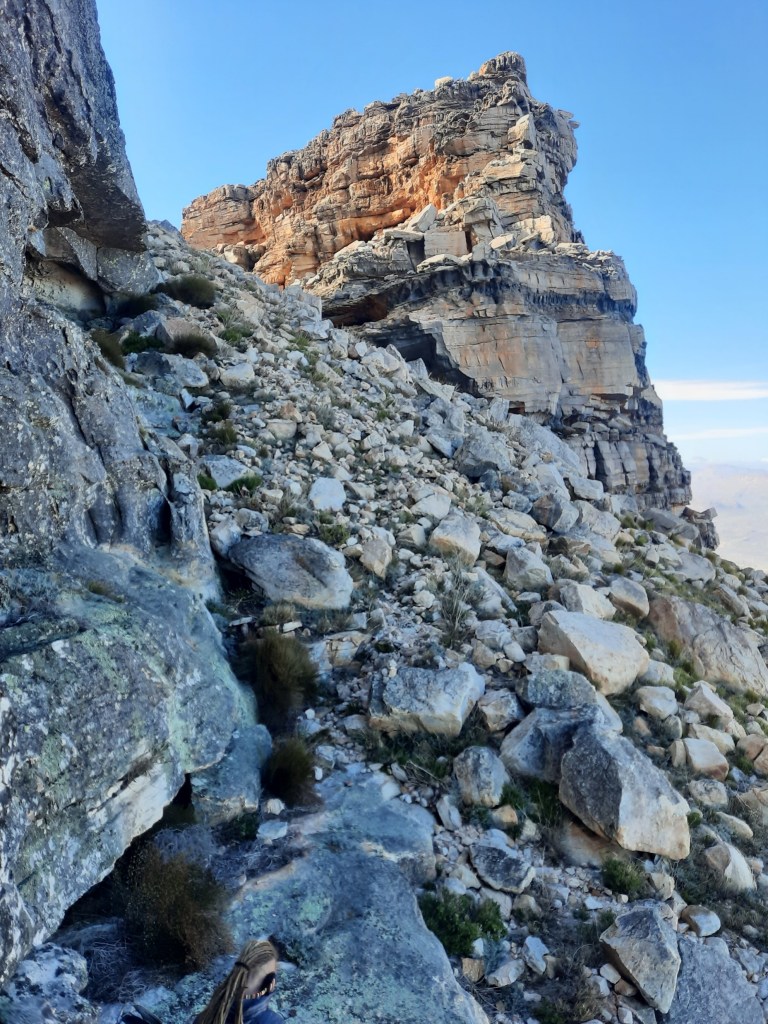 The route soon took us up the rocky field between Tafelberg and the Spout. Both are home to numerous climbing routes – being a relatively easy spot to access with good quality rock. According to the website, The Crag, there 63 trad routes on The Spout and 197 on Tafelberg itself. The area is strictly trad only, so there are no bolts. All climbing routes to the summit of Tafelberg are multi-pitch.