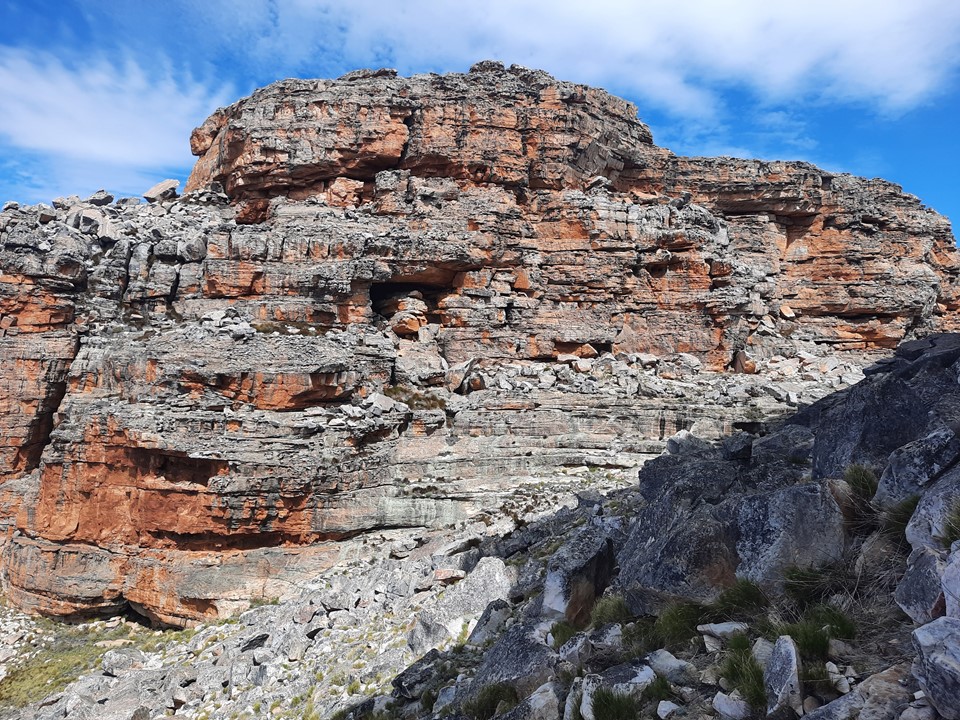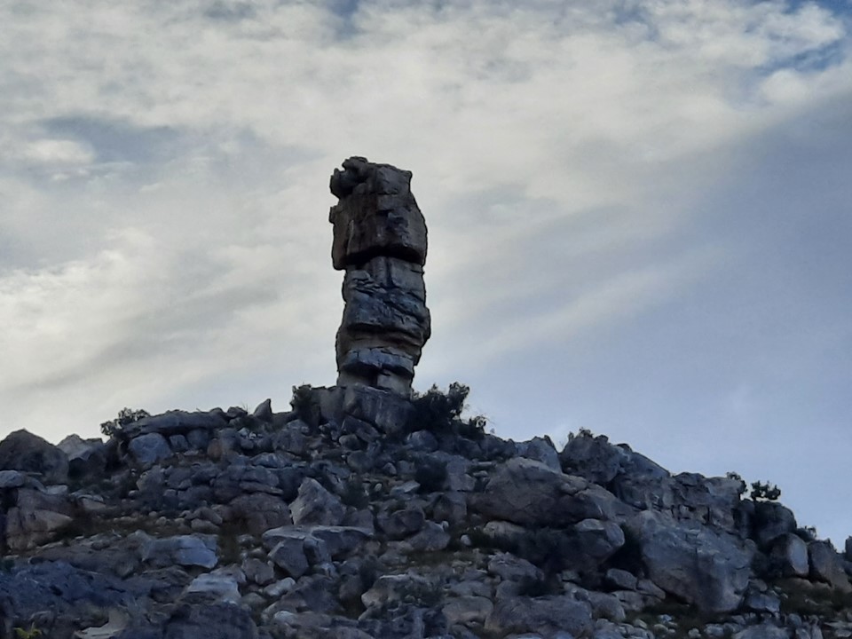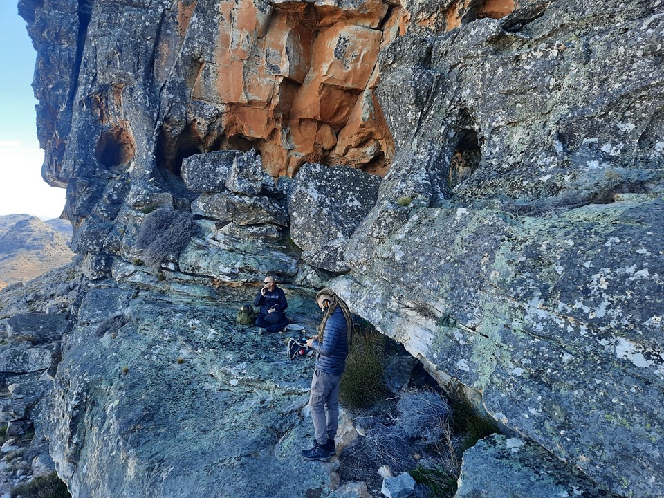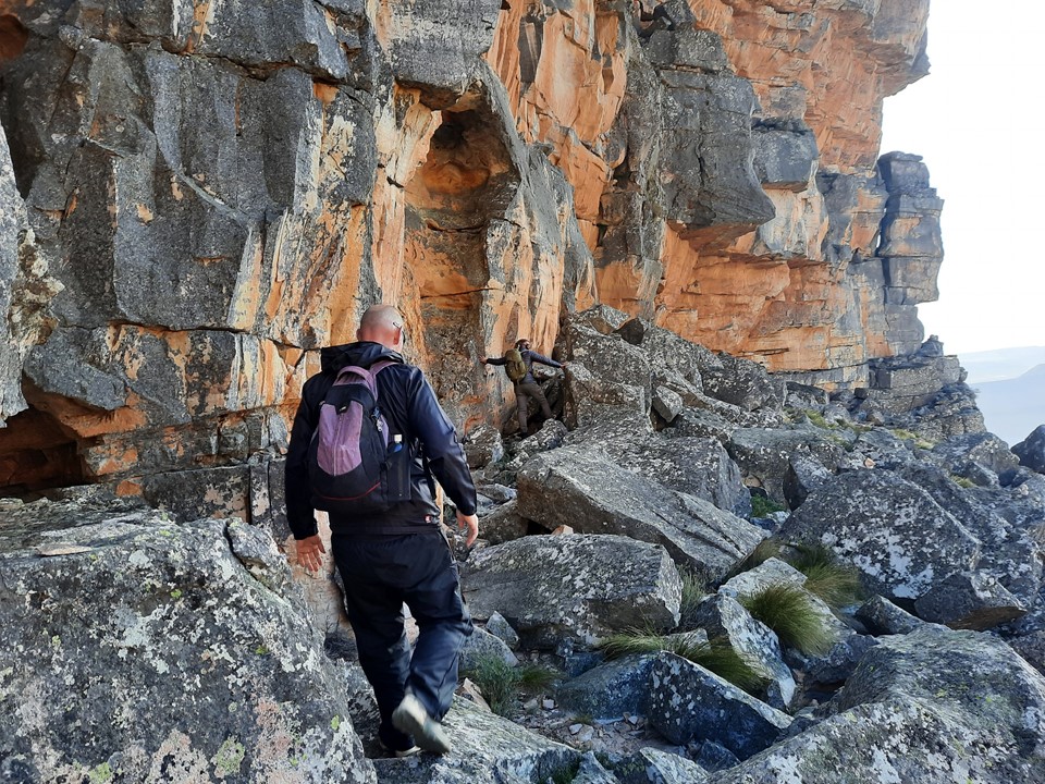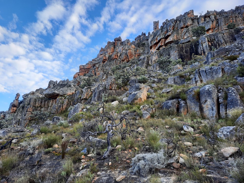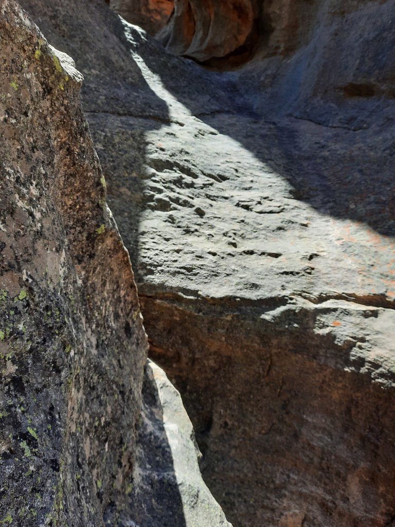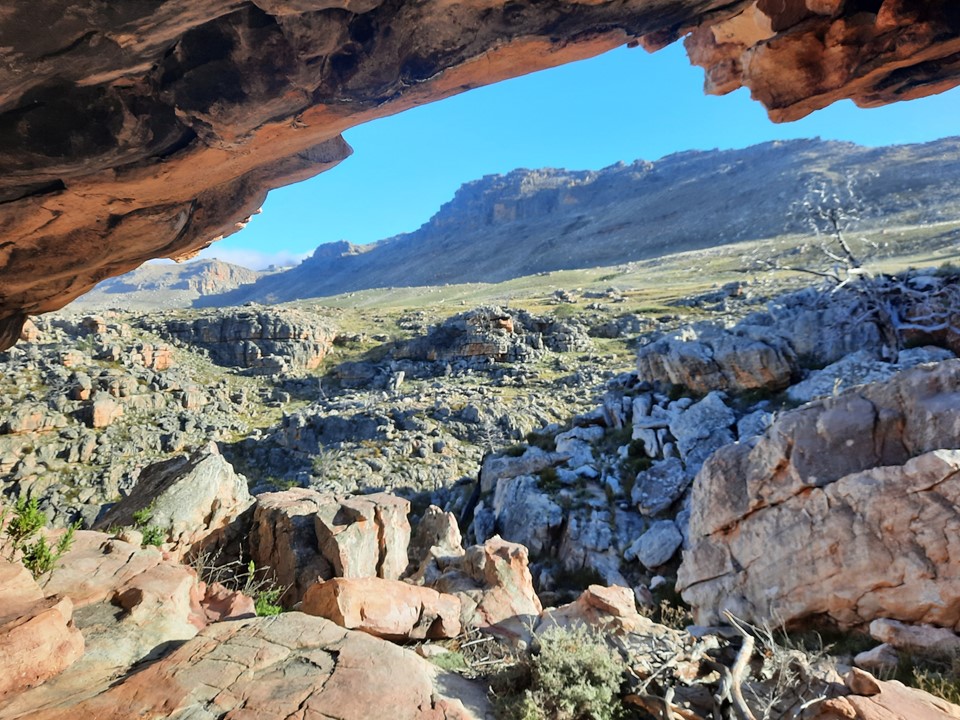 The route soon took us up the rocky field between Tafelberg and the Spout. Both are home to numerous climbing routes – being a relatively easy spot to access with good quality rock. According to the website, The Crag, there 63 trad routes on The Spout and 197 on Tafelberg itself. The area is strictly trad only, so there are no bolts. All climbing routes to the summit of Tafelberg are multi-pitch.
