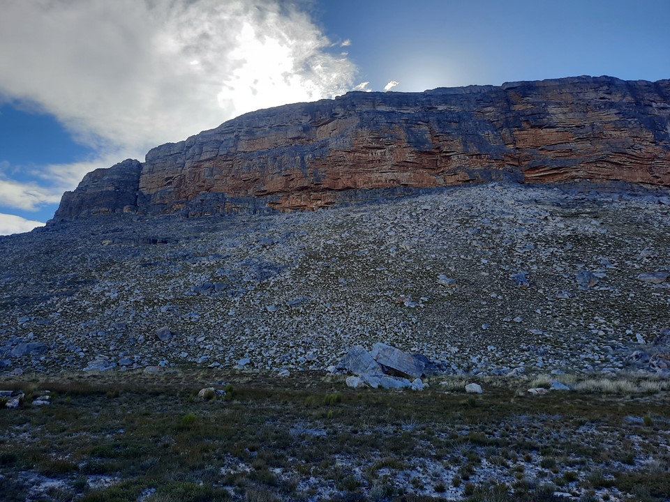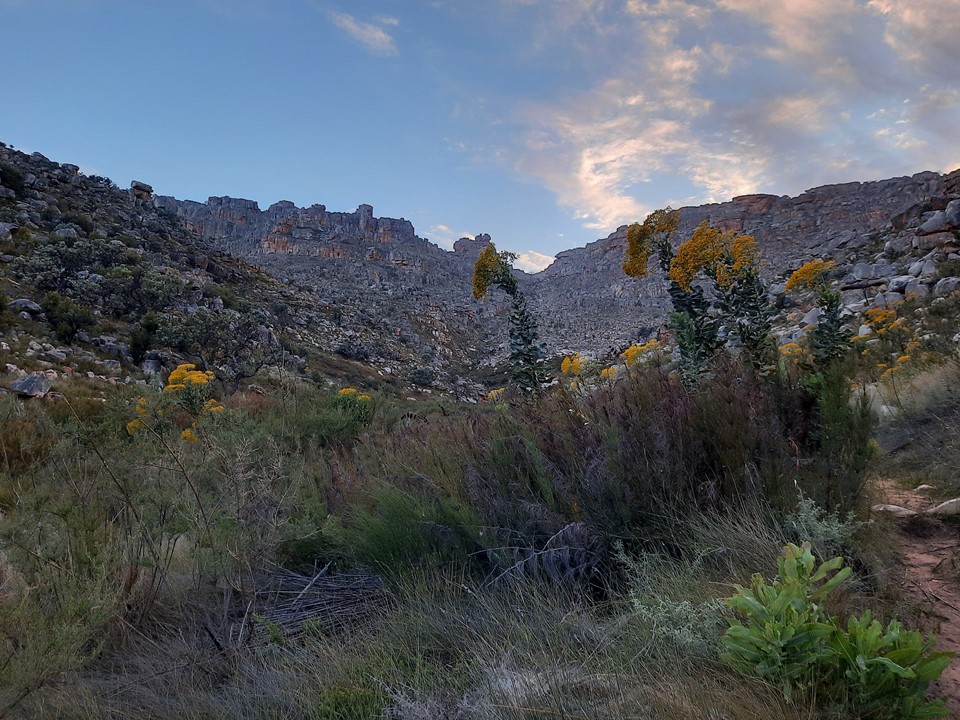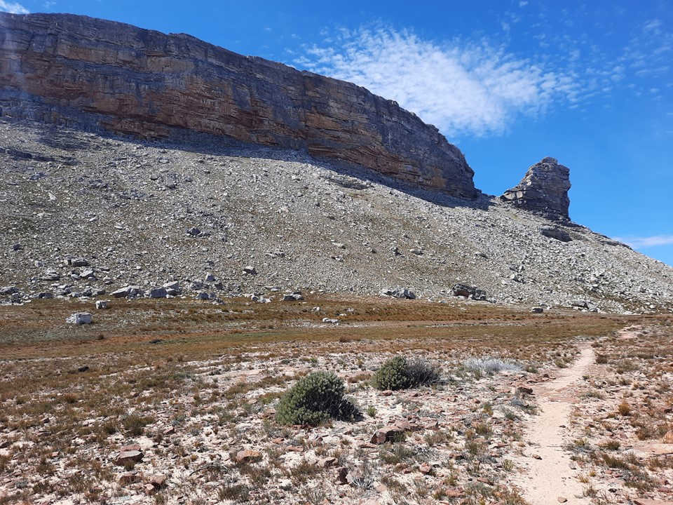 We soon found ourselves on a surprisingly flat plateau with Tafelberg towering above us. The summit of the mountain is approximately 700m across and is surrounded by a cliff that varies between 100m and 200m in height. It always looks far smaller on photos, and is surprisingly difficult to fit into a single photo from below. The morning sun also happened to be on the wrong side of the mountain to get decent photos of it.