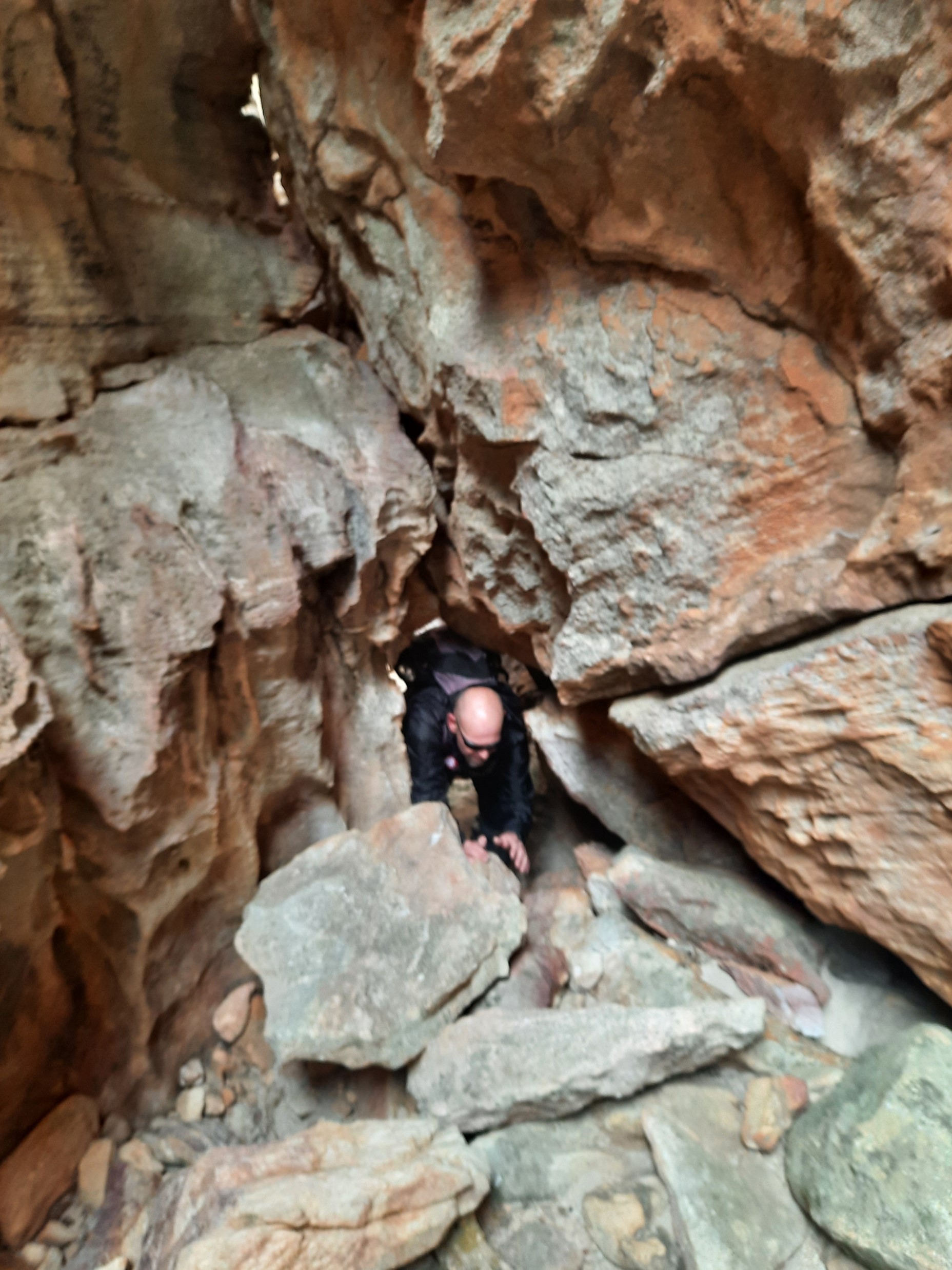 Soon the route hits a chockstone – there is a tunnel on the right that you have to crawl through.