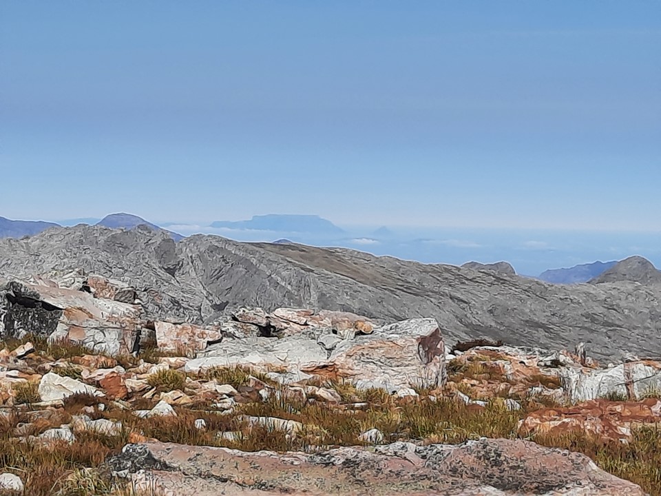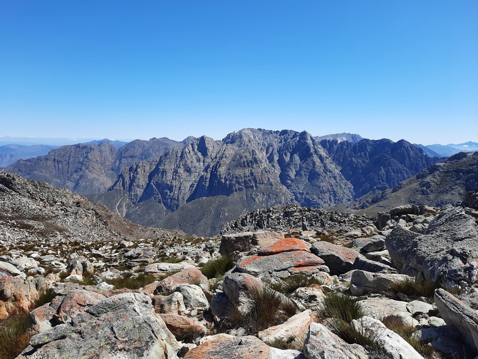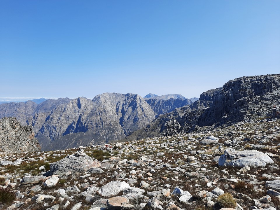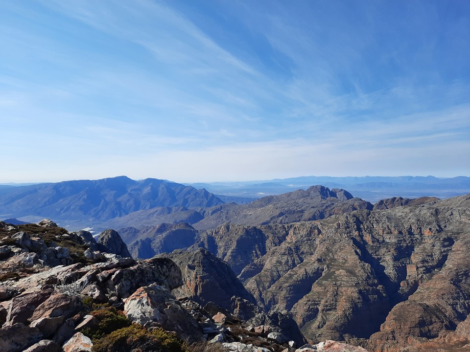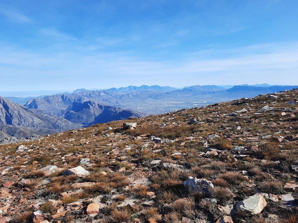 The view from the summit was amazing – I could see Table Mountain, Sneeuberg (Cederberg) and even Sebrakop was visible in the distance. Including Buffelshoek itself, I could see 10 out of SA’s 24 most prominent mountains from this summit. This was my eighth summit on the list, a third of them done, and all eight were visible from here. I could also see Keeromsberg and Groot Winterhoek Mountain, which I am yet to do. There were peaks visible in the direction of Misty Point and Pilaarkop, so it is possible that I could see other peaks from the list, but I can’t say for certain.