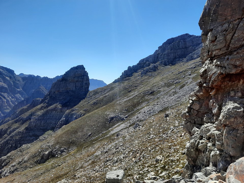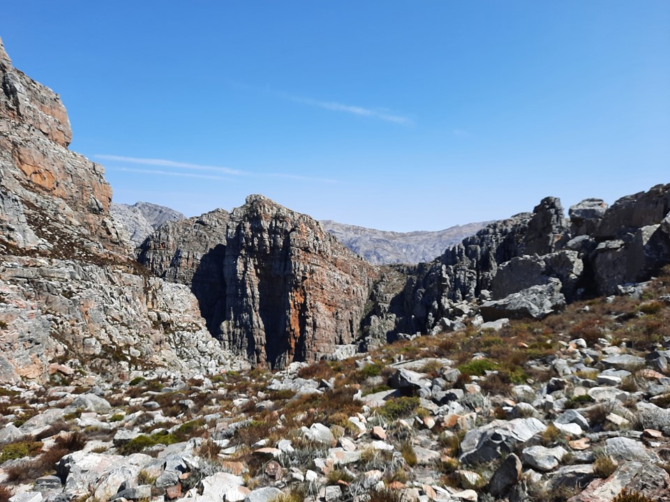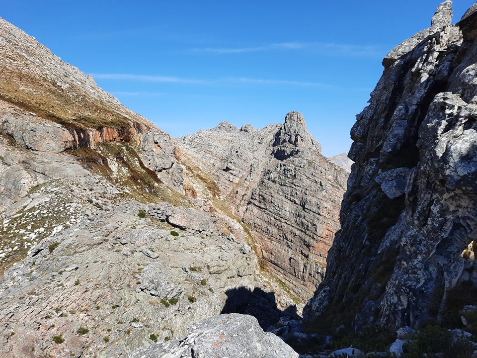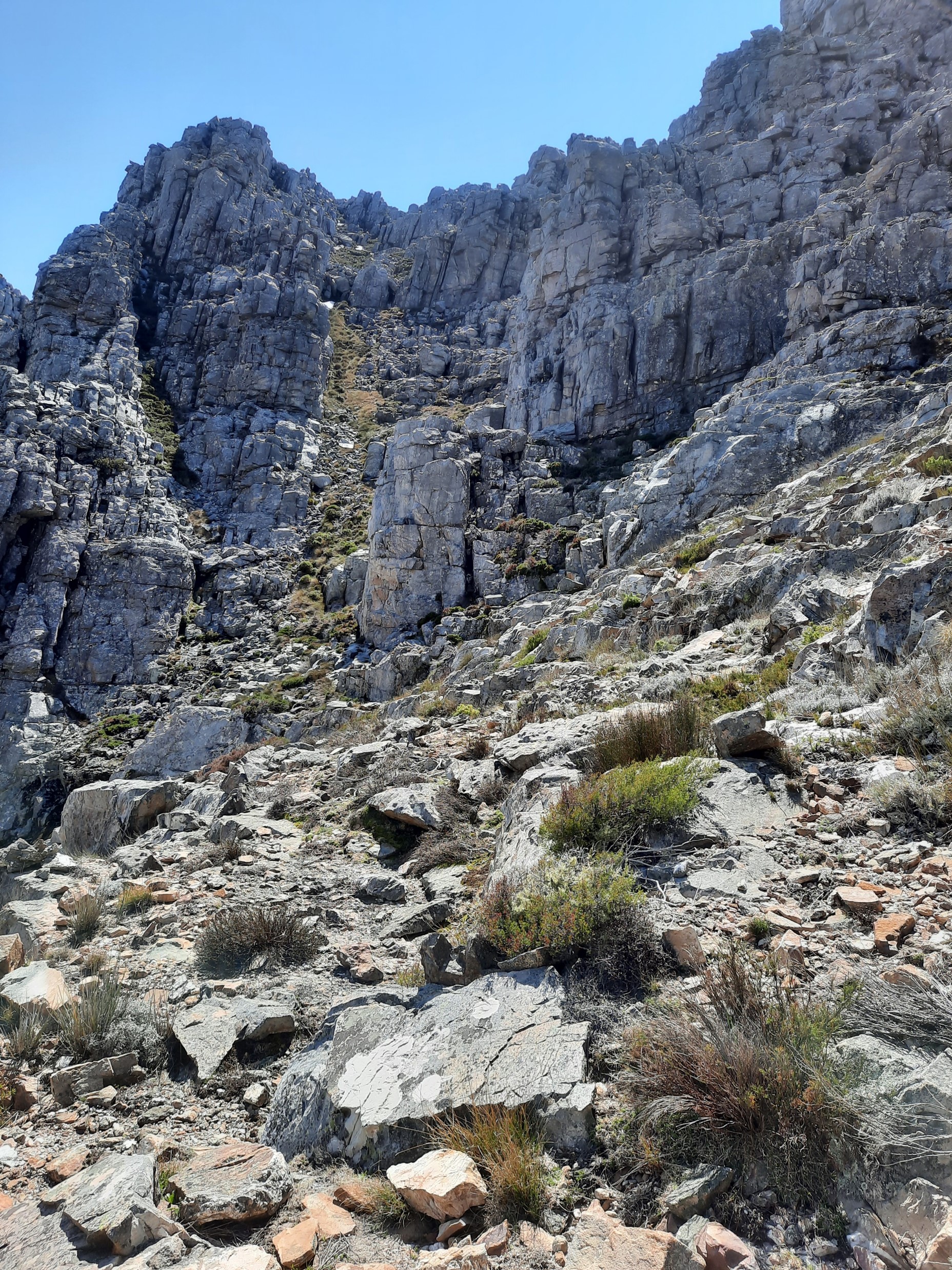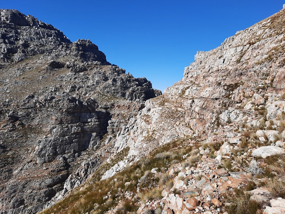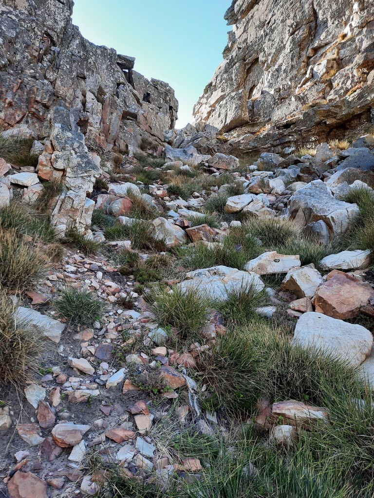 While the Fonteinjies side of Horseshoe had been relatively easy ground, the Brodie side was loose rock between cliffs with a large drop on the side. Fortunately I have crossed this type of terrain many times, and knew how to pick a good line. I also know that you never rush on ground like this – a poor foot placement can lead to anything from a twisted ankle to gravity reminding you which way is down.