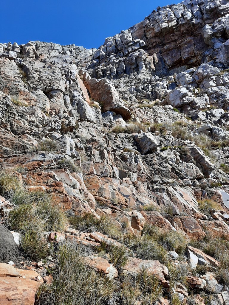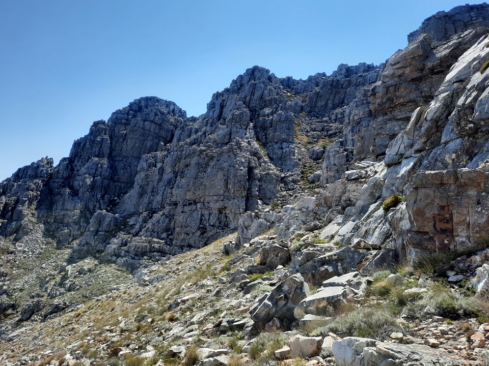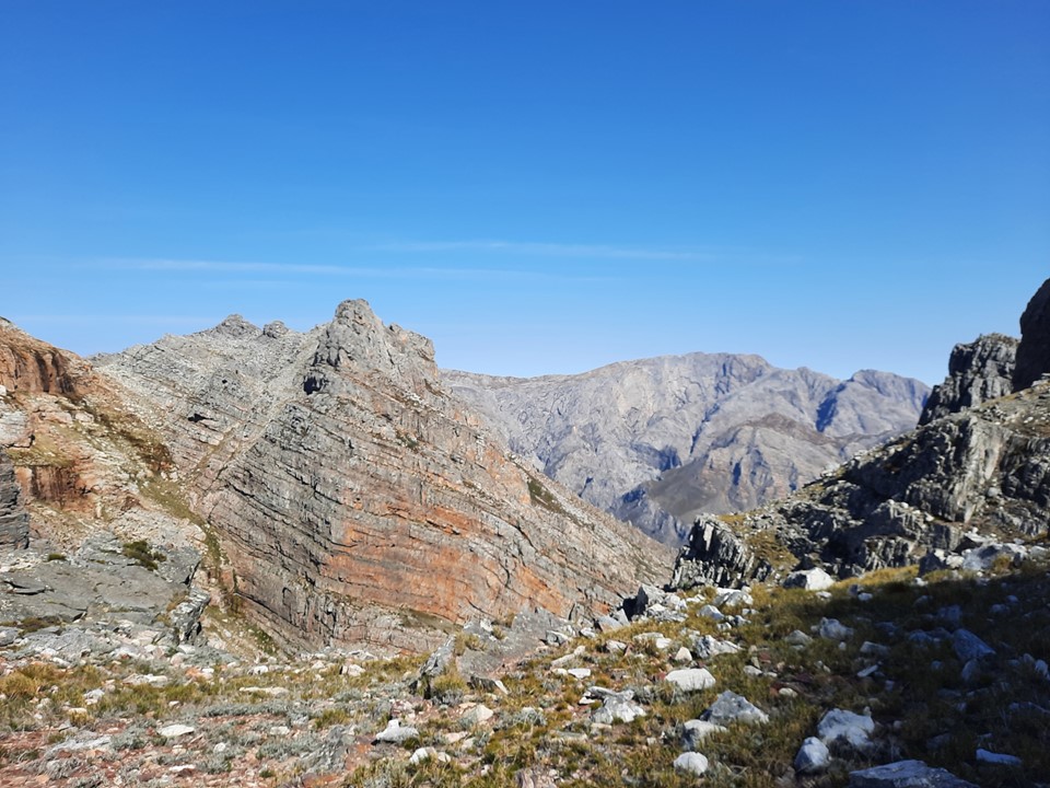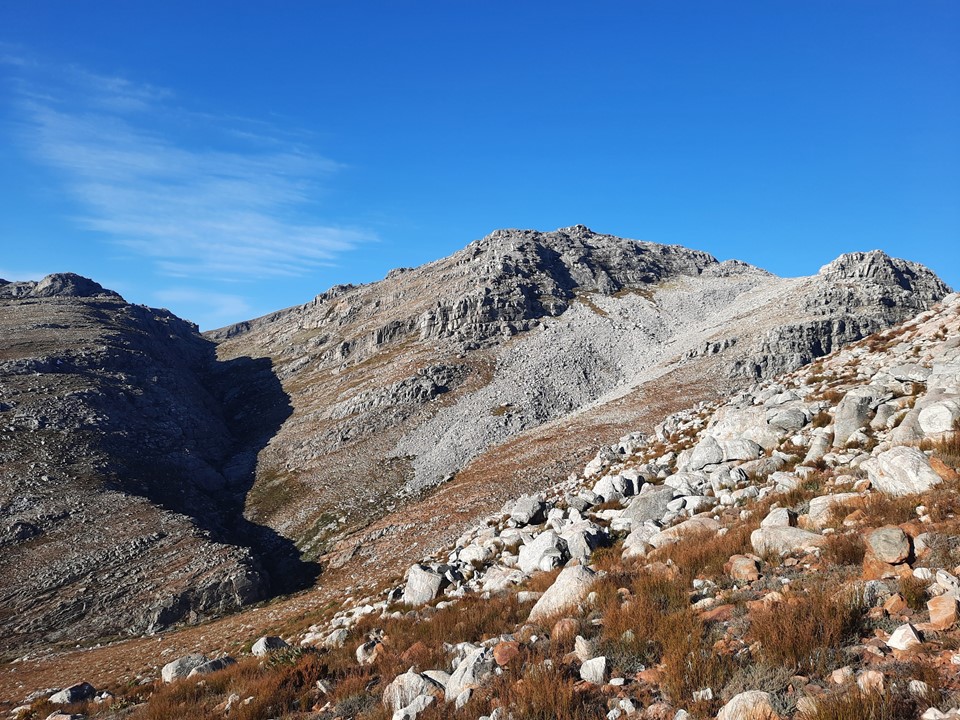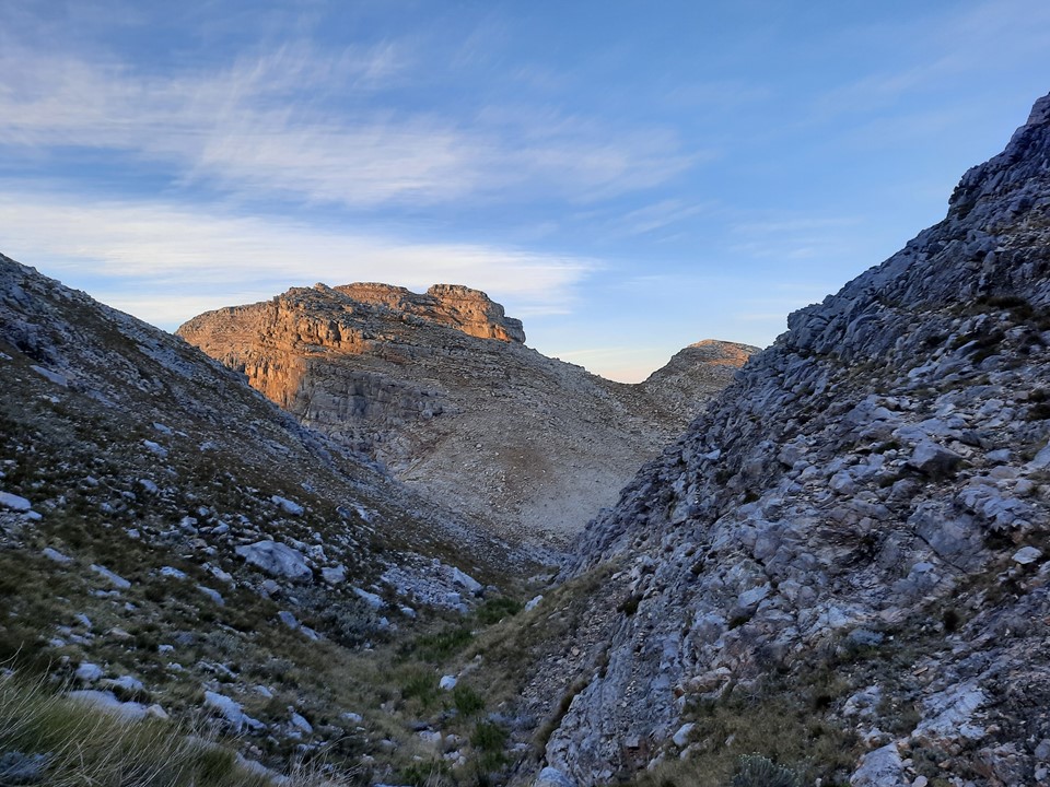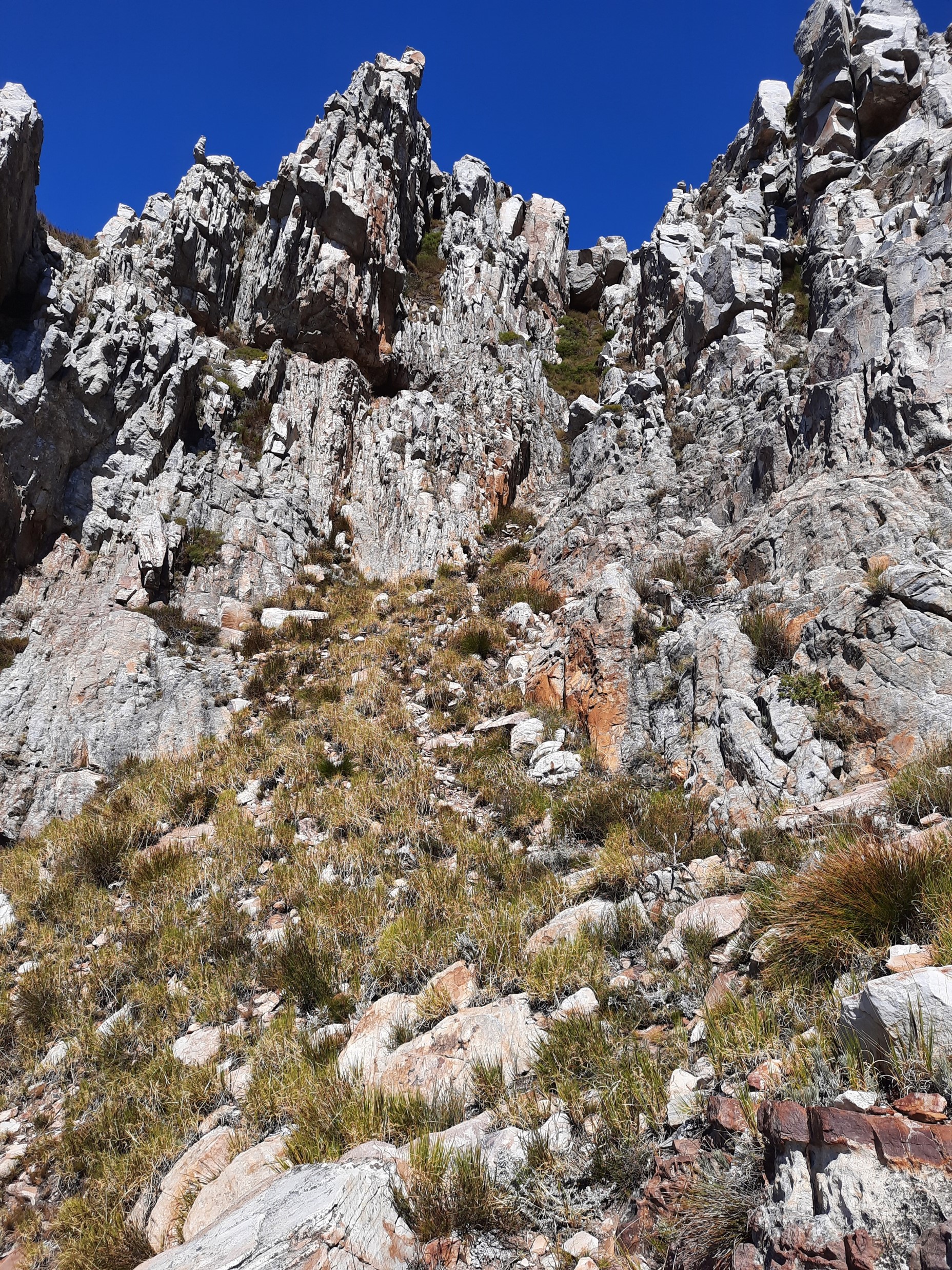 While the Fonteinjies side of Horseshoe had been relatively easy ground, the Brodie side was loose rock between cliffs with a large drop on the side. Fortunately I have crossed this type of terrain many times, and knew how to pick a good line. I also know that you never rush on ground like this – a poor foot placement can lead to anything from a twisted ankle to gravity reminding you which way is down.