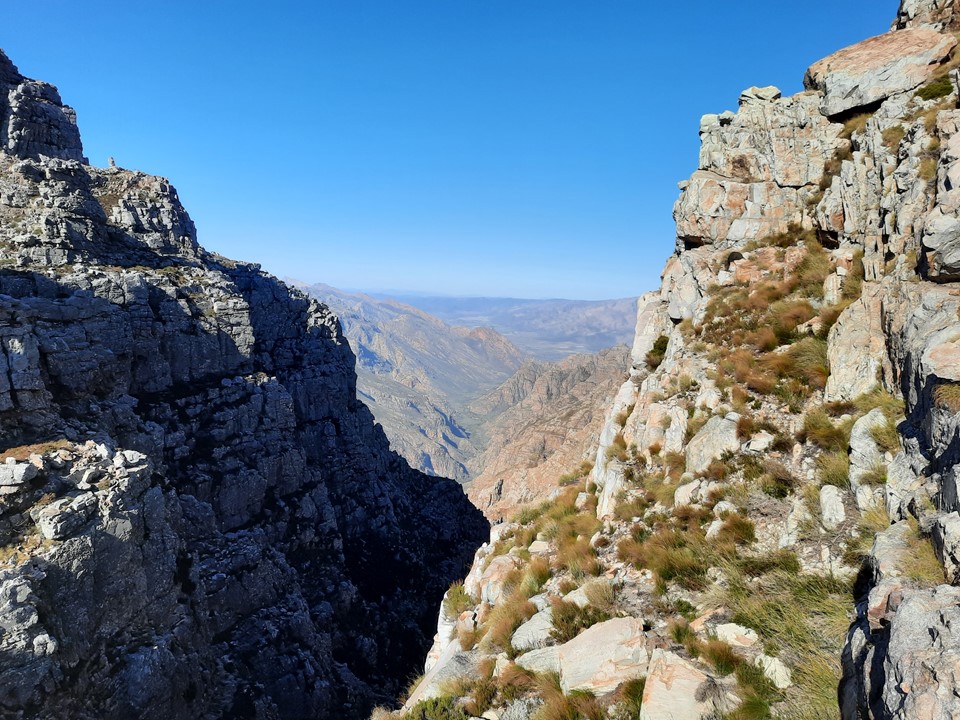 My concerns about the cliffs on the Buffelshoek side were soon dismissed as I saw an obvious gully to a ledge with a second gully to the left. I had a good look down Buffelshoek Kloof – which would be a spectacular line to hike.