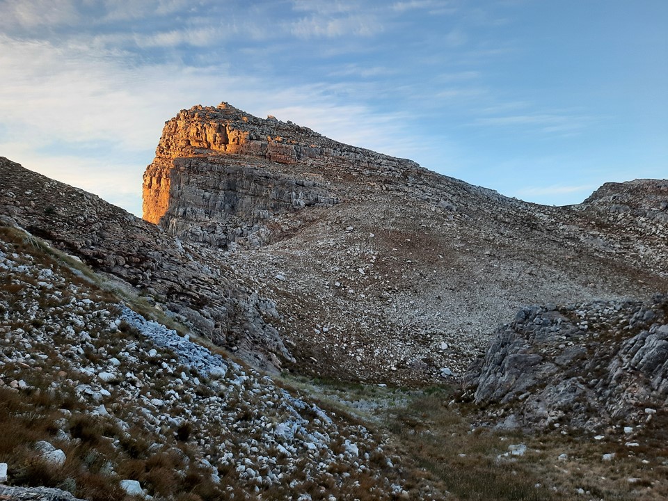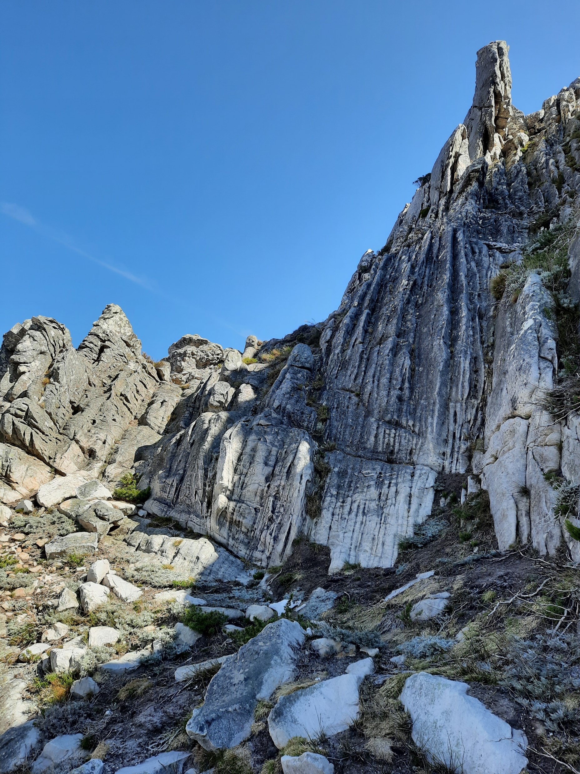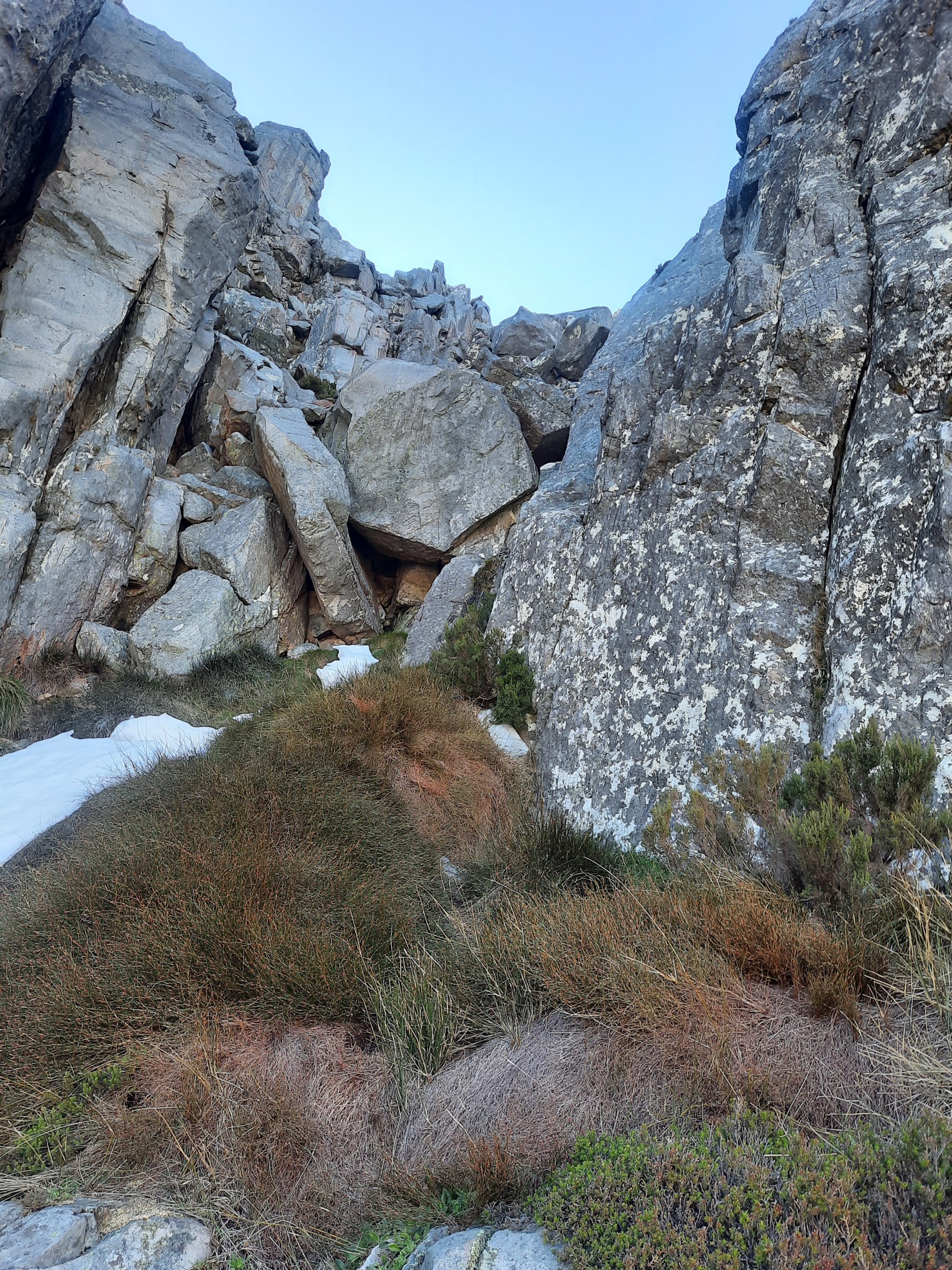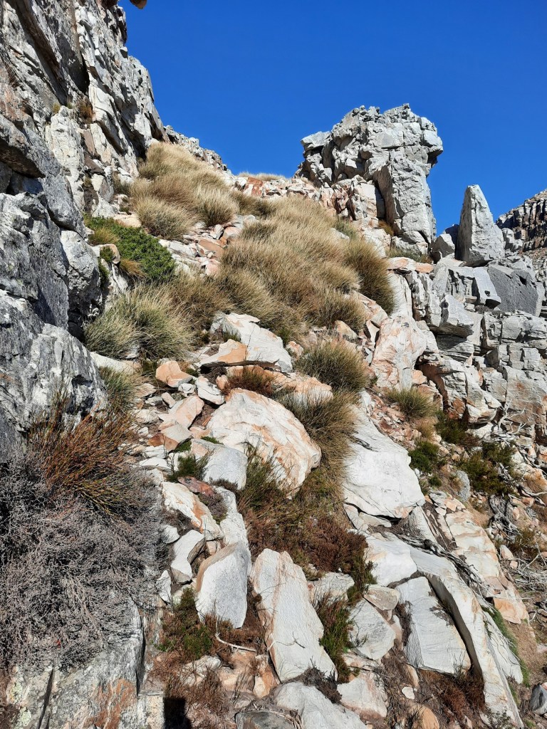 I bumped into a group of four people just below Pulpit Nek. The group included Claire, who was one of the UCT students on my 2020 attempt at a Waaihoek-Thomas Traverse. The 2020 attempt wasn’t her first attempt, so the fact that she had made it this far means she would likely complete it this time – which is always great. They warned me that I wouldn’t see water for a long time. They then very kindly gave me a litre of water that they had been carrying since Perry Refuge – I only had about half a litre left at the time. It had taken them 6 hours to get from Perry Refuge to this point – a distance of only around 4km. It was already 3PM, so I only had around 3 hours of daylight to play with.