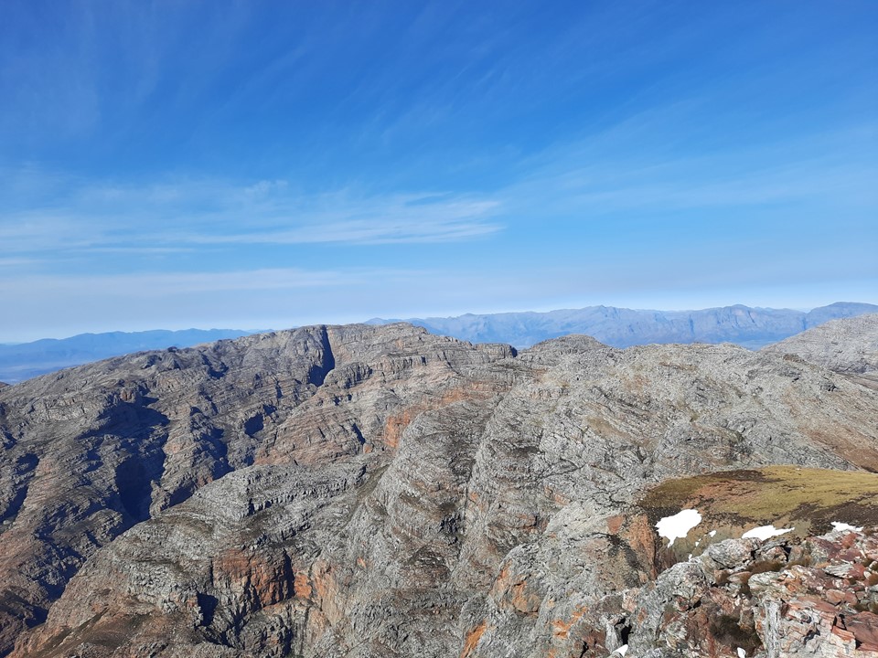 As I got higher, I finally saw Buffelshoek – the peak in this region with over 1000m topographic prominence, and the primary objective for the hike. I was surprised how much snow was on top, seeing as it had been over a month since the last snowfall. I was also surprised to be able to see Saronsberg, the Wintershoek Mountains and even Table Mountain.