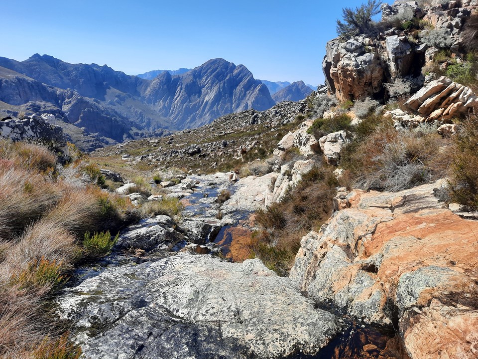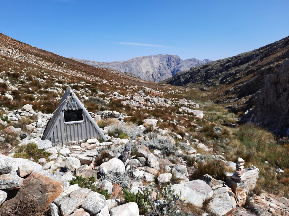 I sat in the hut and had something to eat. My gear was untouched – as expected. The door is designed to be baboon-proof, and there weren’t likely to be any hikers nearby. It was already after 10, so my ascent of Buffelshoek had taken about an hour longer than expected, but it was the primary goal for the trip, and I knew I could always spend the night at Perry Refuge again if required. I also knew that I had started out from Fair Glen the day before around 9 and got here with an hour daylight to spare – so the return hike to Fonteinjies Campsite (a flat spot near water just below the summit) would likely be fine. I also knew that Fonteinjies was ahead of me, and I would sleep better knowing it was behind me.