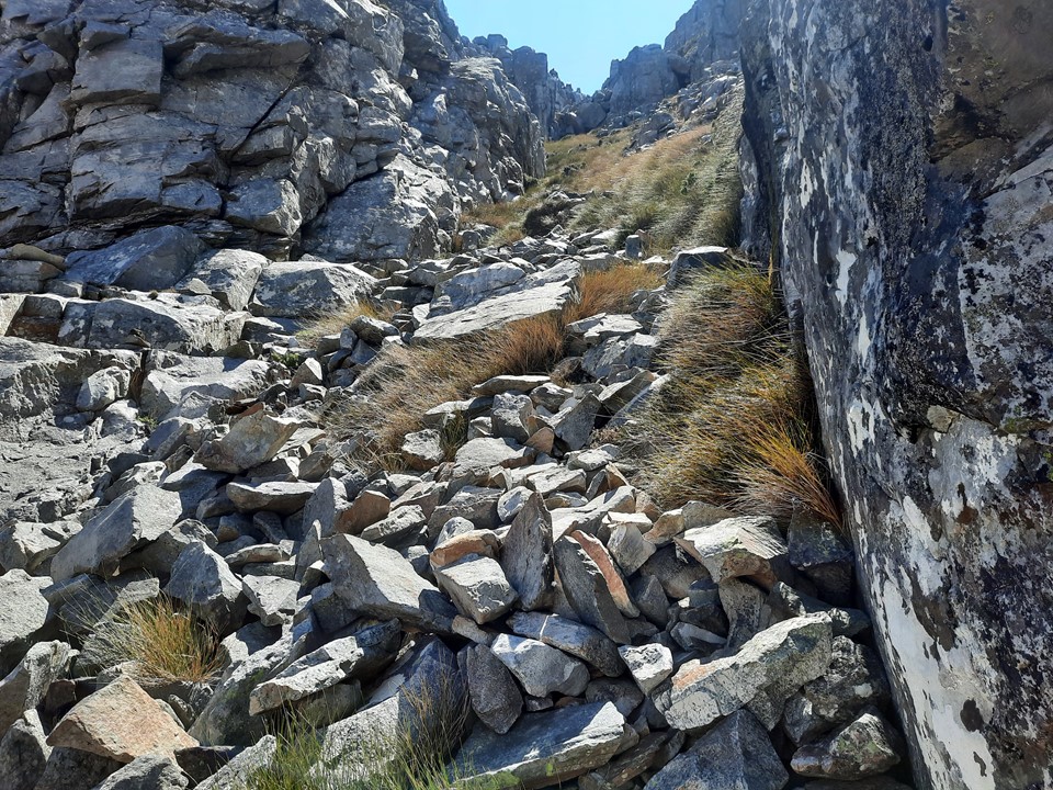 There are frequent cairns, which does make navigation a lot easier. The route starts by descending a steep rocky gully to reach a large grassy ledge. It then follows a different steep rocky gully. The process of switching gaps in cliffs between cliff bands repeats itself consistently. These gullies would vary in terms of difficulty, exposure, how loose they were – but the key was to make sure you could always see the next cairn.