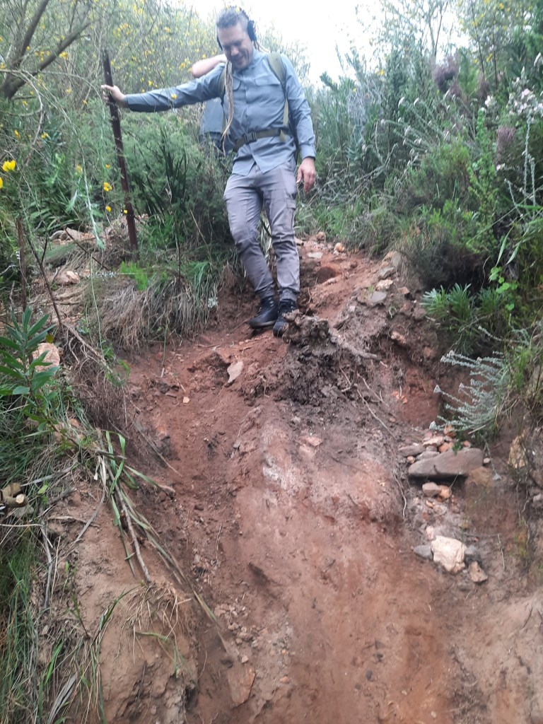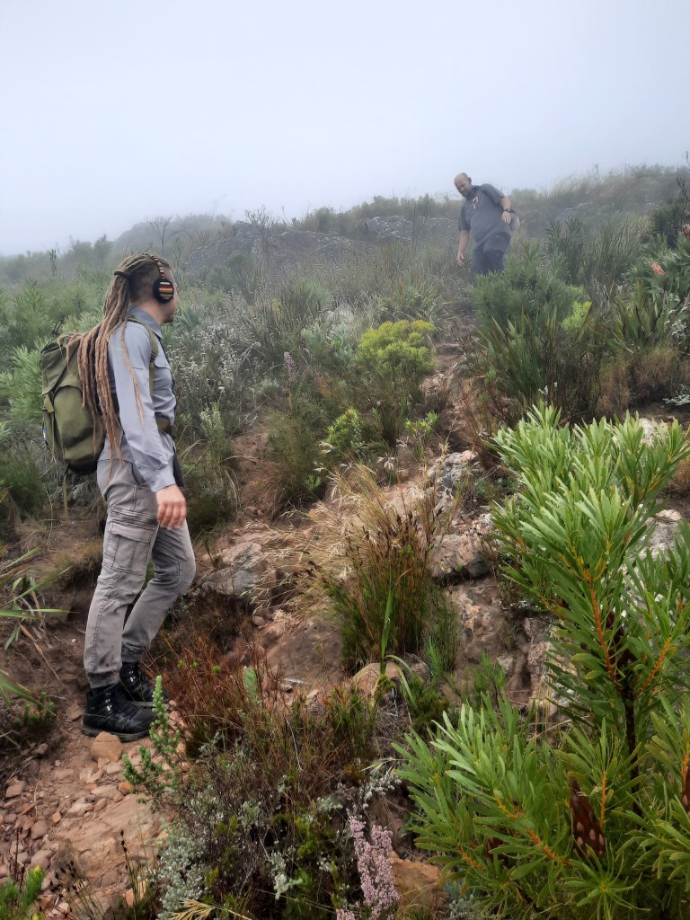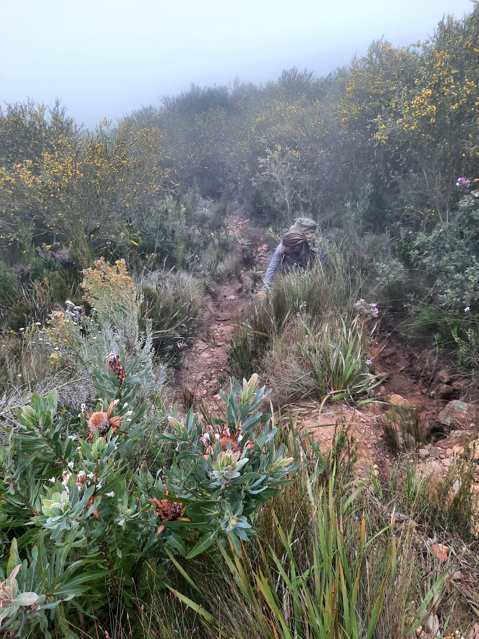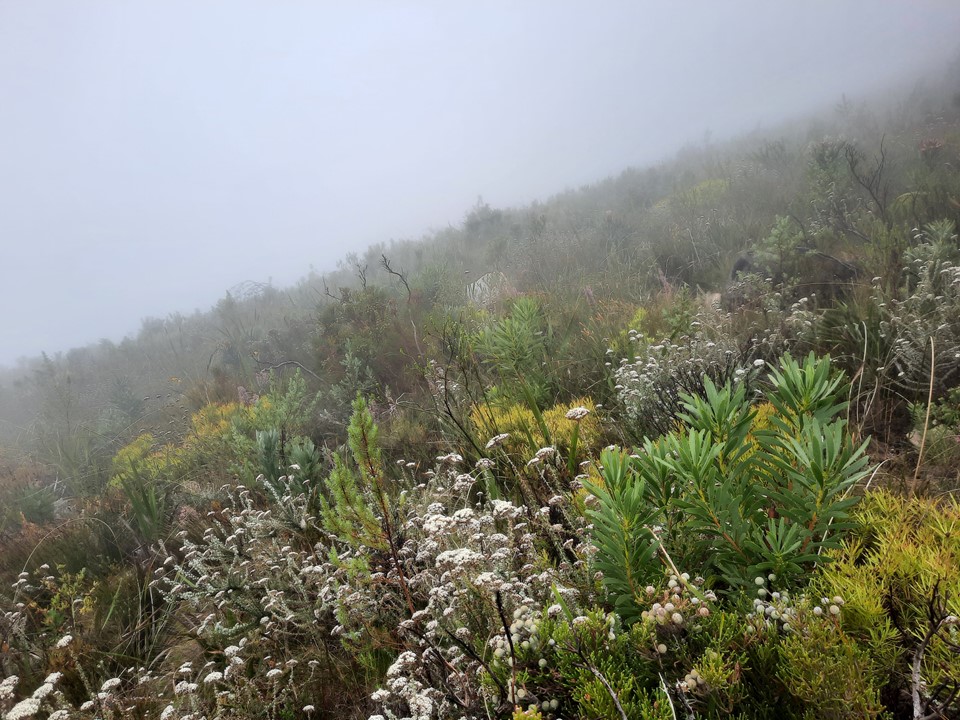 Fairly close to the summit in terms distance (but not elevation), we received a call from Tokora Wine Estate. They informed us that they didn’t deem conditions to be safe and we were to get off the mountain immediately. Technically we were on Cape Nature land and they didn’t have authority to revoke access – but we were in the process of climbing the mountain in the mist and thus wouldn’t get a view in any case. We decided not to argue with them and to turn around – we would all have to come back and climb it in better weather in any case.