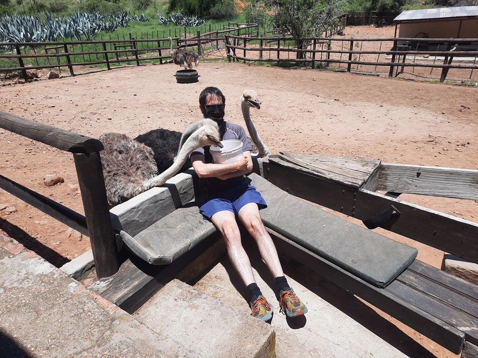I googled places to go in the area and Cango Ostrich Farm came up. Des (my sister-in-law) also suggested this – so I decided to go. The tour was fascinating – well worth doing. It included ostriches eating out of my hand, followed by sitting with a bucket of food while the ostriches ate over my shoulder.