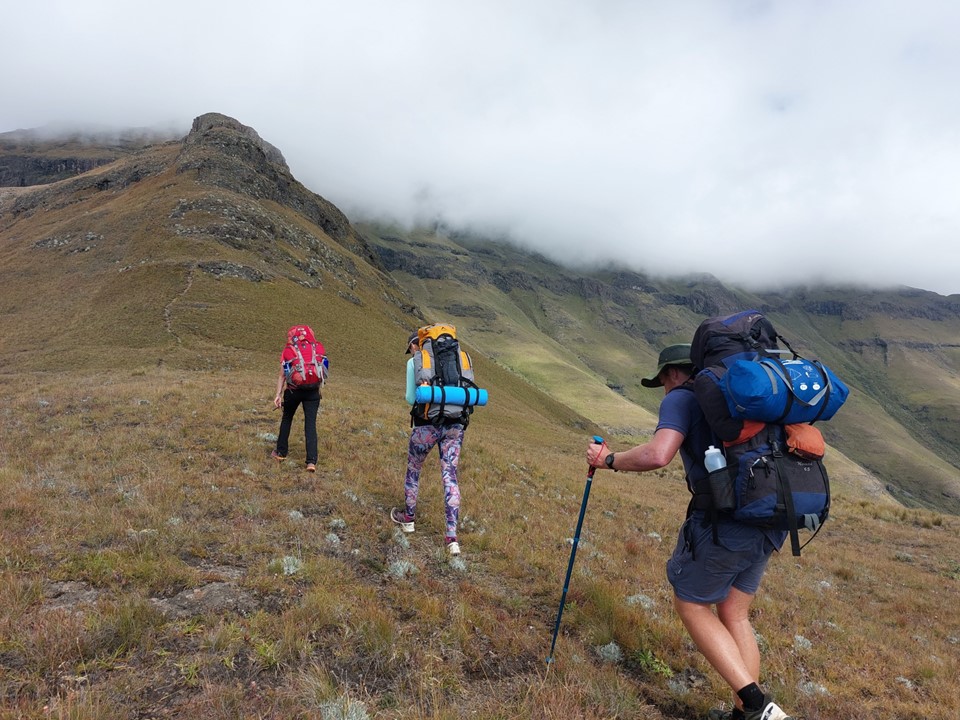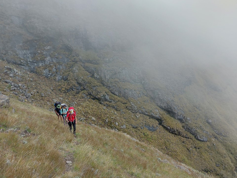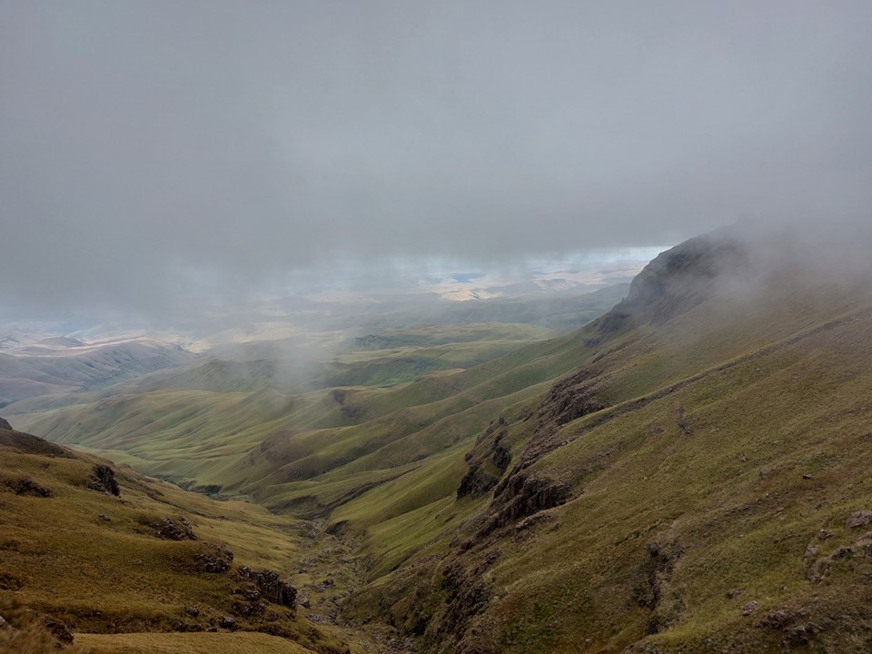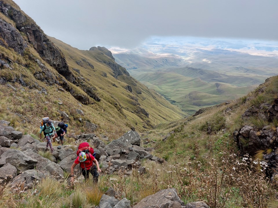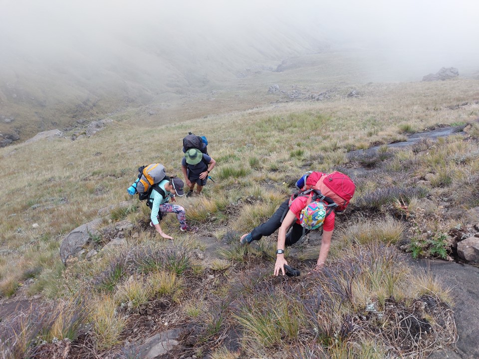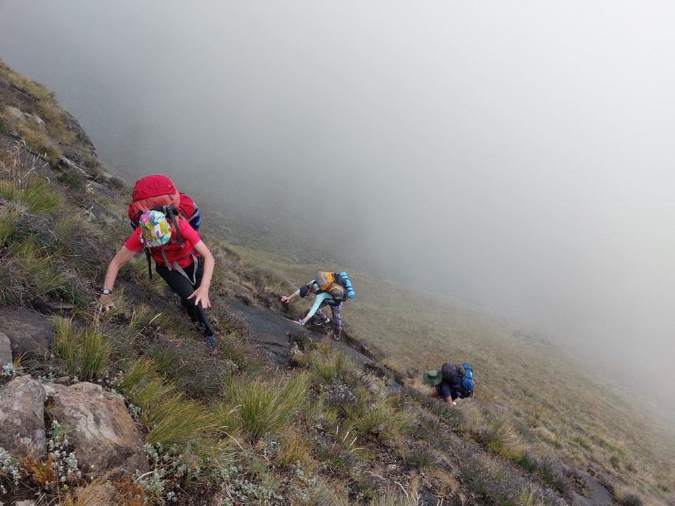 We topped out on the escarpment in the mist. We made our way to the river and stopped for an afternoon lunch break. The pass had taken longer than I expected, but the group was strong and everyone seemed ready for the final slog up the Mafadi Ridge to Upper Injisuthi Cave.