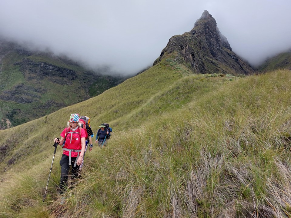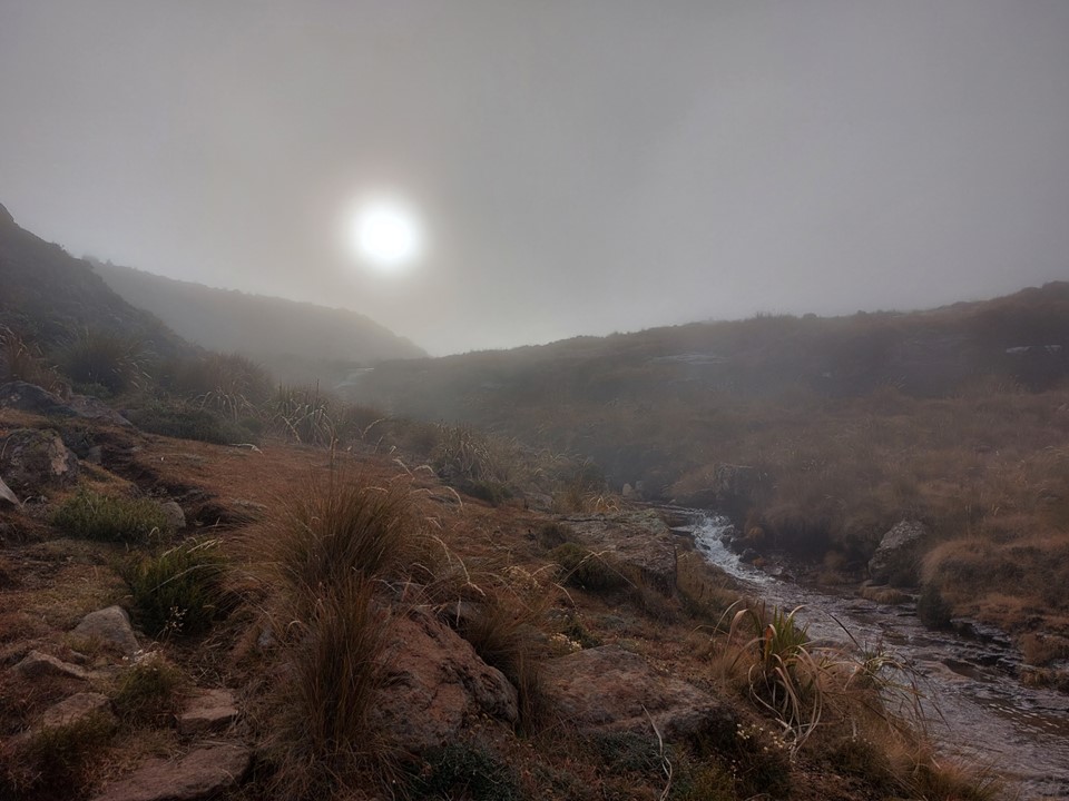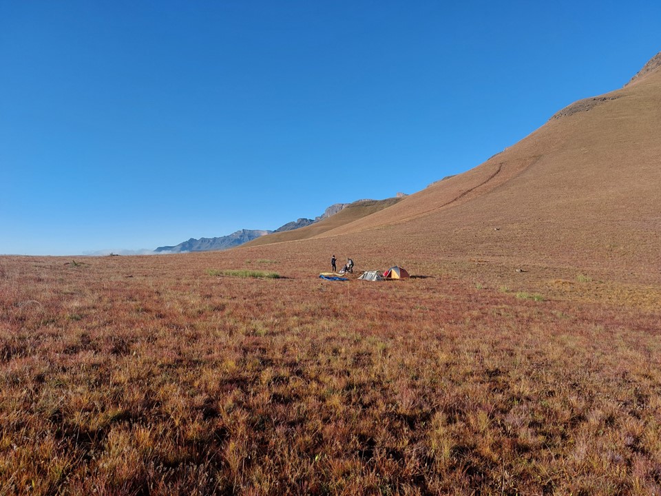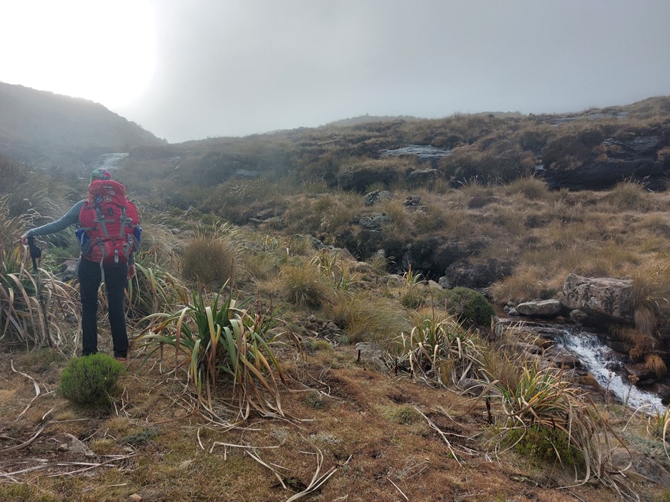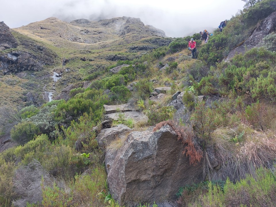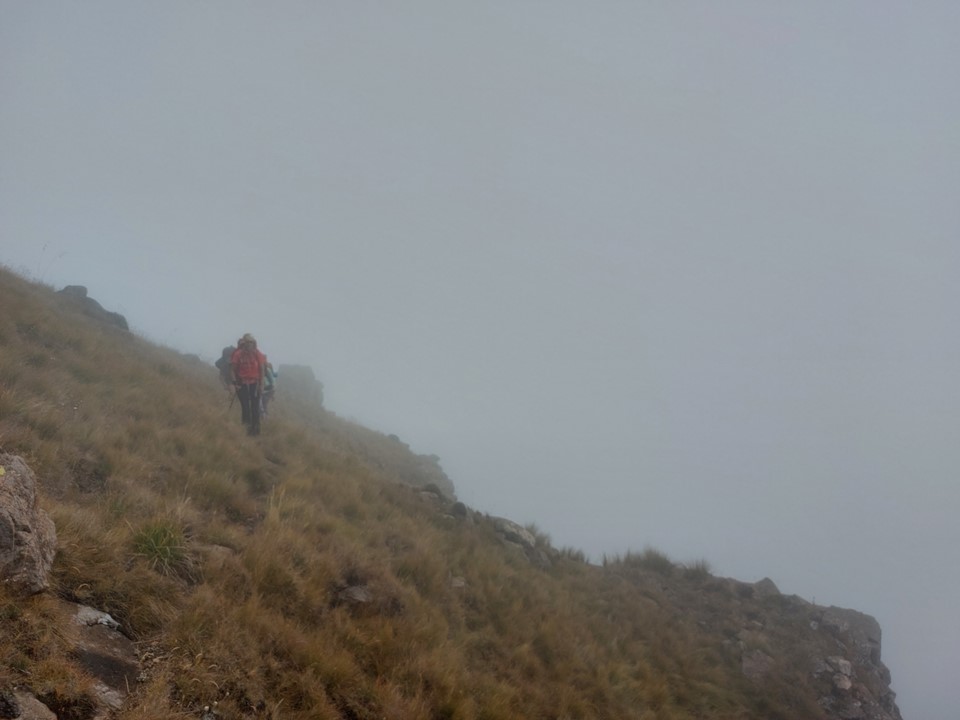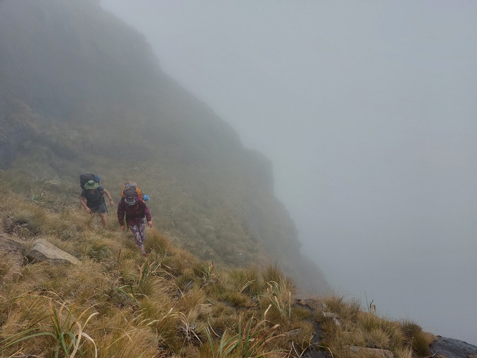 We topped out on the escarpment in the mist. We made our way to the river and stopped for an afternoon lunch break. The pass had taken longer than I expected, but the group was strong and everyone seemed ready for the final slog up the Mafadi Ridge to Upper Injisuthi Cave.