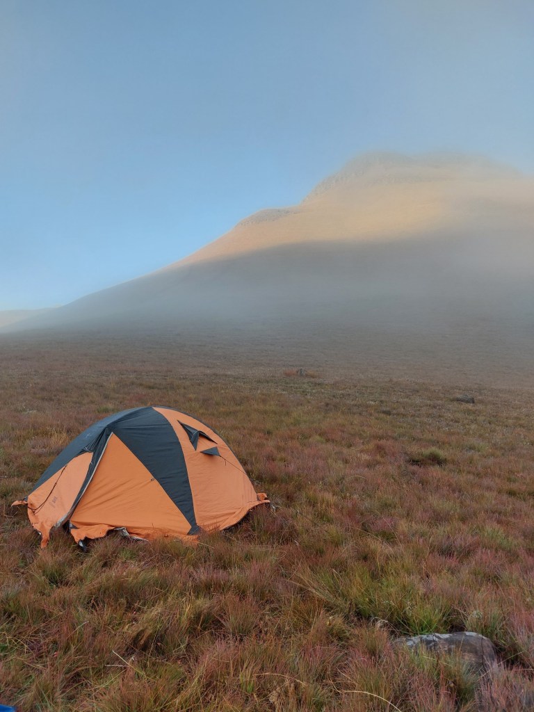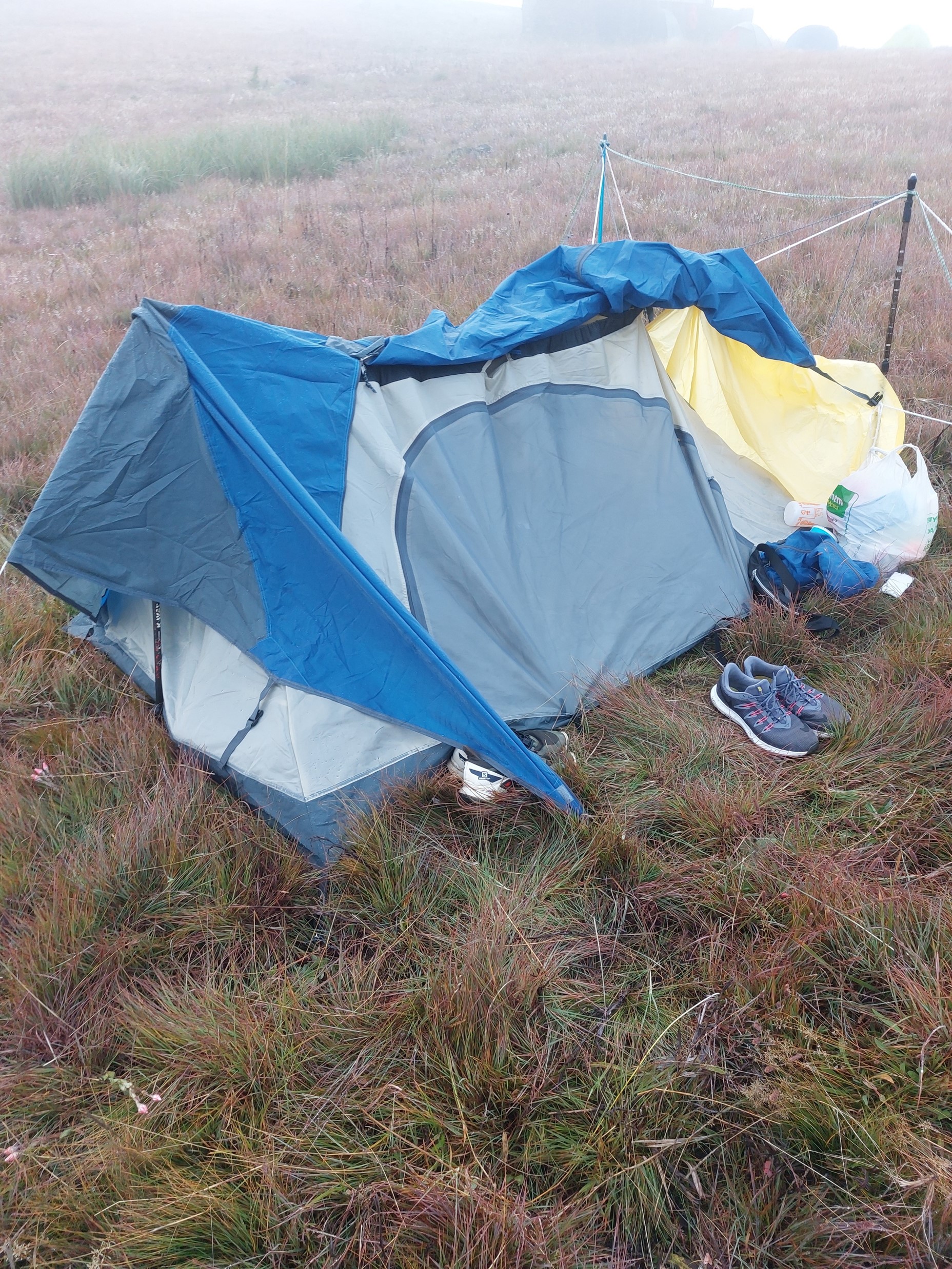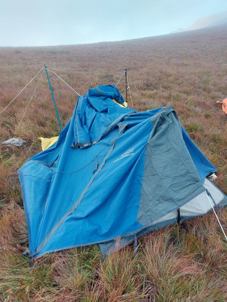 Luckily Tim sprung into action, and while I was off collecting water for everyone, he came up with a design using trekking poles and ropes to secure a tent in place. Luckily it wasn’t particularly windy and didn’t rain too much that night – and the tent held perfectly. Although Tim did have to get up a few times during the night to ensure all was in order.