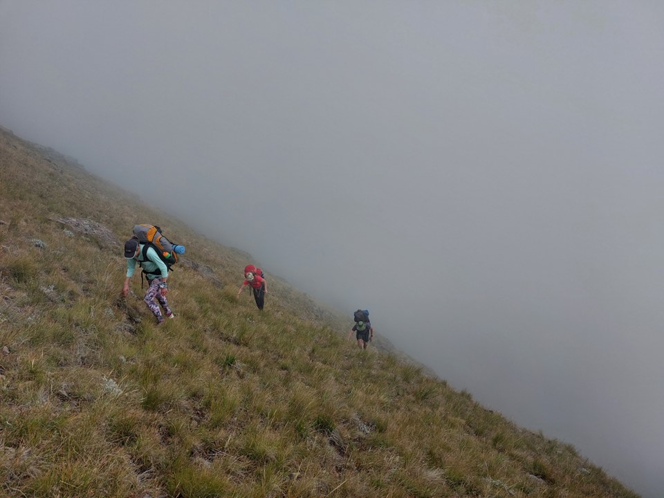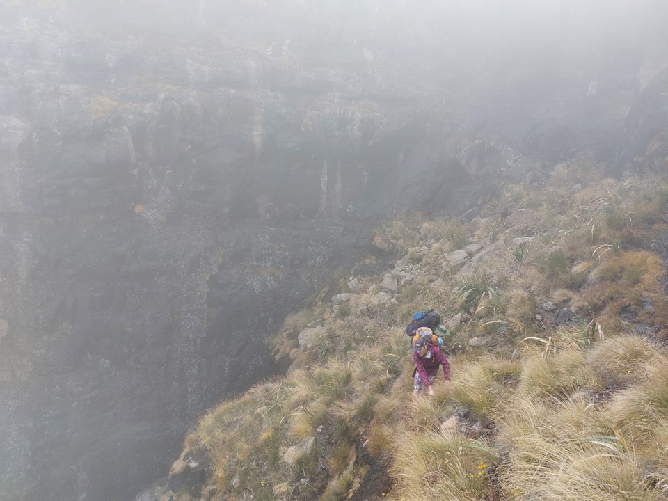 Nonetheless, everyone got up fine – no stress. The last time I did this pass we took a wrong turn between the second and third scramble and ended up taking a very exposed summit line. I was determined not to make this mistake again, despite being in the mist now.