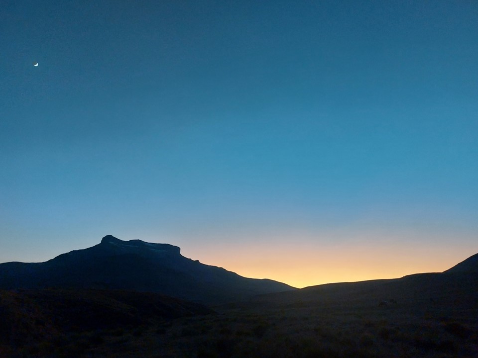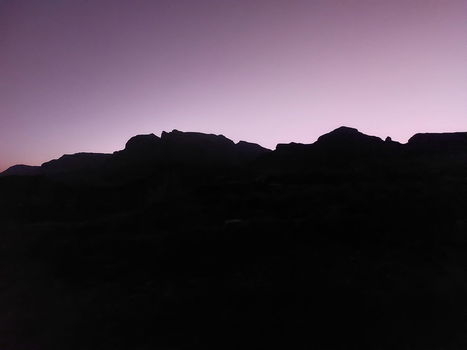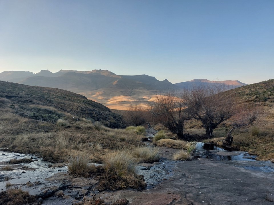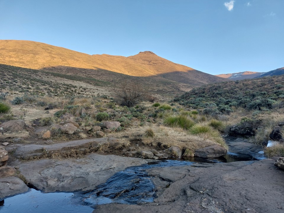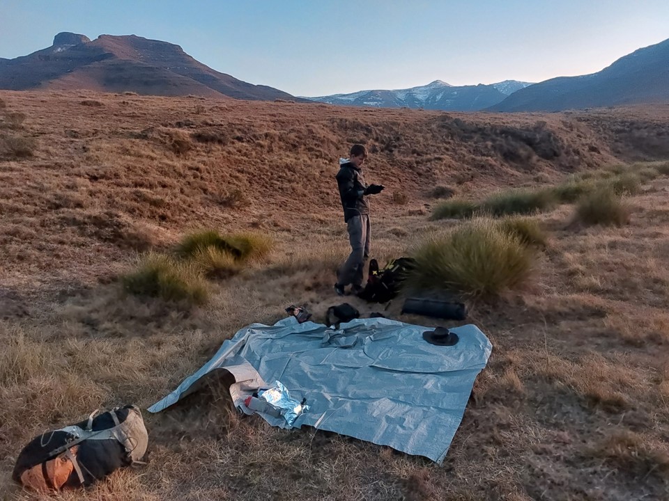 The sun went down between Thamathu Cave and the top, and we were under headlamp thereafter. With a GPS track following Lesotho paths, navigating unknown ground in the dark didn’t prove too difficult. We managed to get around 4km into Lesotho before we hit the turnoff from one trail to another. We found a flat spot near water but off the trail and pitched the tent there.
