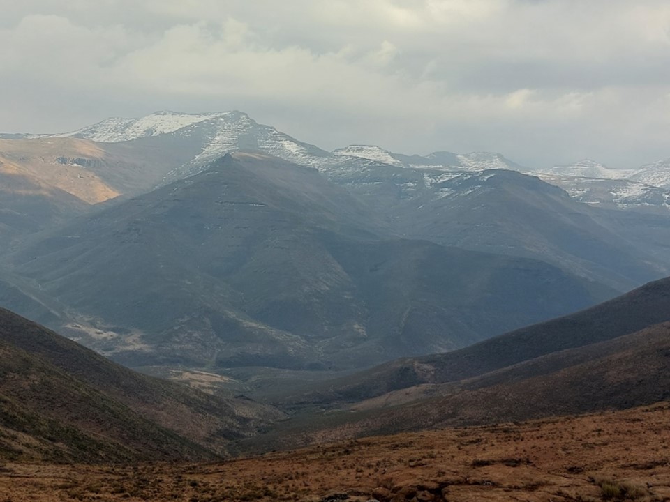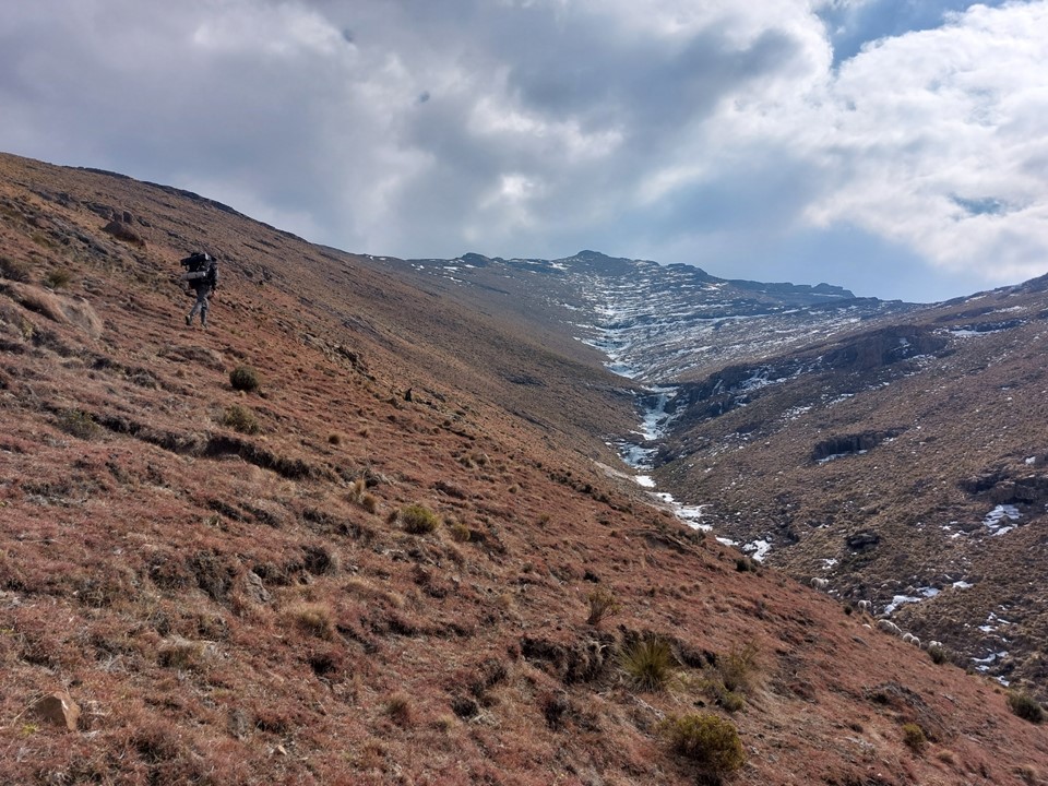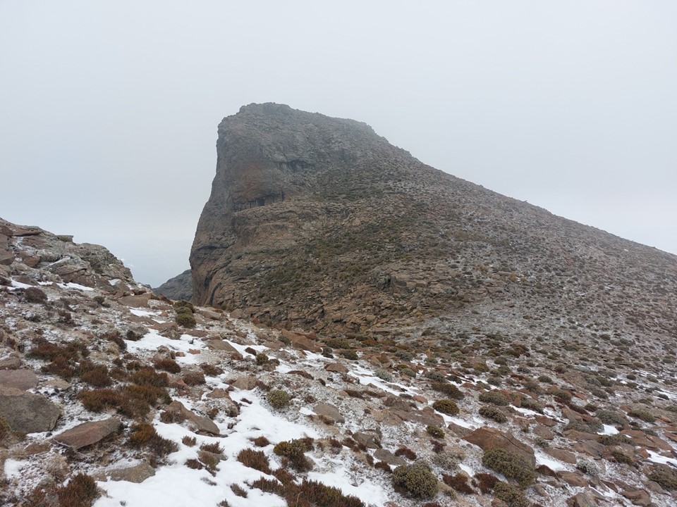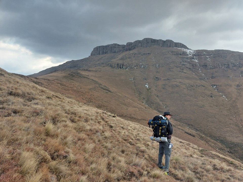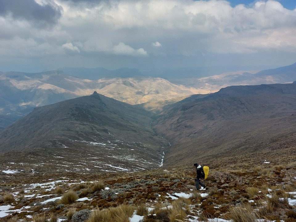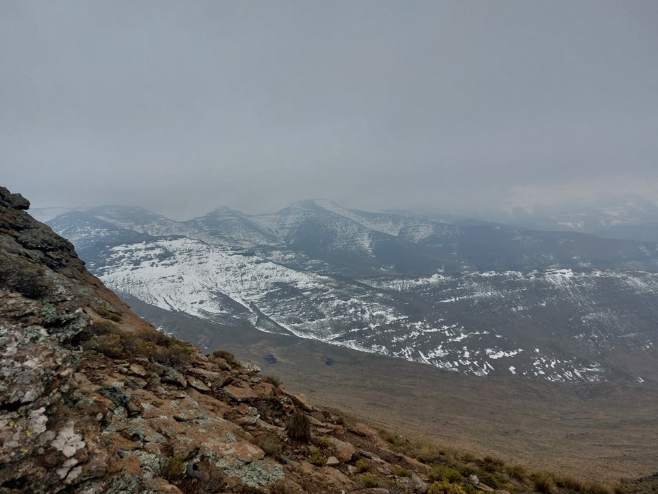 Reaching the saddle was a bit like getting slapped in the face! Makoaneng was straight in front of us, and it was enormous. The snow on the ridge provided some amazing views, but we could also see that this ascent would not be trivial.