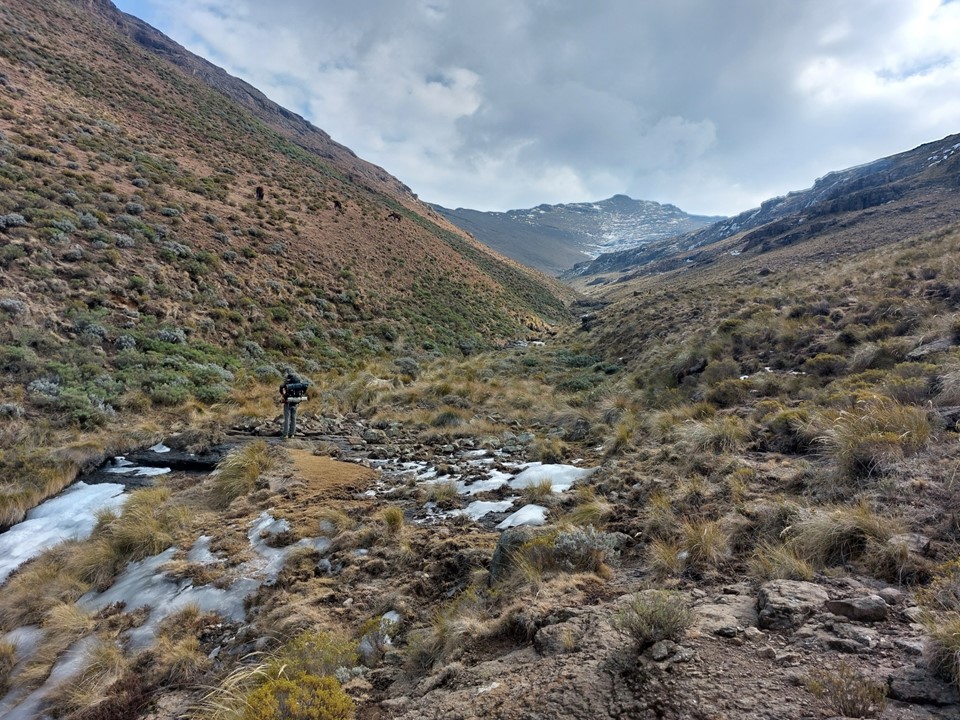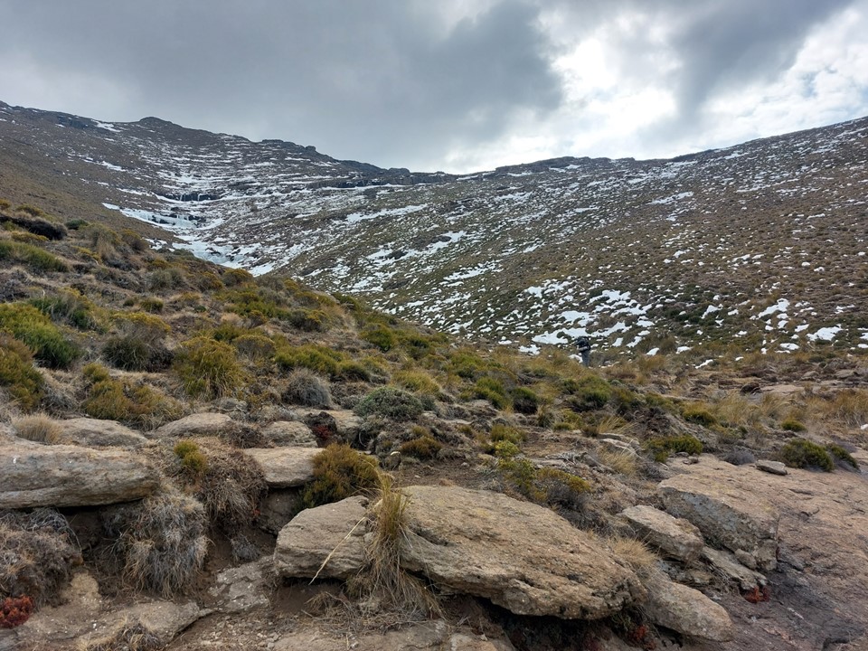 The peak remained on my mind for years, and I knew I would inevitably have to climb it at some point. In 2018 Mike and I set off for Bushmans Nek on a Friday afternoon, but with a deep puddle across the road, we turned around and went to Garden Castle instead. We ended up starting later than planned on Saturday morning, and hiking up Rhino with a Canadian named Zuzka instead. While our intention going in was Makoaneng, by the time we left the car park we already knew the peak was off the table – although we did climb Tsepeng (3431m) that weekend, which was my second time on the highest point of the Leqooa Ridge.