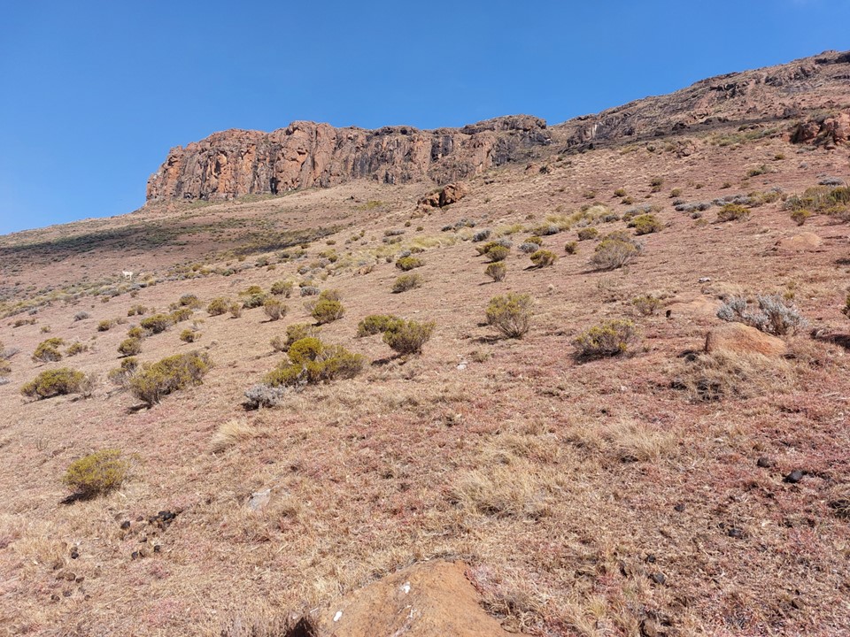 The lower section included a trail past a kraal, followed by a very eroded trail up the lower slopes. The trail soon died, and we found ourselves walking through overgrowth trying to hit the river that flows down the east slopes of the peak.