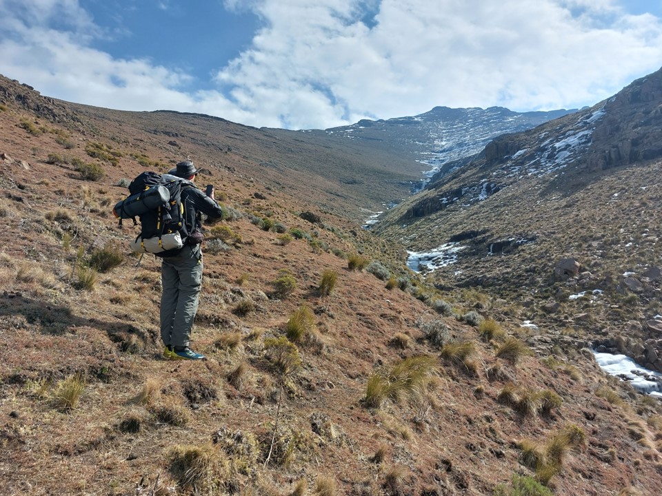 We started to make our way back down the gully we had ascended. It was already around 2PM and the ascent had been much harder than expected, or perhaps I was not as fit as I had hoped. In my defense, I was carrying a full winter pack with half a tent – and had just lugged all of that to the summit of the 4th highest mountain in Southern Africa!