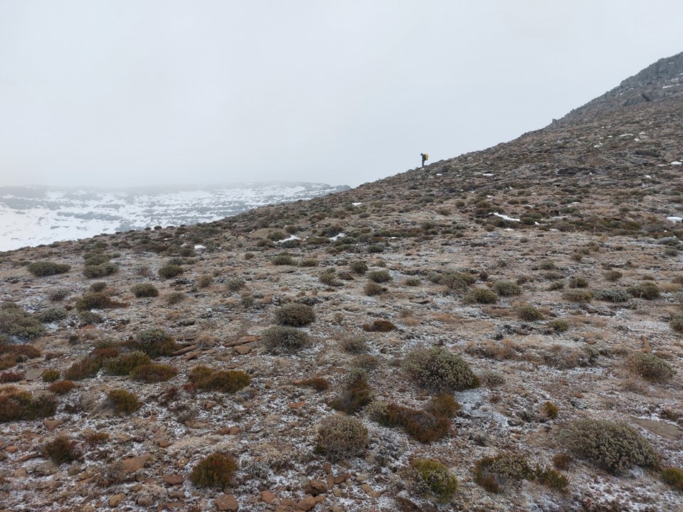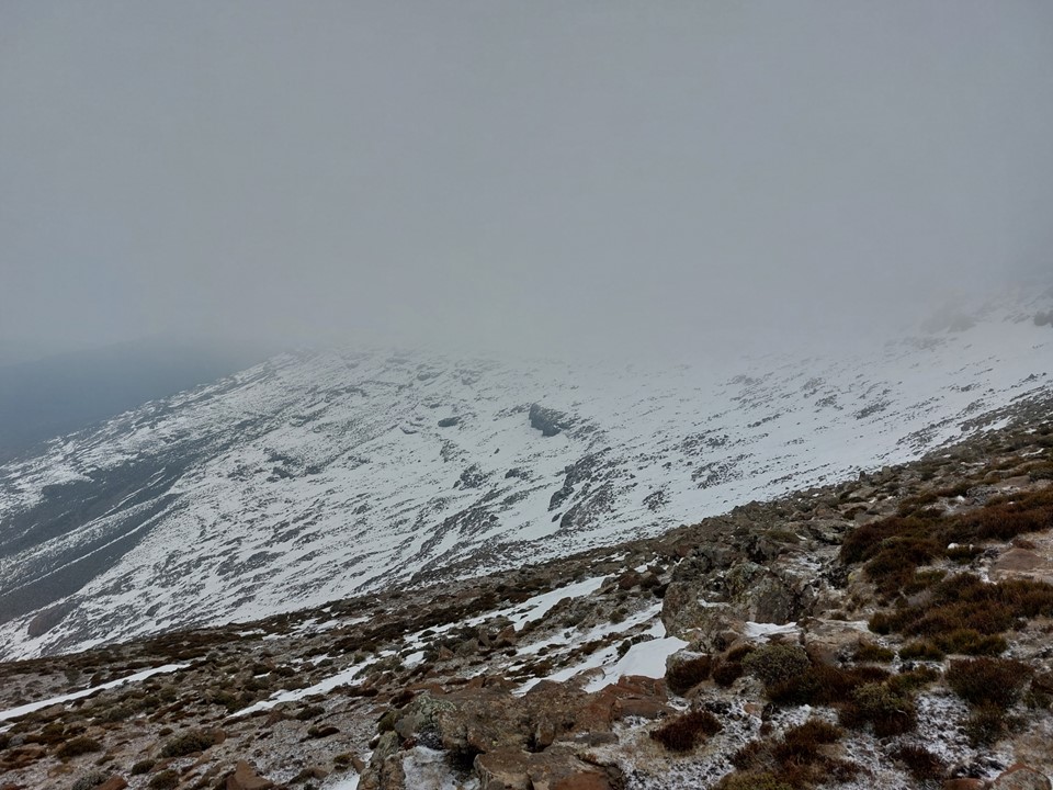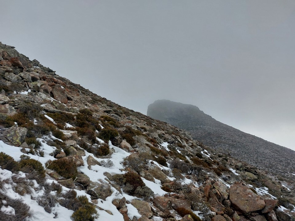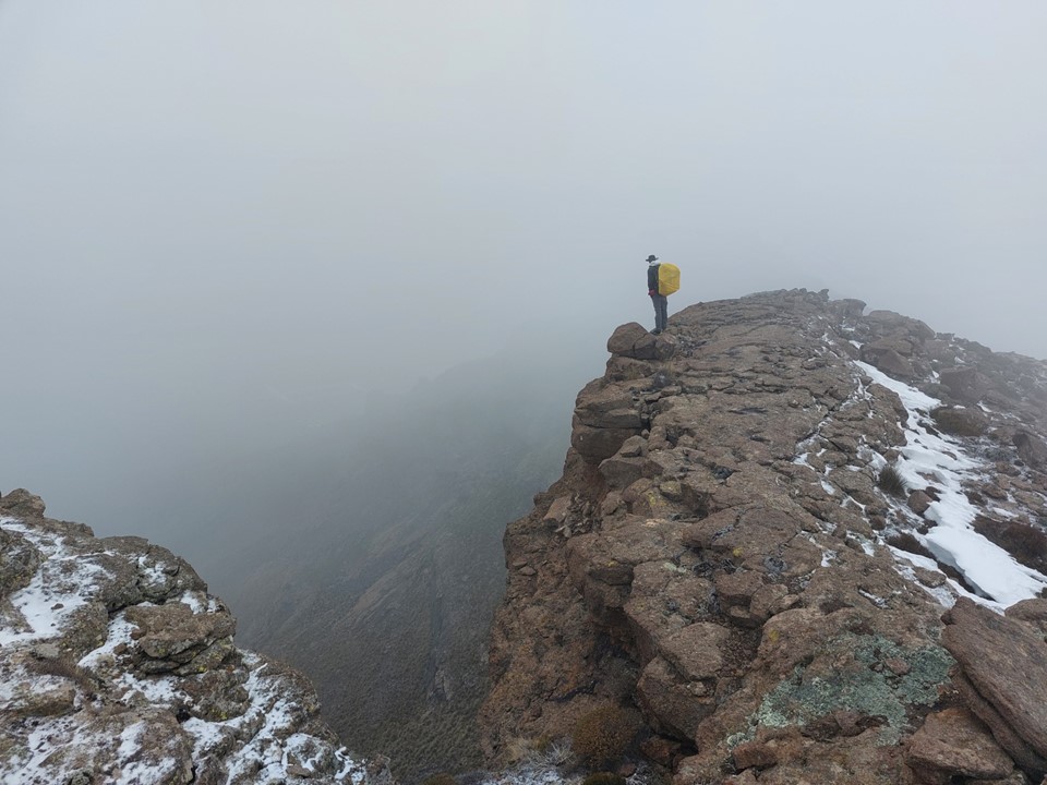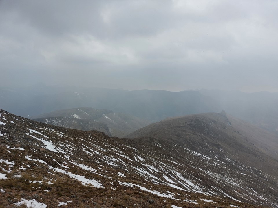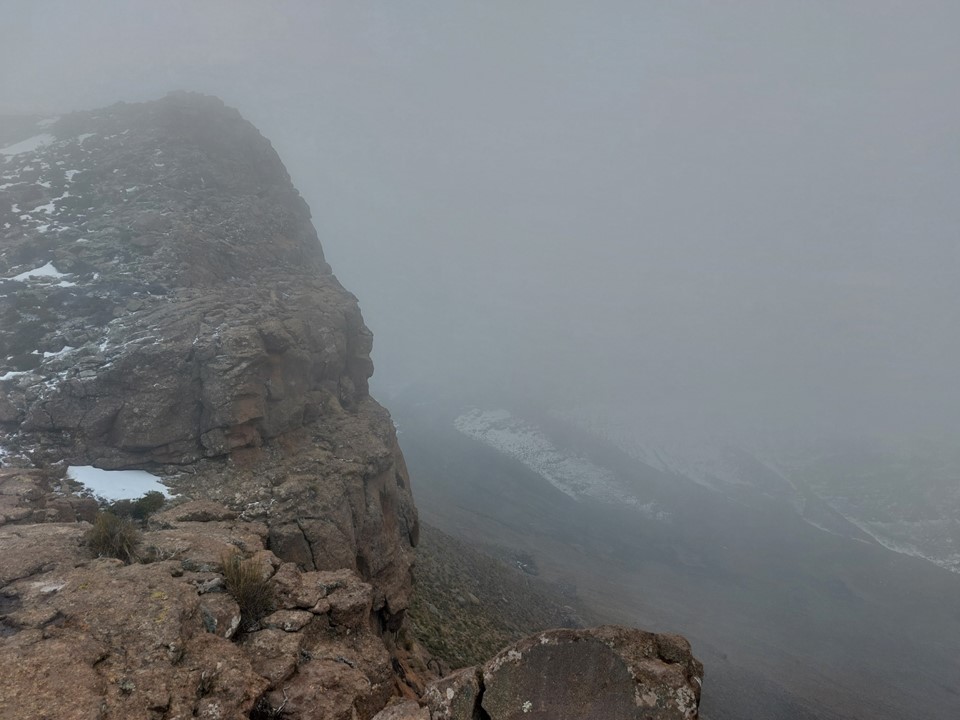Snow and loose rock on a steep slope is never easy ground – so the final section to the top was harder than expected. We had a small gap in clouds when we hit the saddle between the false top and the main summit – which gave us a feeling of how high we were. Unlike most Drakensberg peaks, this one is on a reasonably narrow ridge, meaning the views in clear weather should be exceptional. The summit also isn’t that far from the Senqu (Orange River), although that wasn’t visible in these conditions.