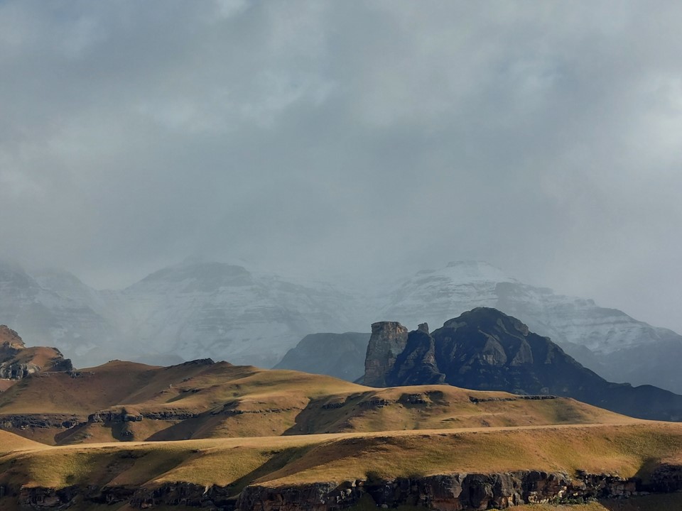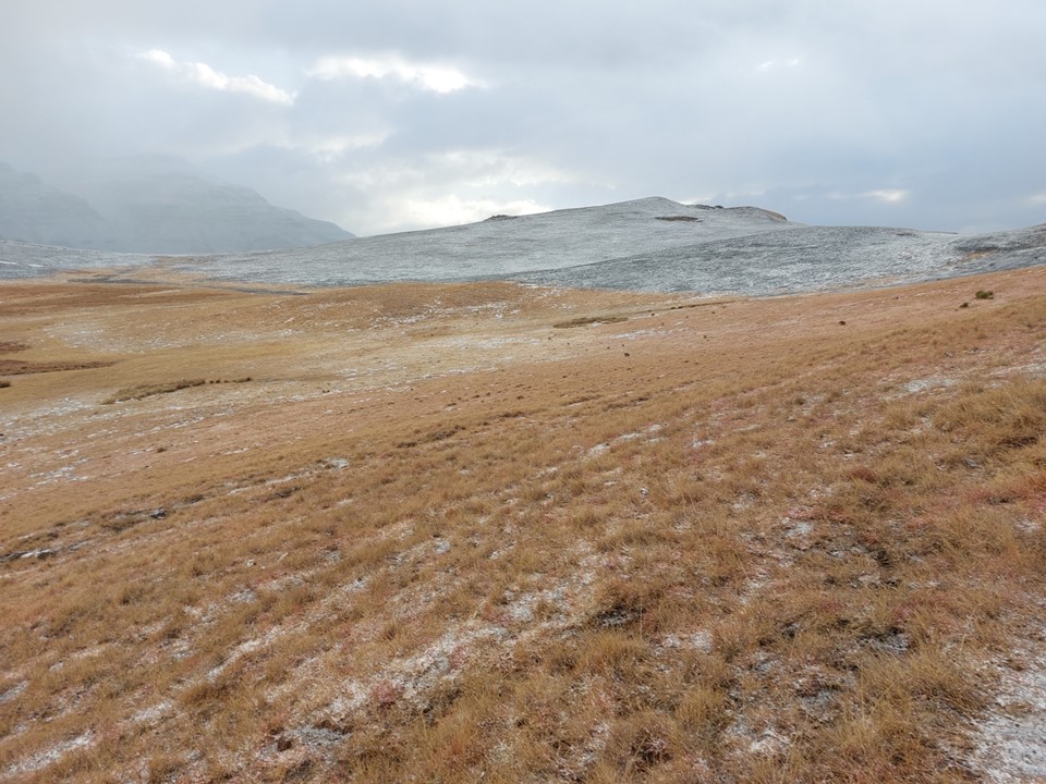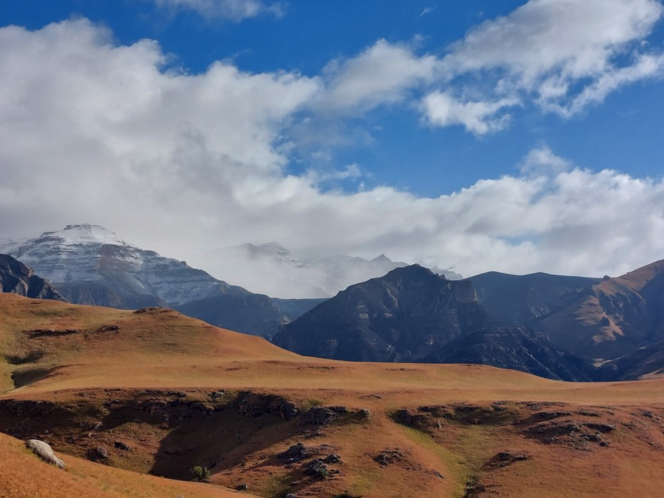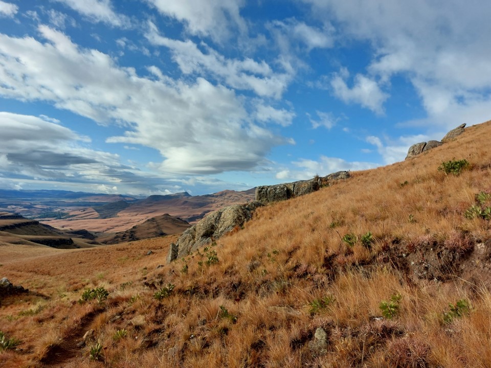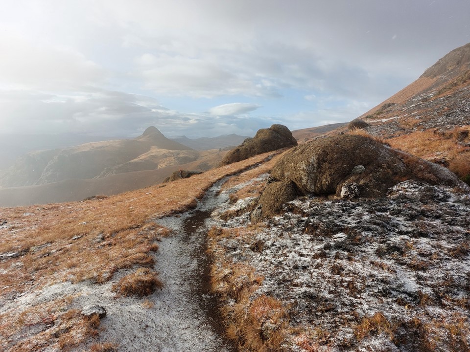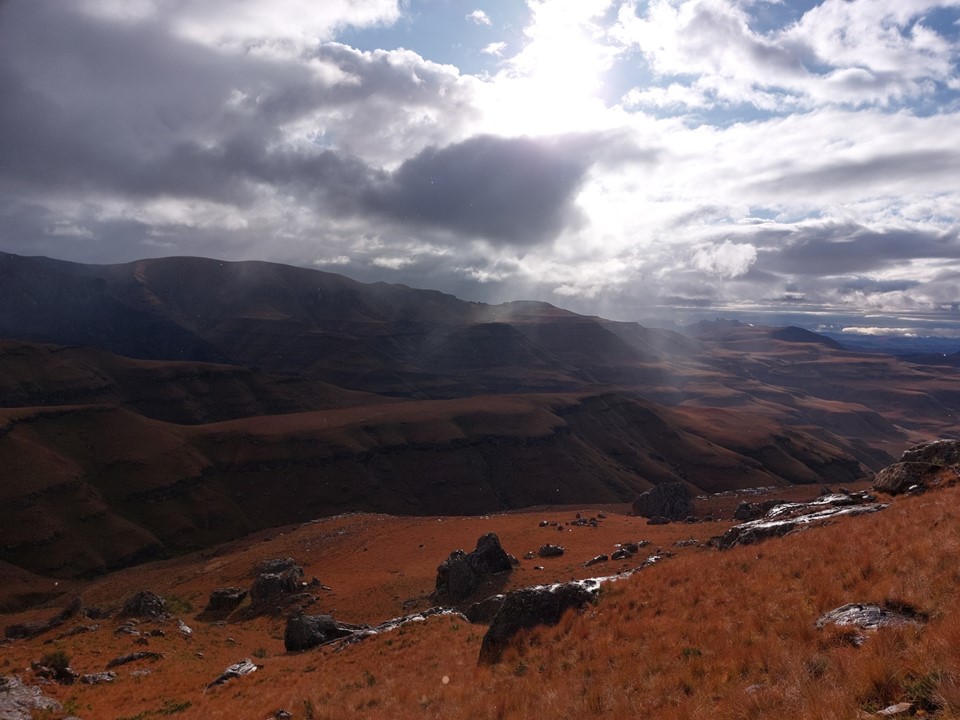 We found short sections of trails in places, and there were a few animals on the way up, but we mostly had the mountain to ourselves. Clouds looked ominous, but we had all our gear with us and thus knew we would likely be fine if anything went wrong. Then again, mountain rescue won’t collect you that far into Lesotho, so we knew we had to be extra careful.