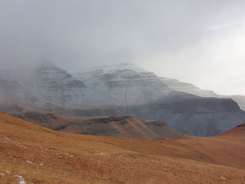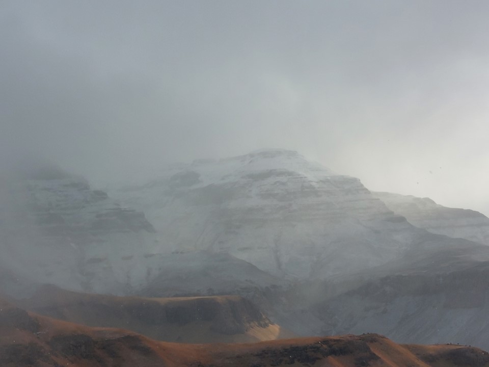 As we rounded the corner, the view of the top covered in snow was really impressive! Cloud was coming in, and it had started snowing.