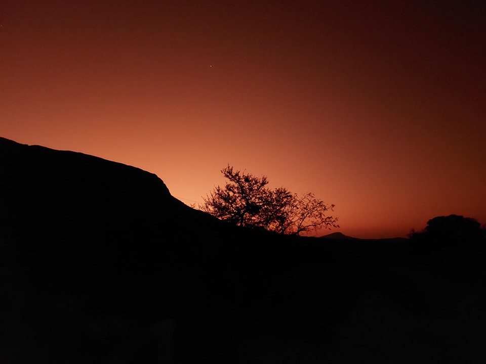 So instead we camped by the side of the road. Being in the middle of nowhere, we didn’t assume we’d have any problems. We did have a number of animals eying us out, we could only see their eyes so identification wasn’t really possible, though. It is notable that there are lions in this region (although we definitely didn’t see those), and we were aware that all the game fences on the opposite side of the road were aimed at keeping animals on our side of the fence. Nonetheless, the worst aspect of this night was how hard the dirt road actually was – a tent peg wouldn’t go into the ground, and it was like sleeping on concrete even with an air mattress.