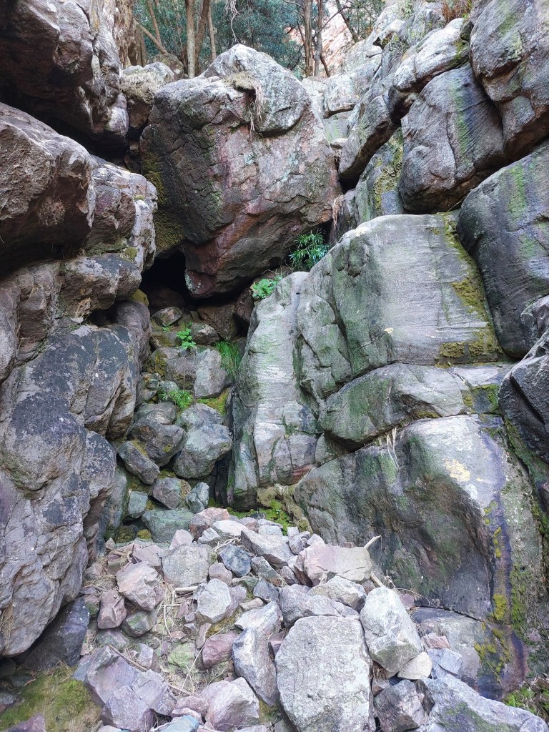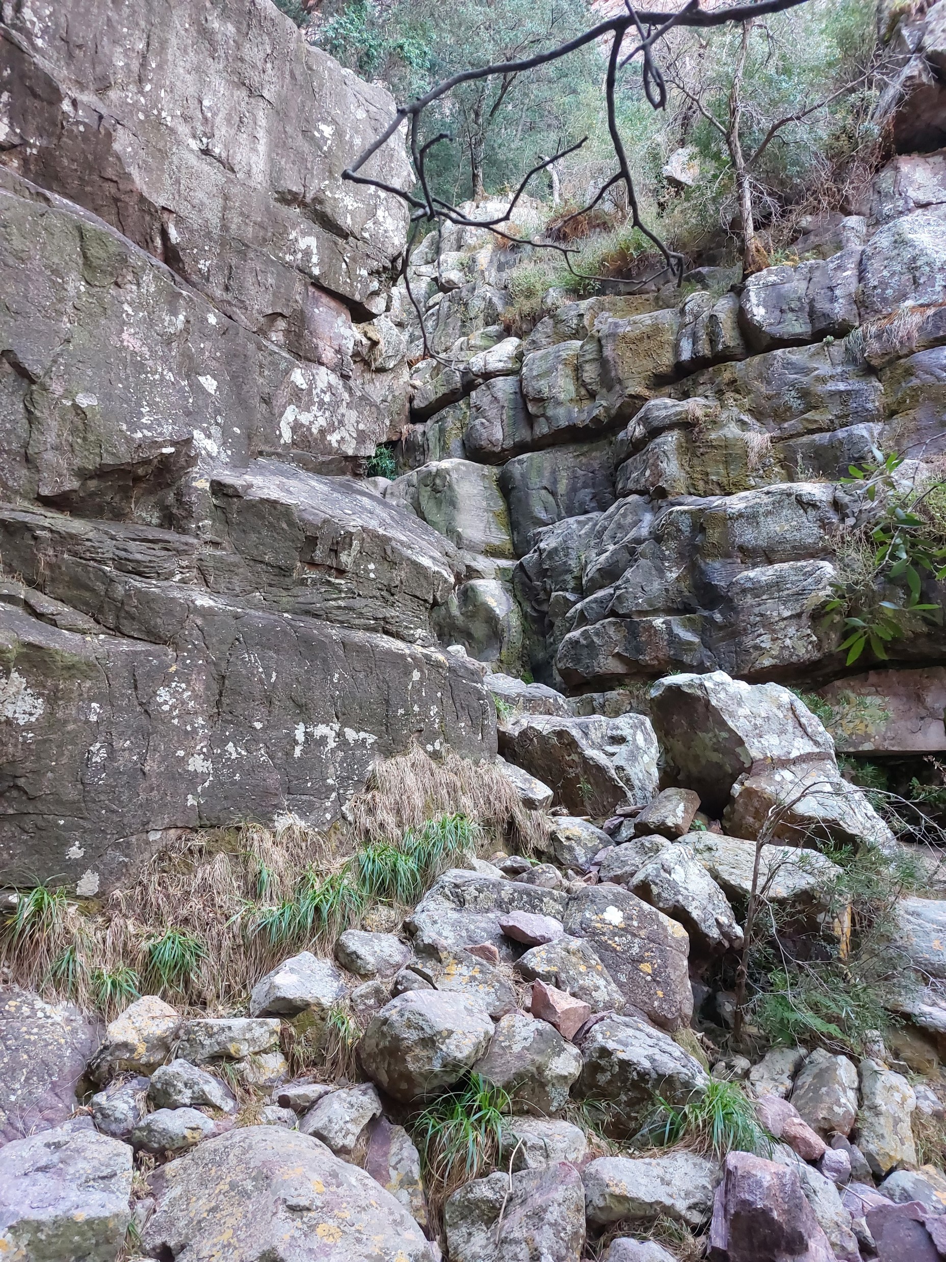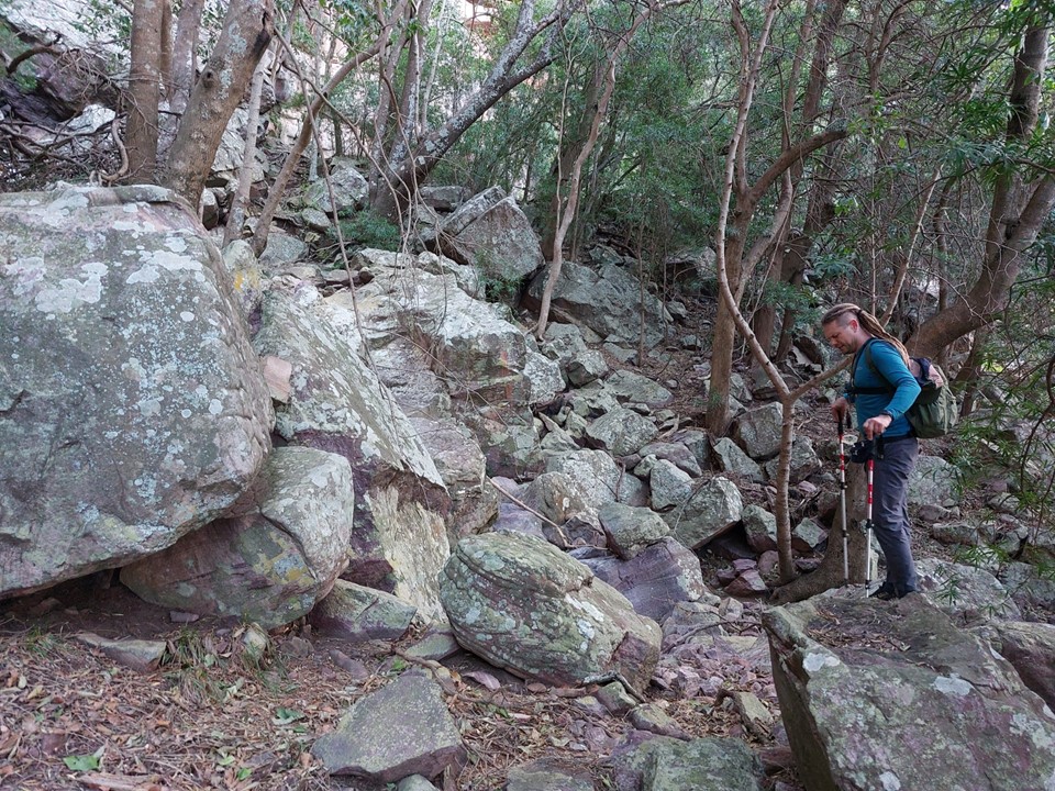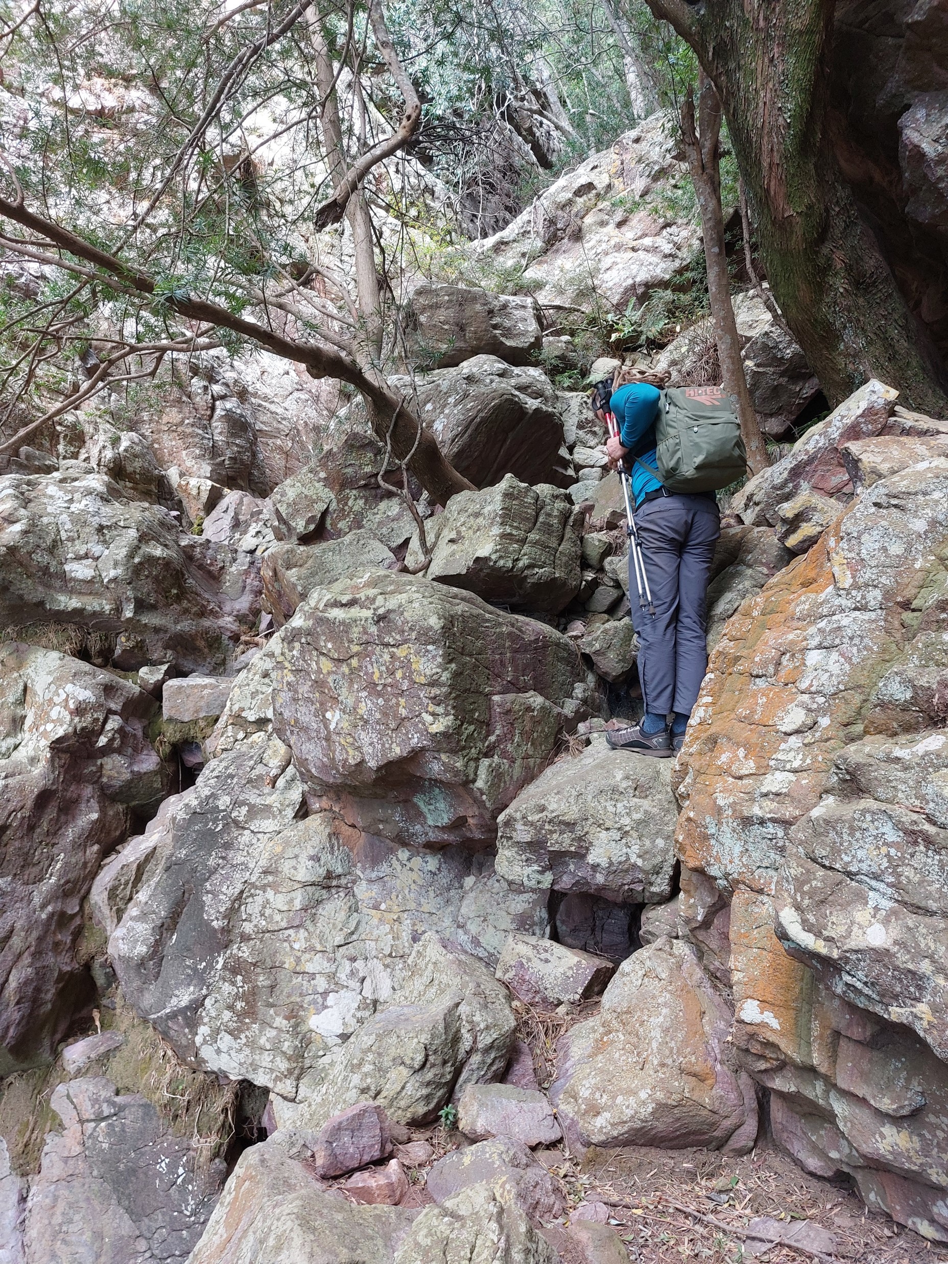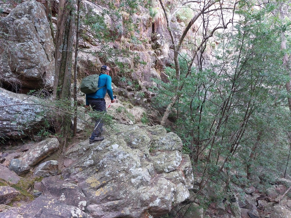 The above photo of the crux doesn’t really capture what its like. The sequence is about 5m high, with the bottom 3m being really easy. The final move requires a fairly big step up on off-balance moves with a boulder above in the exact wrong place to ensure your balance is off and no useful hand placements. It is just high enough that a fall could end badly, and just awkward enough that a fall could happen. We hauled packs up this section to make it a bit easier.
