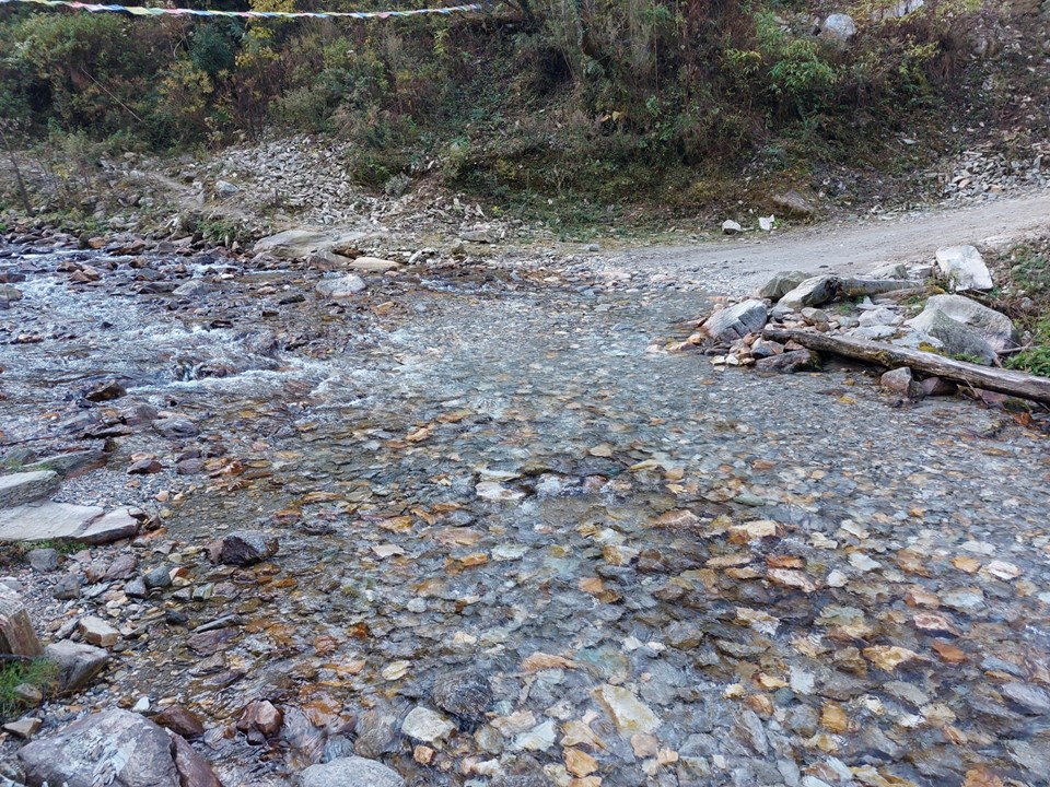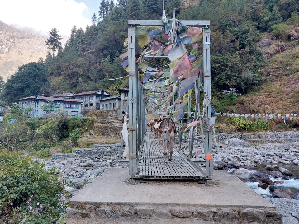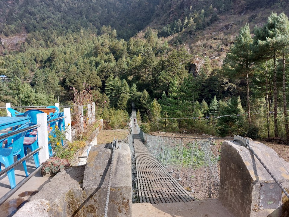 There is a network of roads and trails through this region. The trails are more direct, but frequently cross the roads. Finding where the trail leaves the road on the opposite side isn’t always easy. As it turns out, there was a multiday staged trail race through the region at the time, so upon hitting the road just before crossing the Dhudh Kosi River, I actually passed the water table for the runners. It was funny – I would see these tables daily between the start and Tengboche, as the daily sections on the race were similar to my daily itinerary.