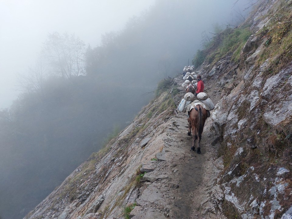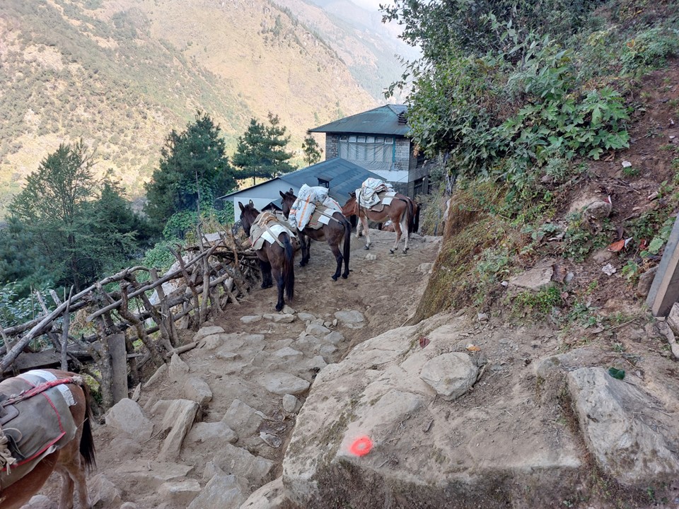 A local coming the other way asked me where I was spending the night – I said Paiya. He looked at me and said it was too far, I must go back. There wasn’t much daylight left, so I took his point and realised I needed to get past the mules. On a steep uphill section, I decided to find whatever energy I had left and power up, naturally staying between the mountain and the animals so I would not be pushed off, and eventually was out of breathe, but at least I was now in front of the mules.