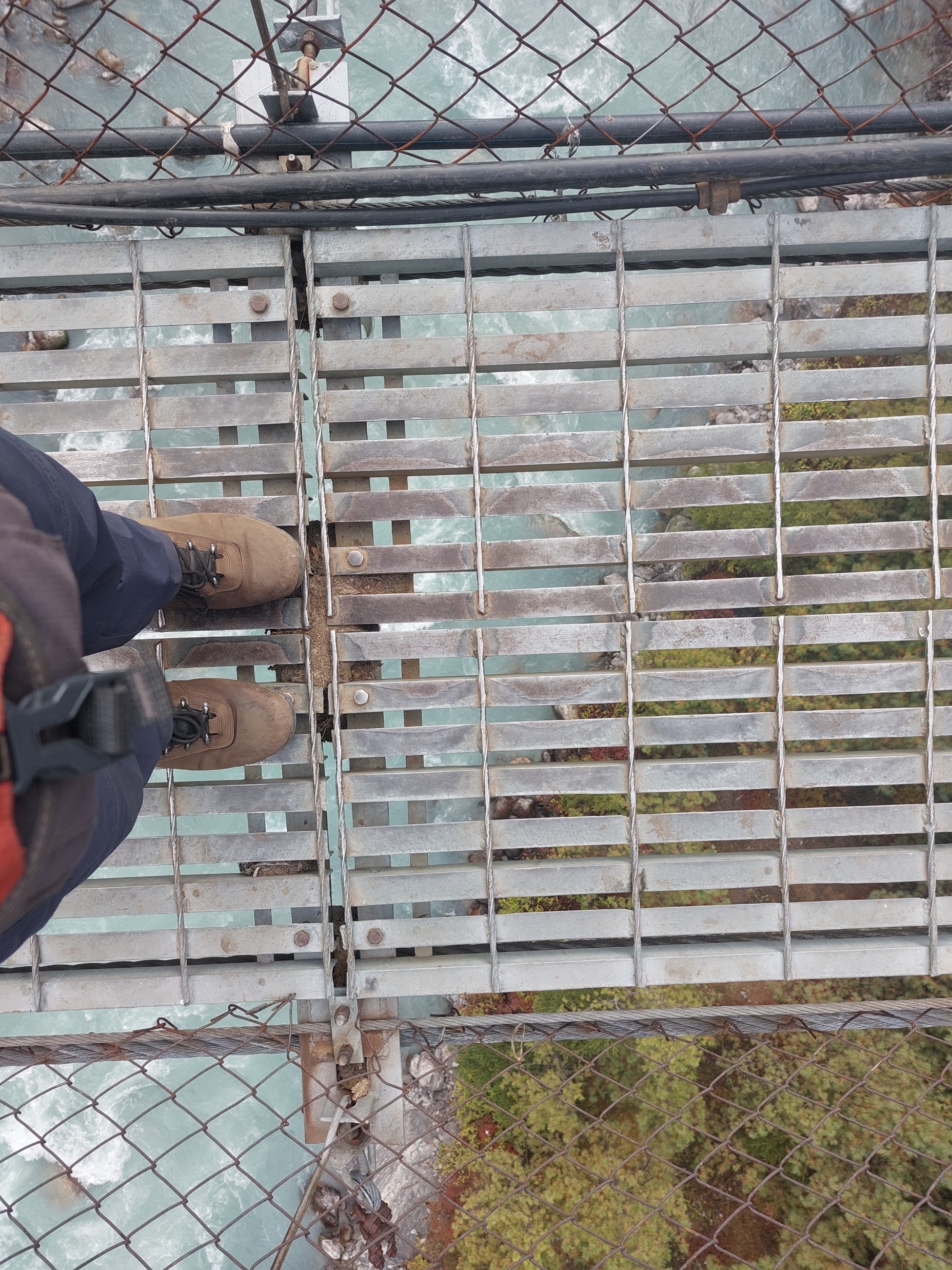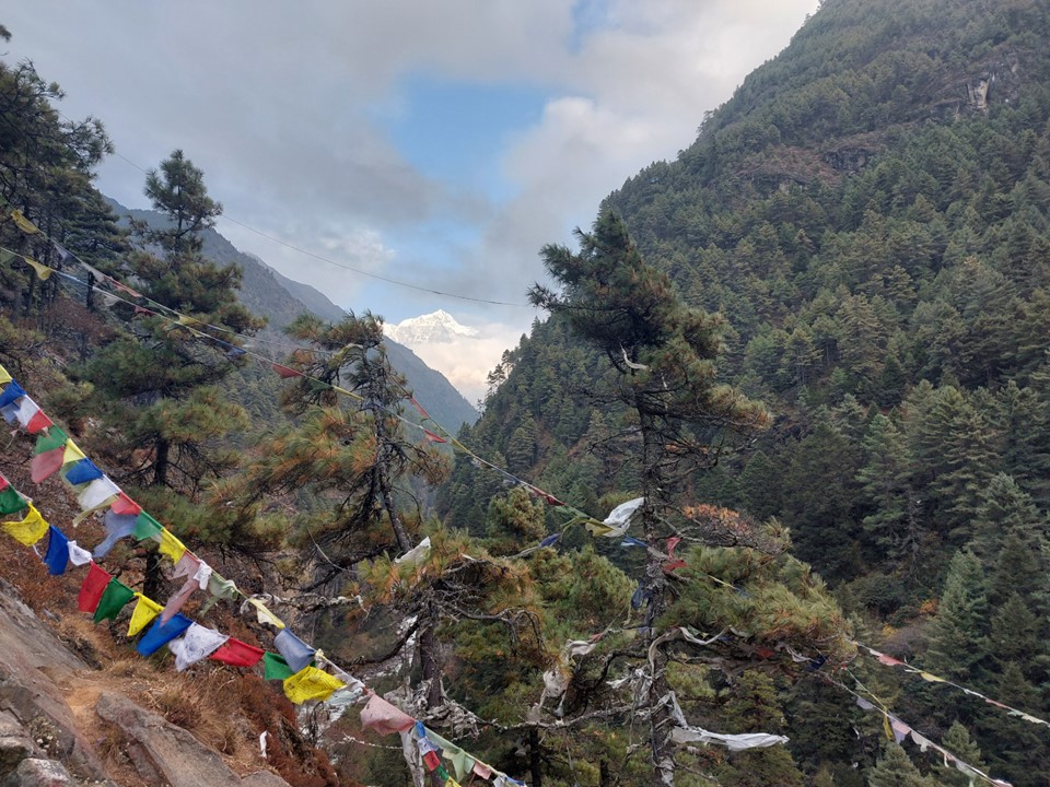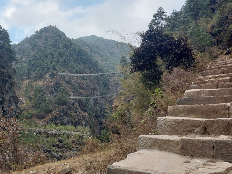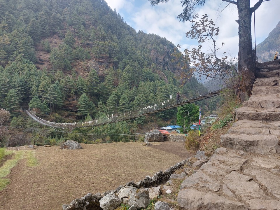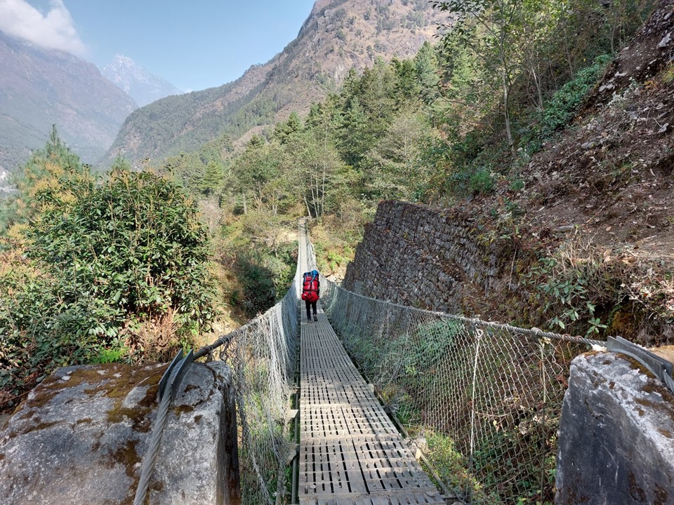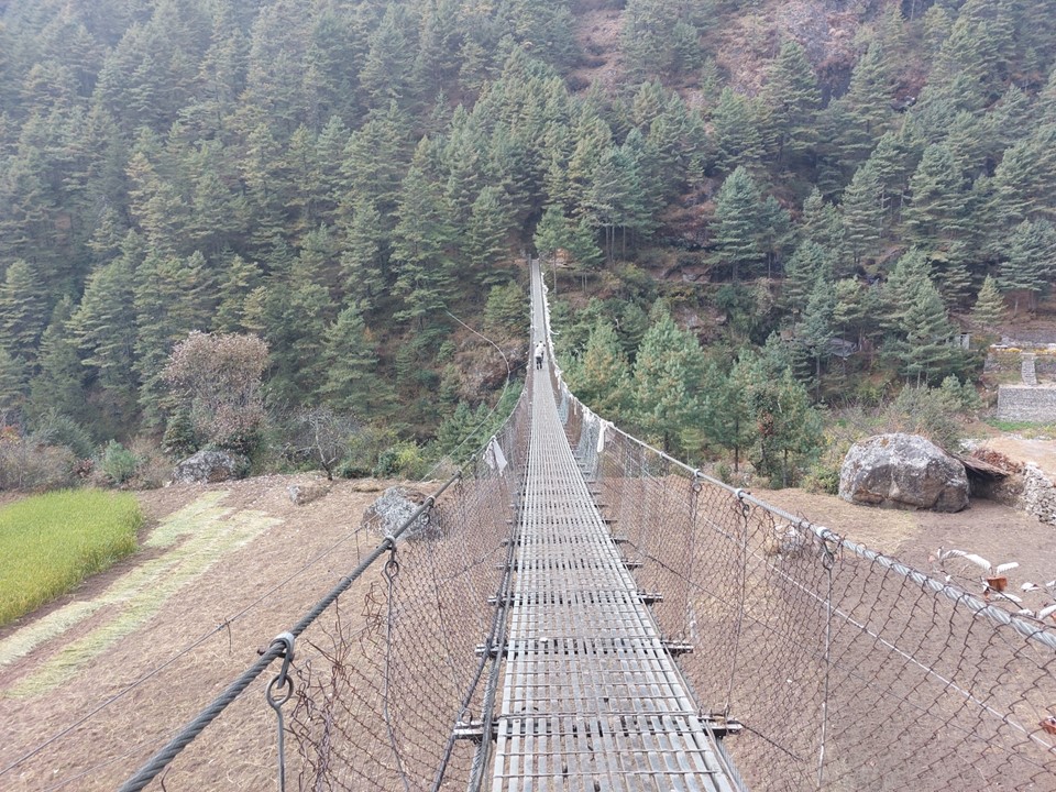 About halfway up the hill, one has to cross one of the most daunting bridges on the trek – the famous Larja Bridge, which is 136m long above a 70m drop. This would usually be the first view of Everest, but with the cloud about, I didn’t expect to see anything. On looking up I would see a peak sticking out through the cloud – which I would later learn is Tabuche, a sacred mountain. Little did I know that this peak that I had never heard of would become one of my favourites over the next few days!