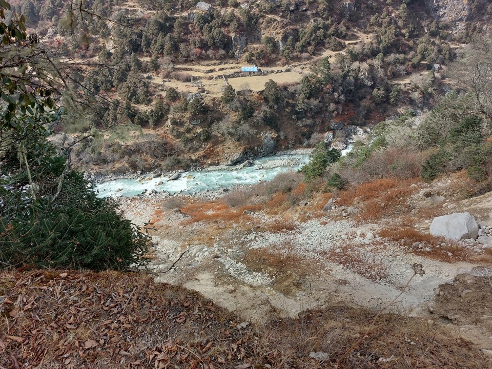 I decided to stop for lunch at one of the tea houses in Tengboche – with a great view from my window. Most other parties would be calling it a day here, but I still had some way to go, including a big downhill followed by another big uphill. Pangboche was my target for the night, both towns are around 3950m, although not on the same side of the river.