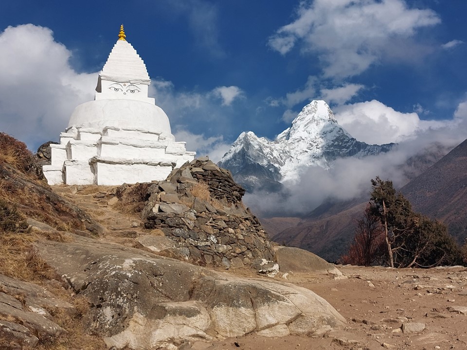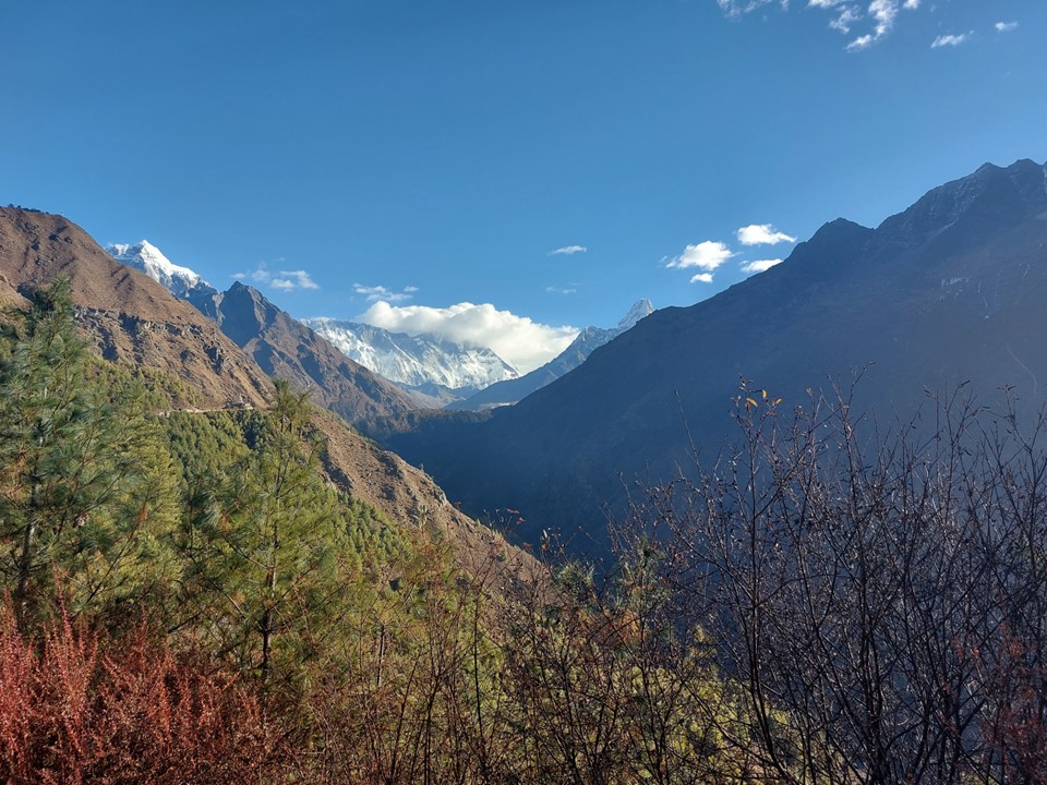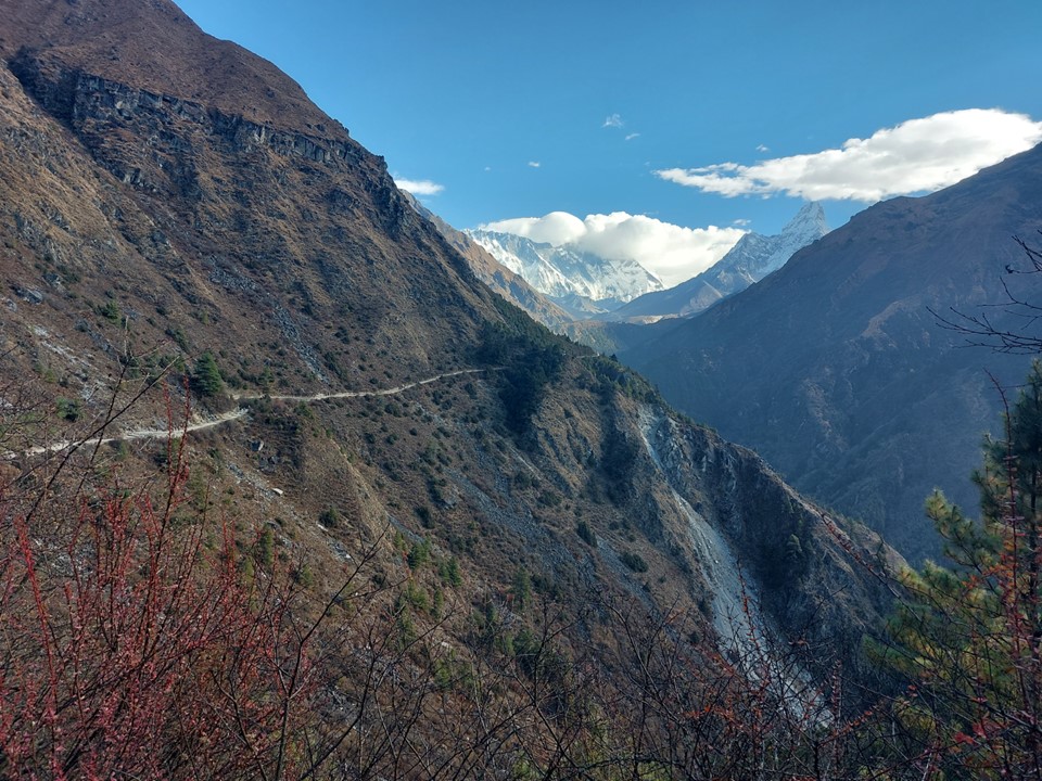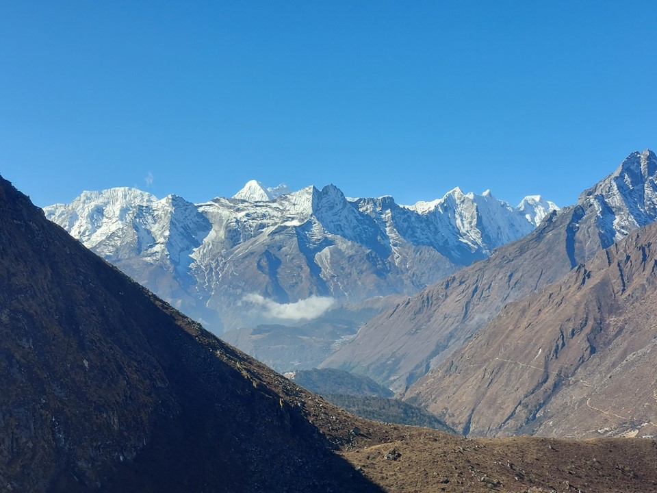 I soon rounded the corner known for the second view of Everest and first view of Ama Dablam. I took this section slowly, wanting to savour the first view of these iconic mountains. Then suddenly – there they were. Well, kind of. On an almost entirely cloudless day, Everest and Lhotse were hiding in the only significant cloud in sight. Go figure!