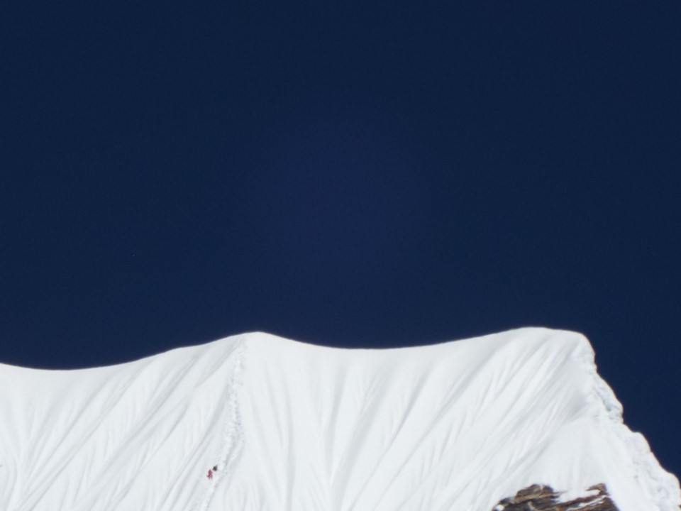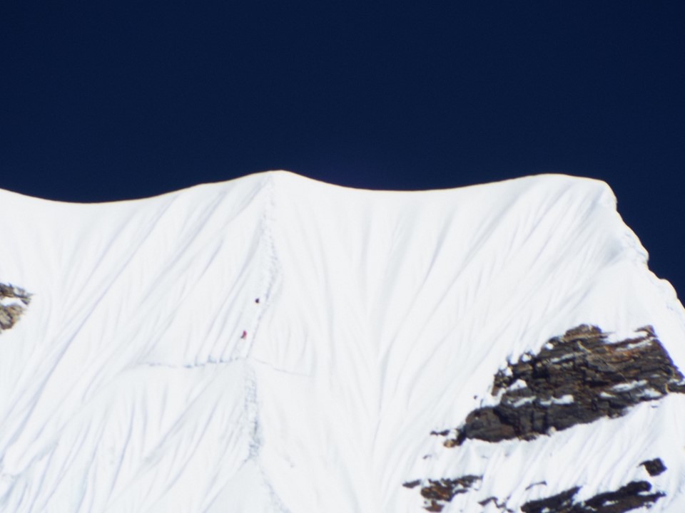 I saw some spots near the top of the mountain, so I pulled out my bridge camera and took a 40x optical zoom shot to see what was visible. As it turns out, there were two climbers on the final approach to the summit.