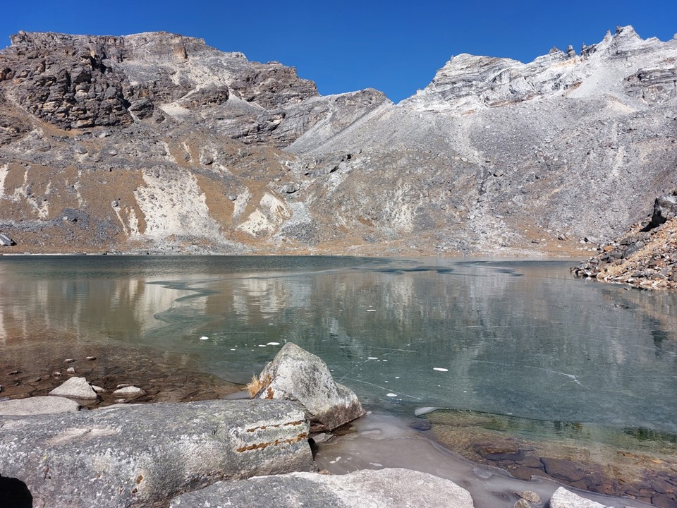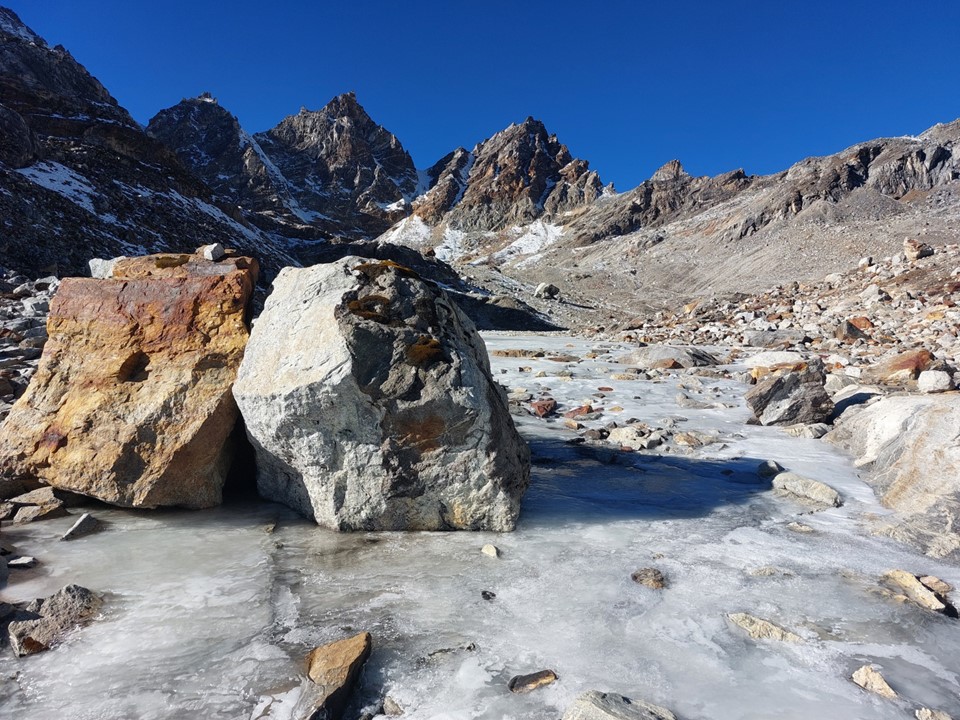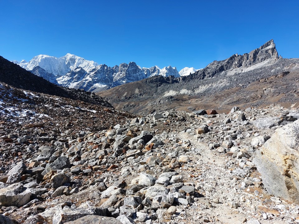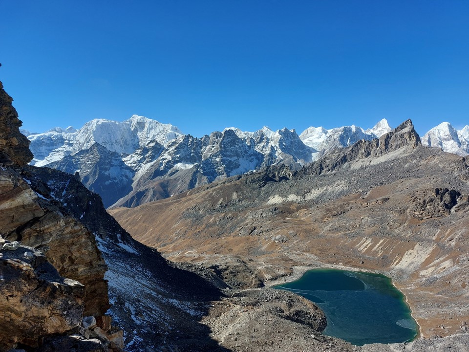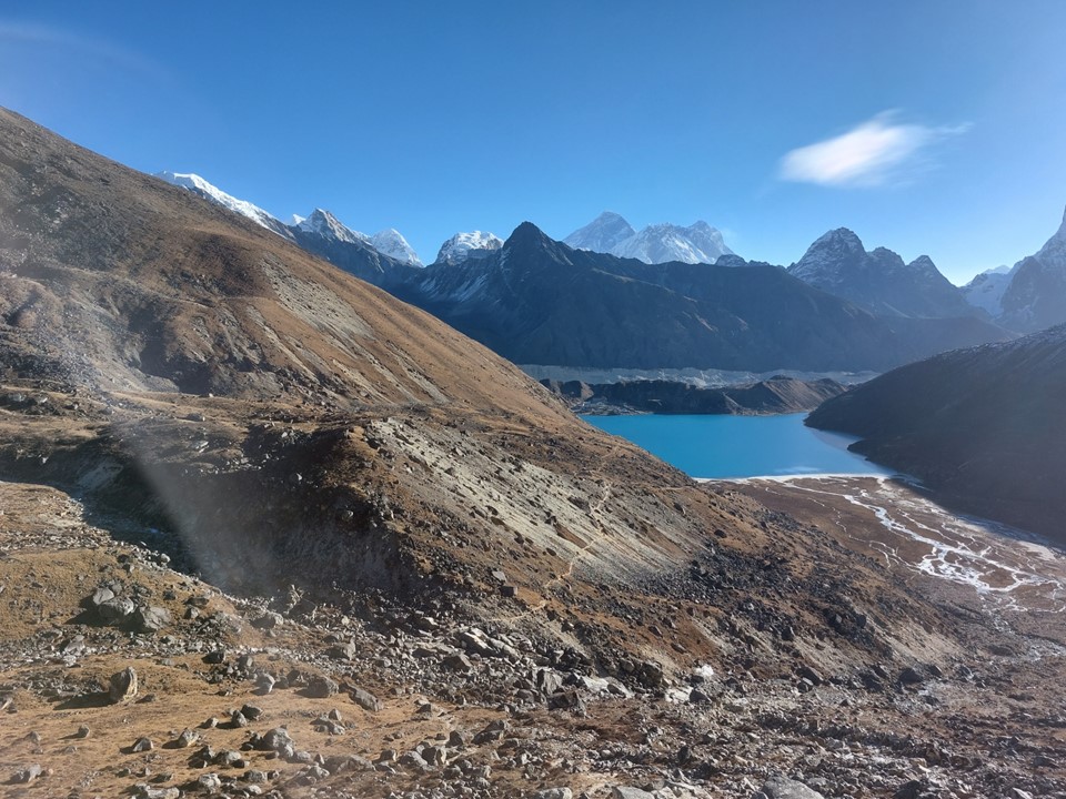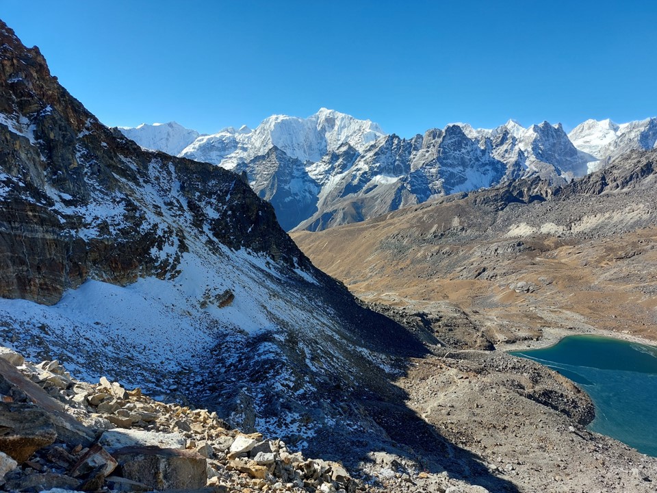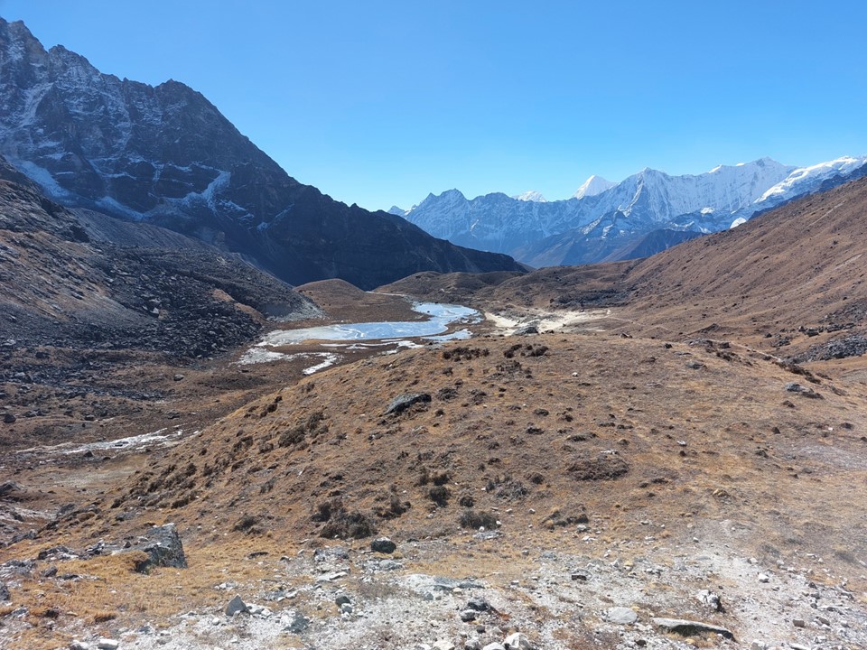 The stream crossing above the lake was frozen, so I had to take care. With Cho Oyu visible in the distance, it was absolutely spectacular.